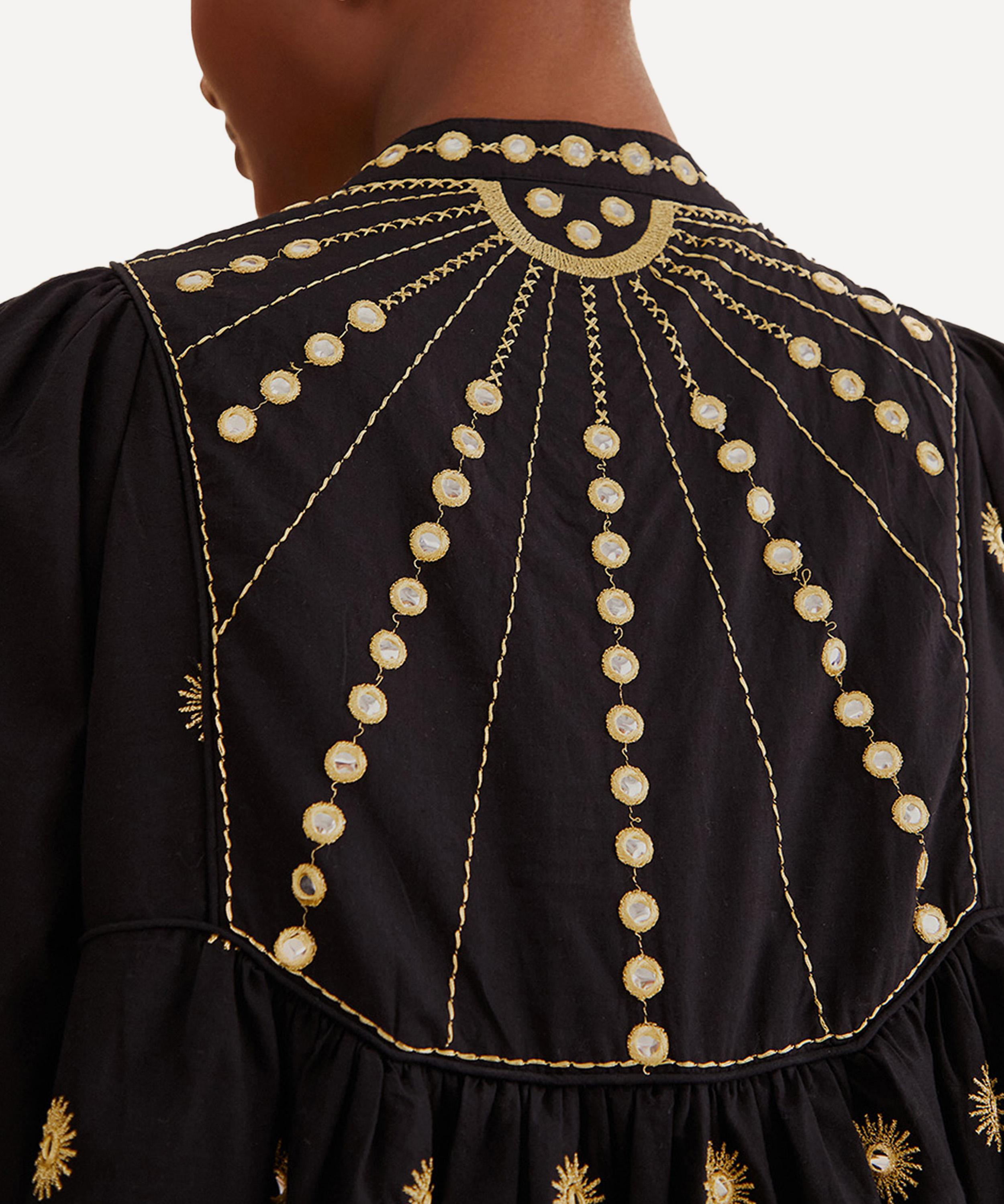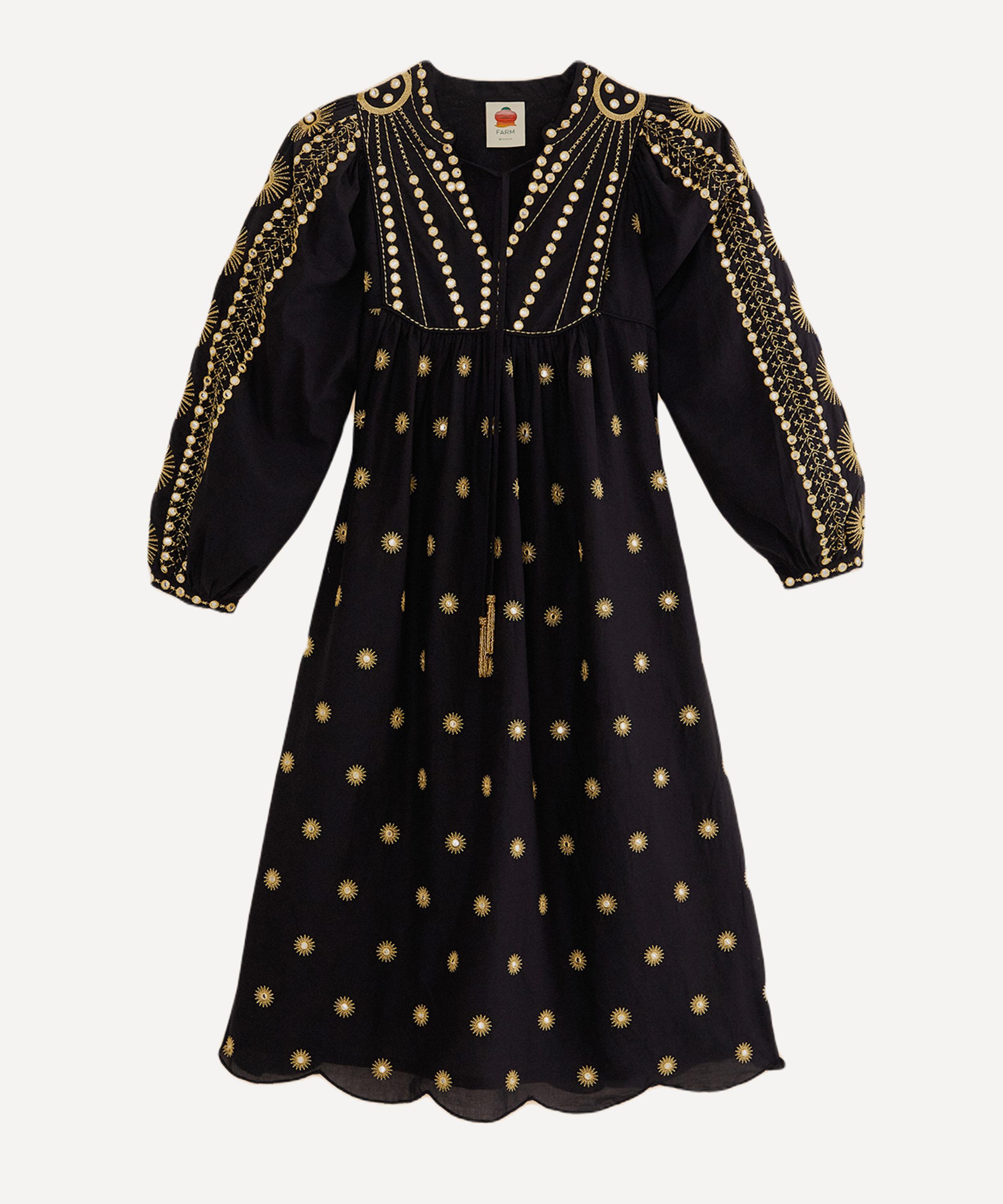 Intricately detailed all-over with gold embroidered suns and shimmering shisha mirrors, this cotton, tunic-style dress has a round neckline secured with beaded tassel ties. Breezy and easy-to-wear, it’s finished with a scallop-edged hem.