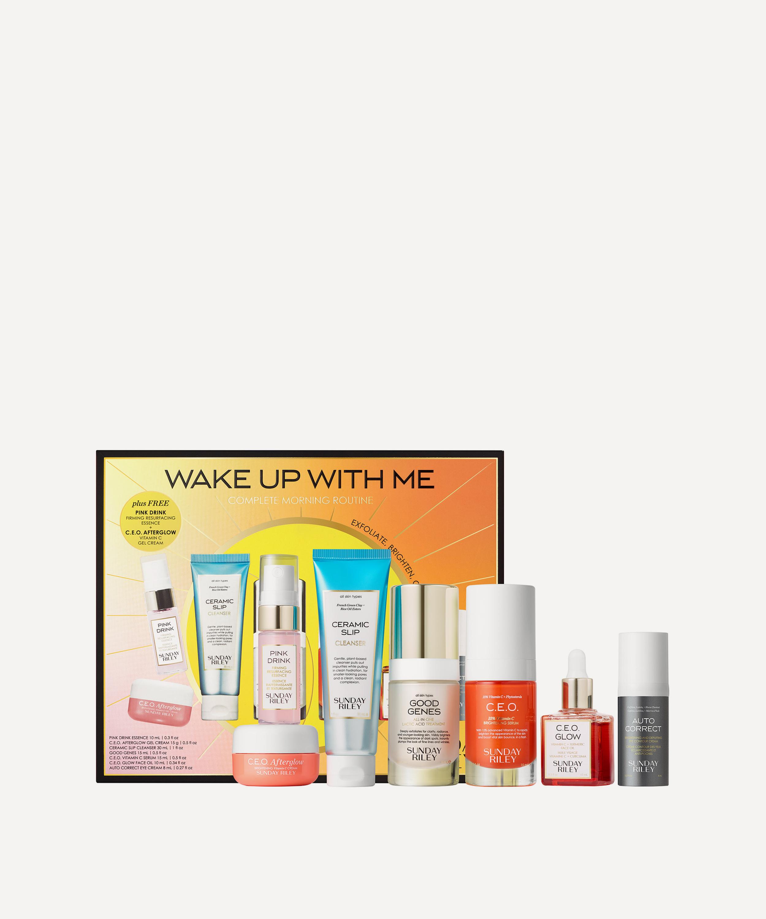 • Wake Up With Me Complete Morning Routine Kit includes: Ceramic Slip Cleanser 30ml, Pink Drink Essence 10ml, C.E.O. 15% Vitamin C Brightening Serum 15ml, C.E.O. Glow Vitamin C + Turmeric Face Oil 10ml, Good Genes Lactic Acid Treatment 15ml, C.E.O. Afterglow Brightening Vitamin C Gel Cream 15g and Auto Correct Eye Cream 8ml
