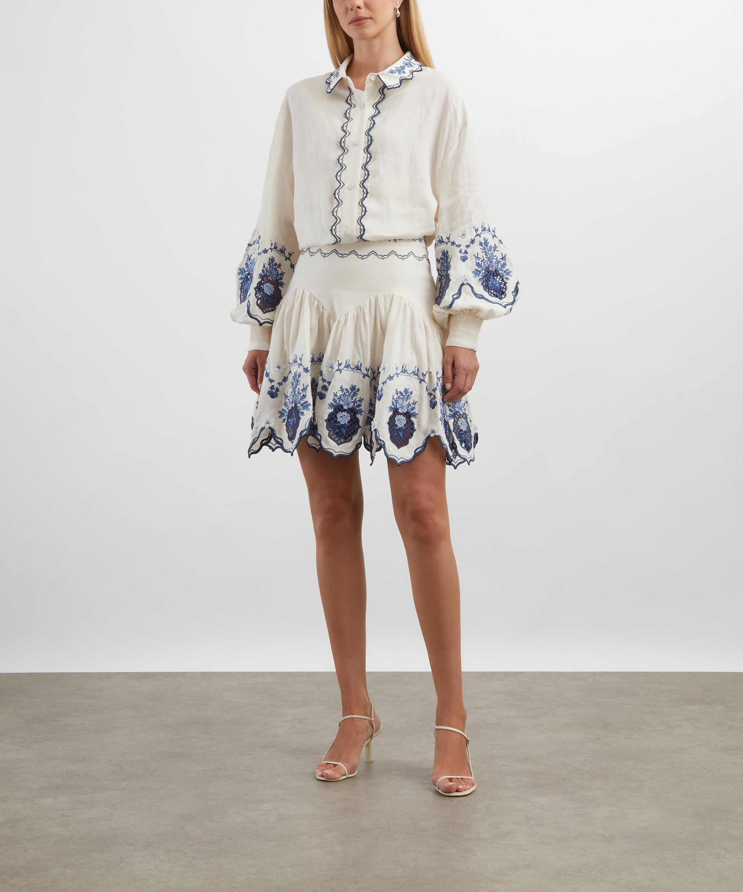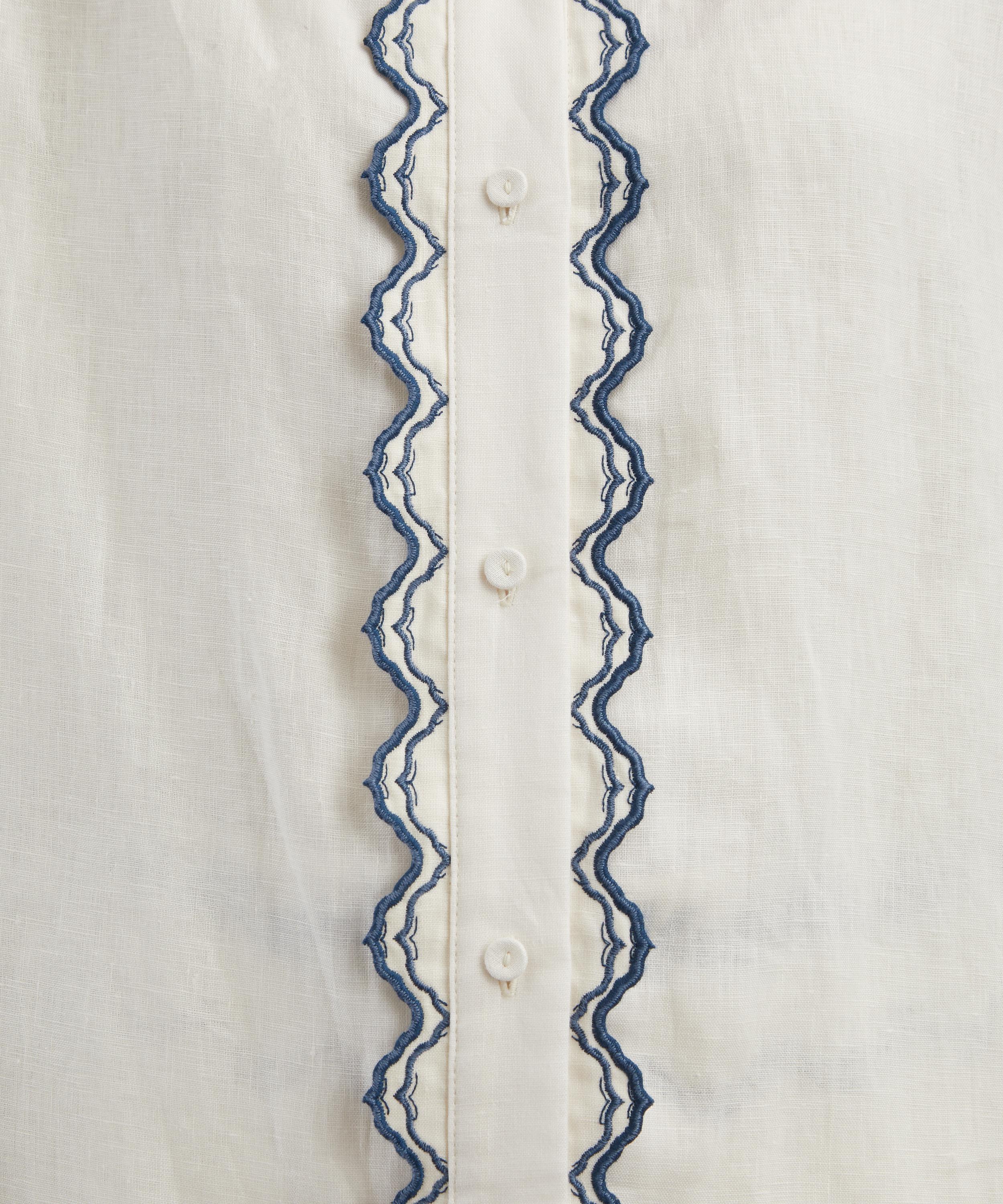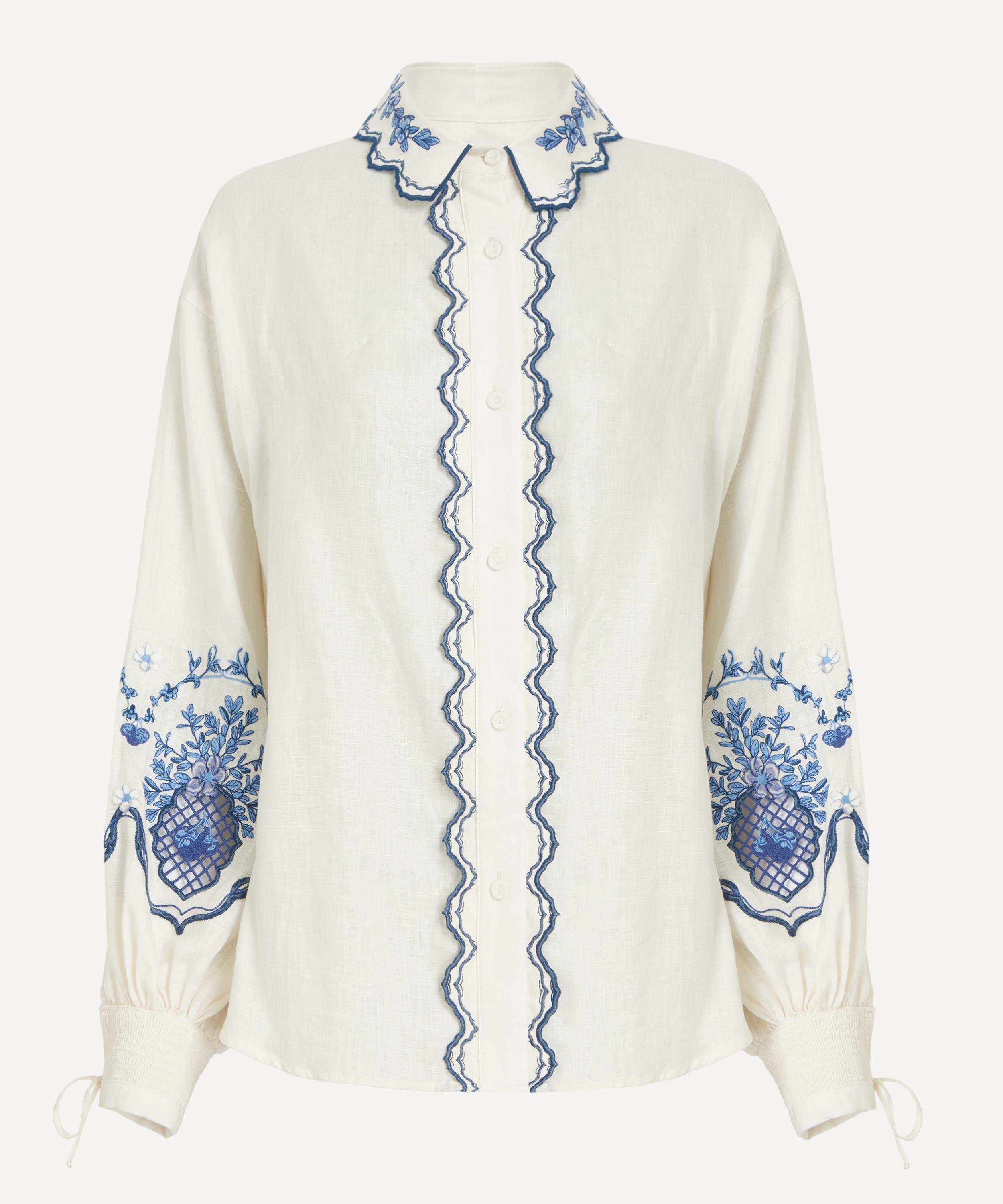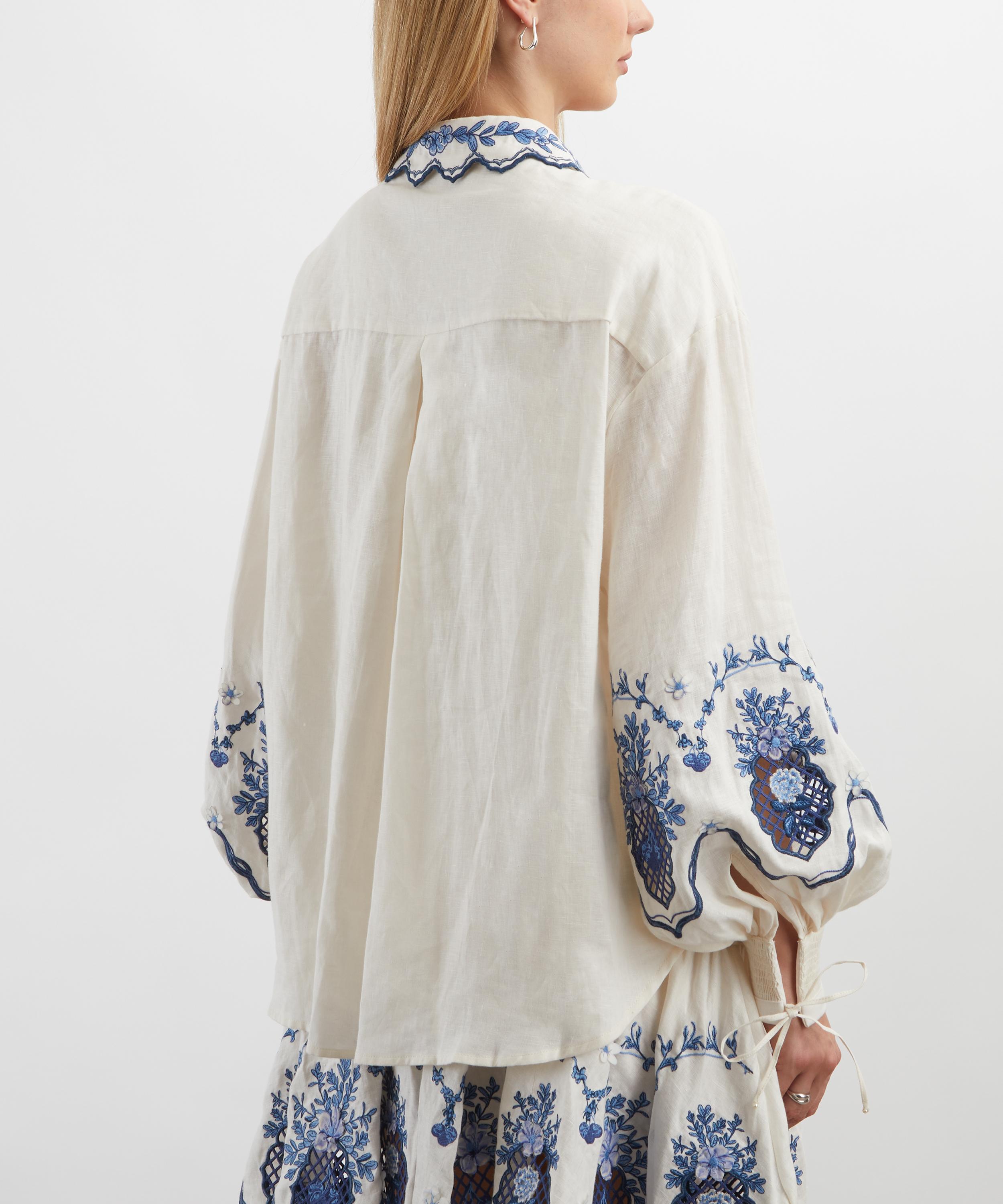 Crafted from airy linen, the Abadia Wild blouse showcases delicate details, including a pie-crust collar, scalloped placket, and voluminous puff sleeves with tied cuffs - all adorned with intricate floral embroidery.