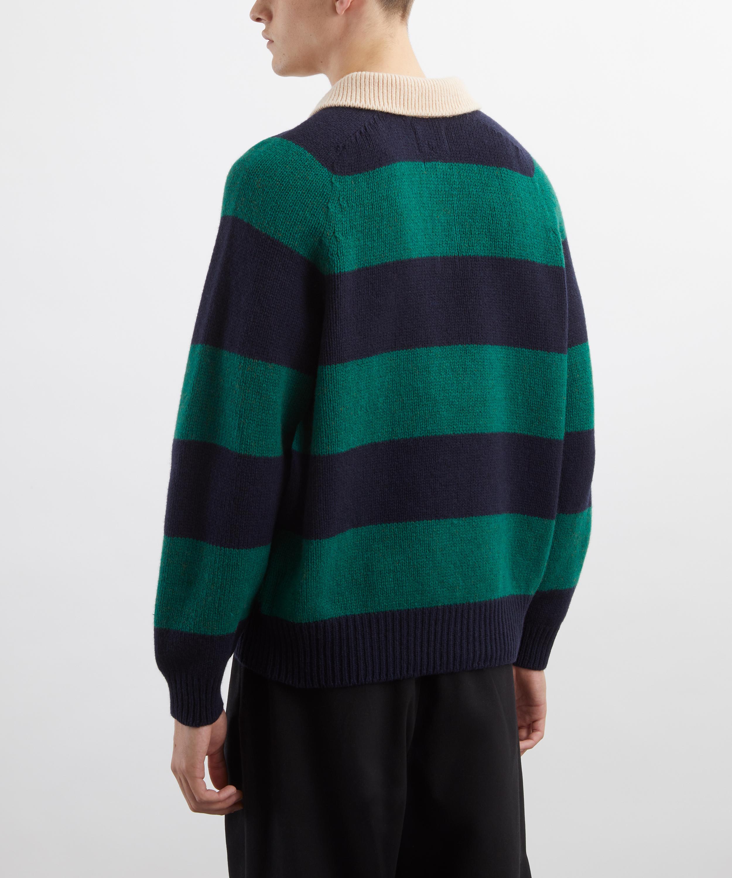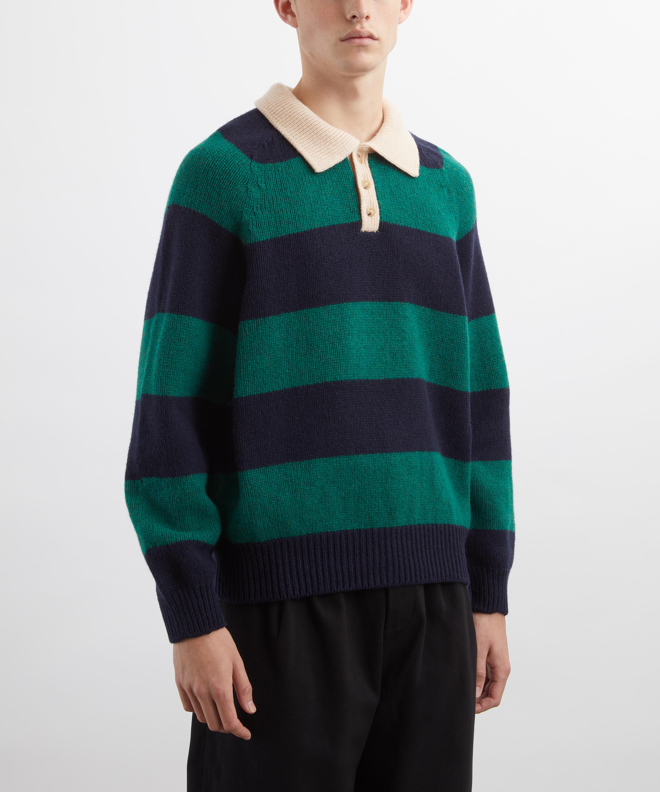 Crafted from pure Scottish lambswool, this striped polo showcases seamless construction, long raglan sleeves, and a flat-knit collar with a partial button placket — a timeless blend of comfort and craftsmanship.