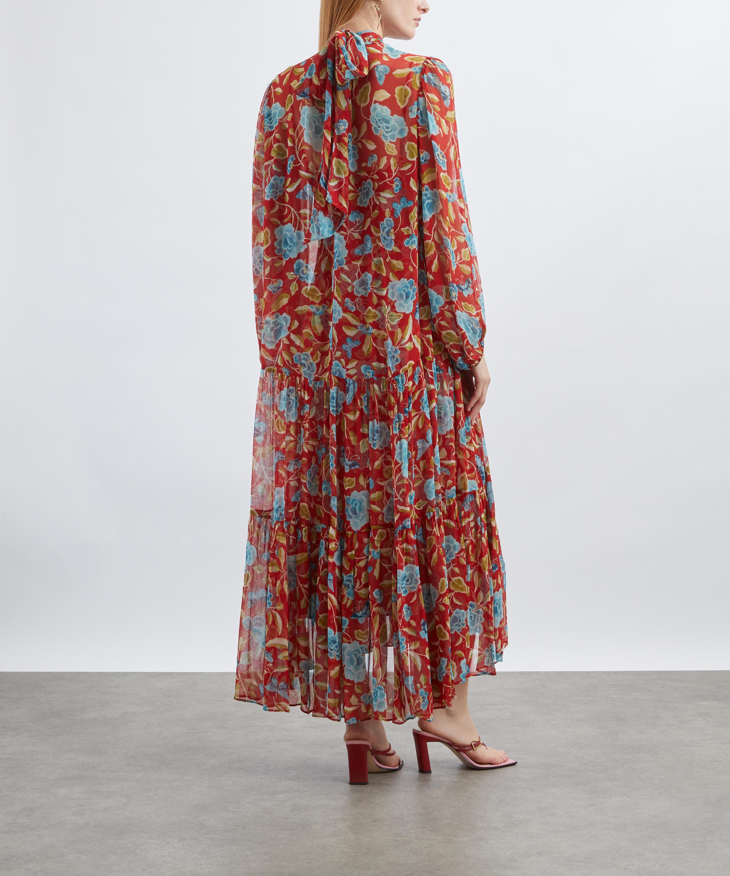 Romantic and relaxed with a touch of bohemian glamour, the Adalind dress is crafted from crinkled chiffon and printed with a vintage-inspired butterfly floral motif. Effortlessly flattering, it features a high neckline with pussybow ties, long blouson sleeves, and a dropped waist that flows into a loose and floaty midi skirt.