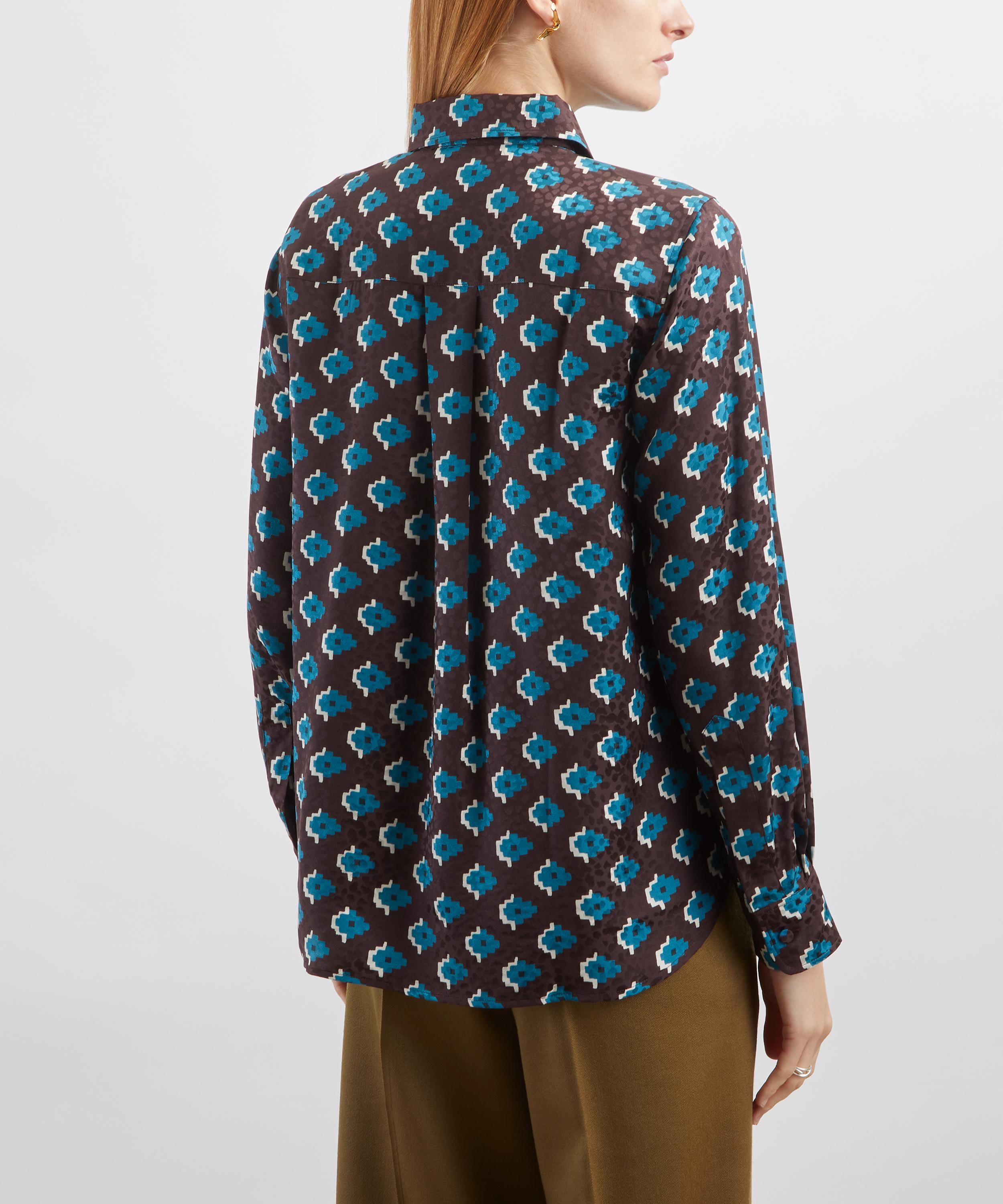 Crafted from silk jacquard, this sleek shirt is adorned with our Adamas print. Discovered as a tiny fabric fragment in the Liberty archive, this neatly arranged geometric pattern is reminiscent of traditional Central Asian or Middle Eastern kilim motifs. Featuring a grid of angular diamond shapes, the design’s simplicity and repetition creates bold shadow contrasts and a strong, graphic presence.