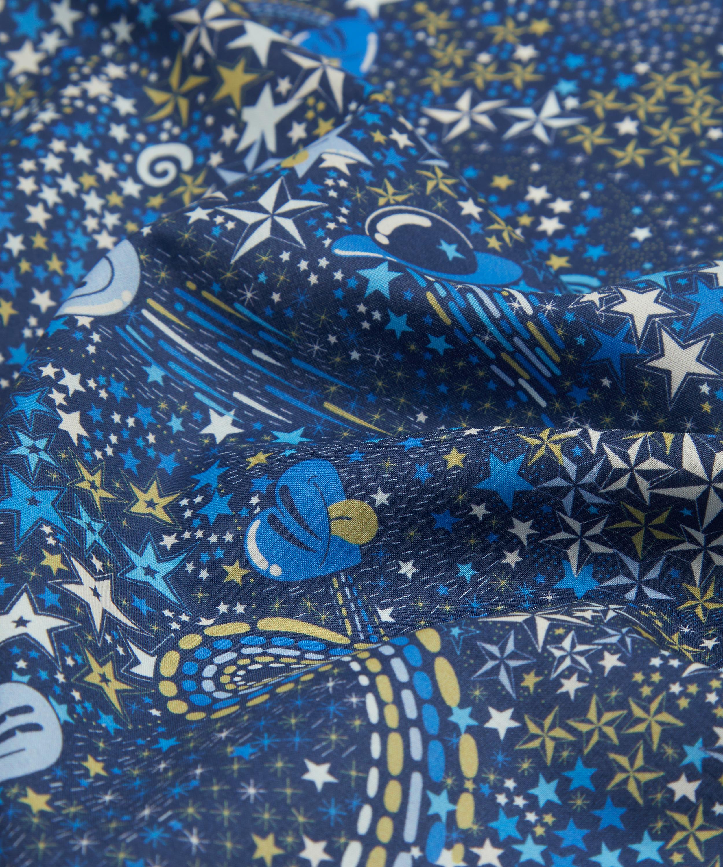 Originally created by the Liberty studio in 2010, this magical pattern has been given a playful makeover with the addition of Hattie Stewart’s quirky illustrations. Twinkling galaxies and swirling stars are interrupted by cheeky characters, flying UFO’s, and even curious eyes staring into space. This print is part of the Floral Wonderland narrative of the AW24 collection, which celebrates a world of never-before-seen species and hybrid varieties created from the Designer’s imagination – a real carnival of nature.