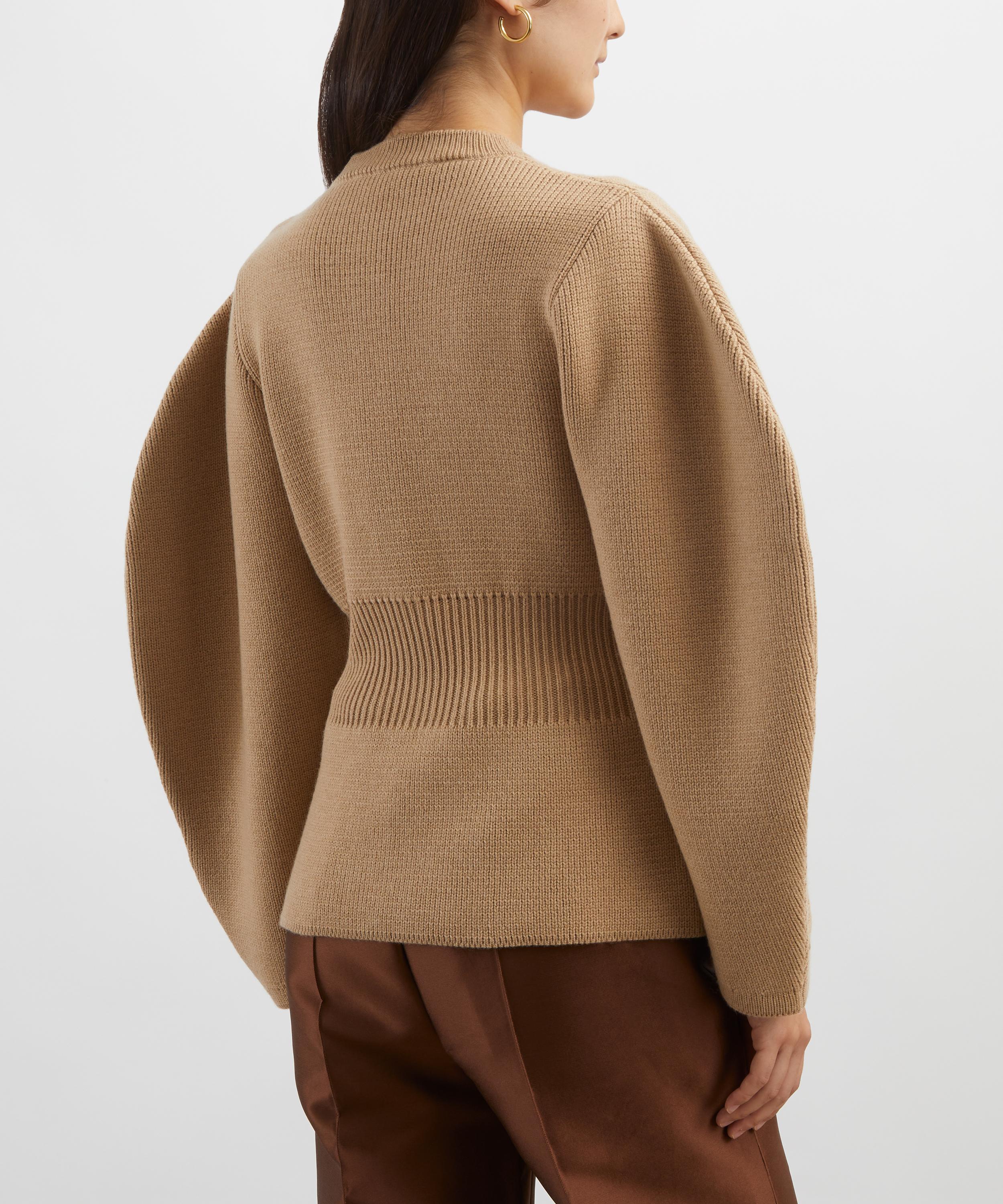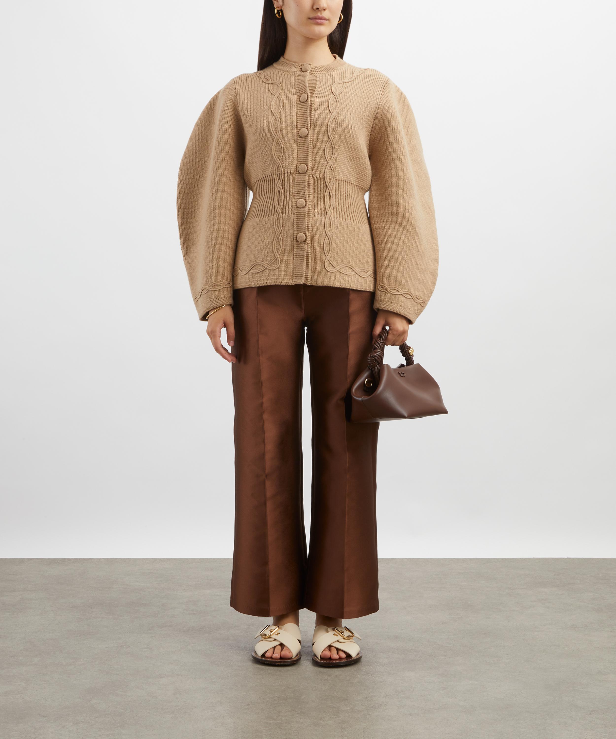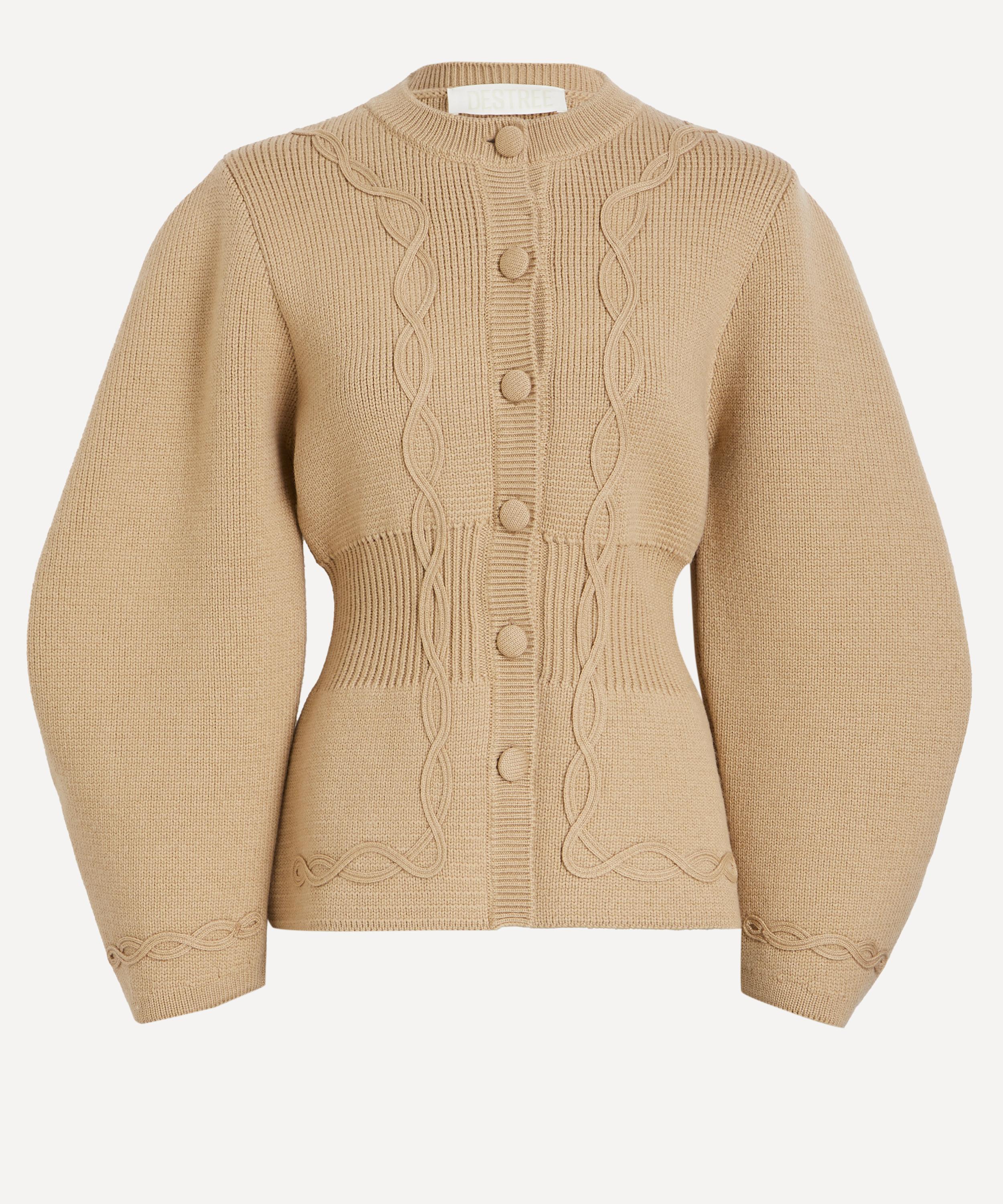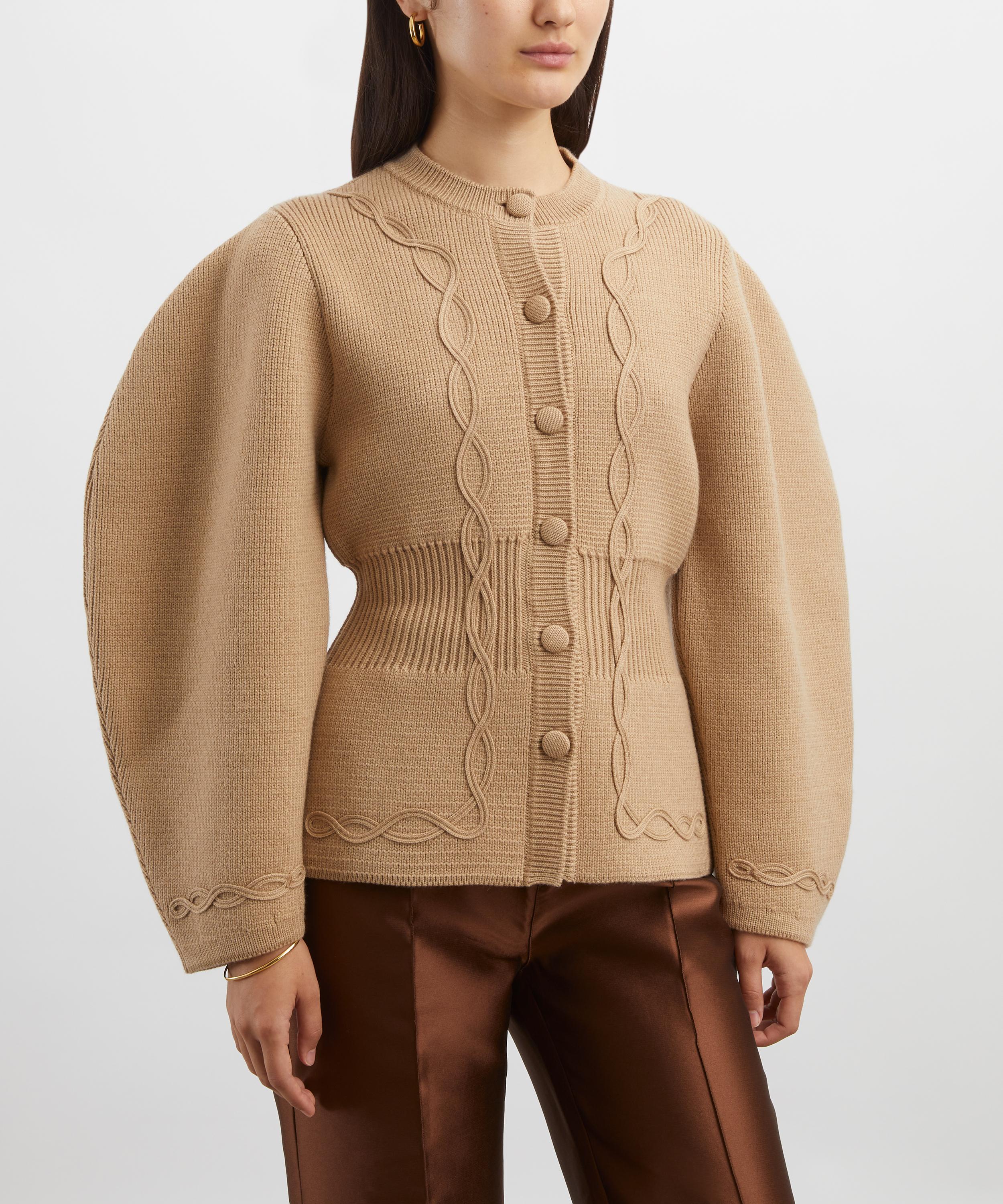 Effortlessly elegant in waffle-stitched Merino wool, the Adrian cardigan features a cinched, rib-knit waist, voluminous balloon sleeves, and embroidered accents.