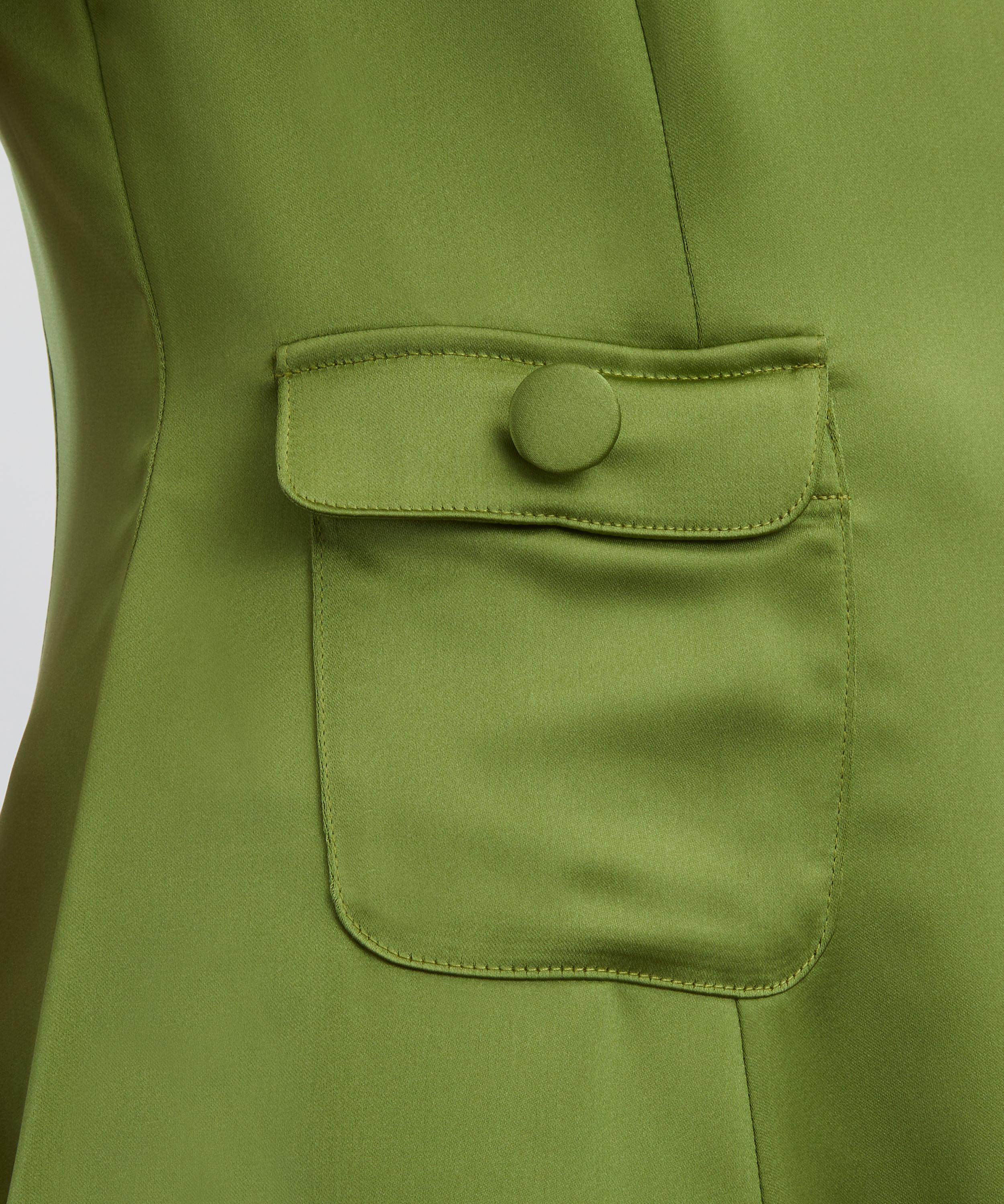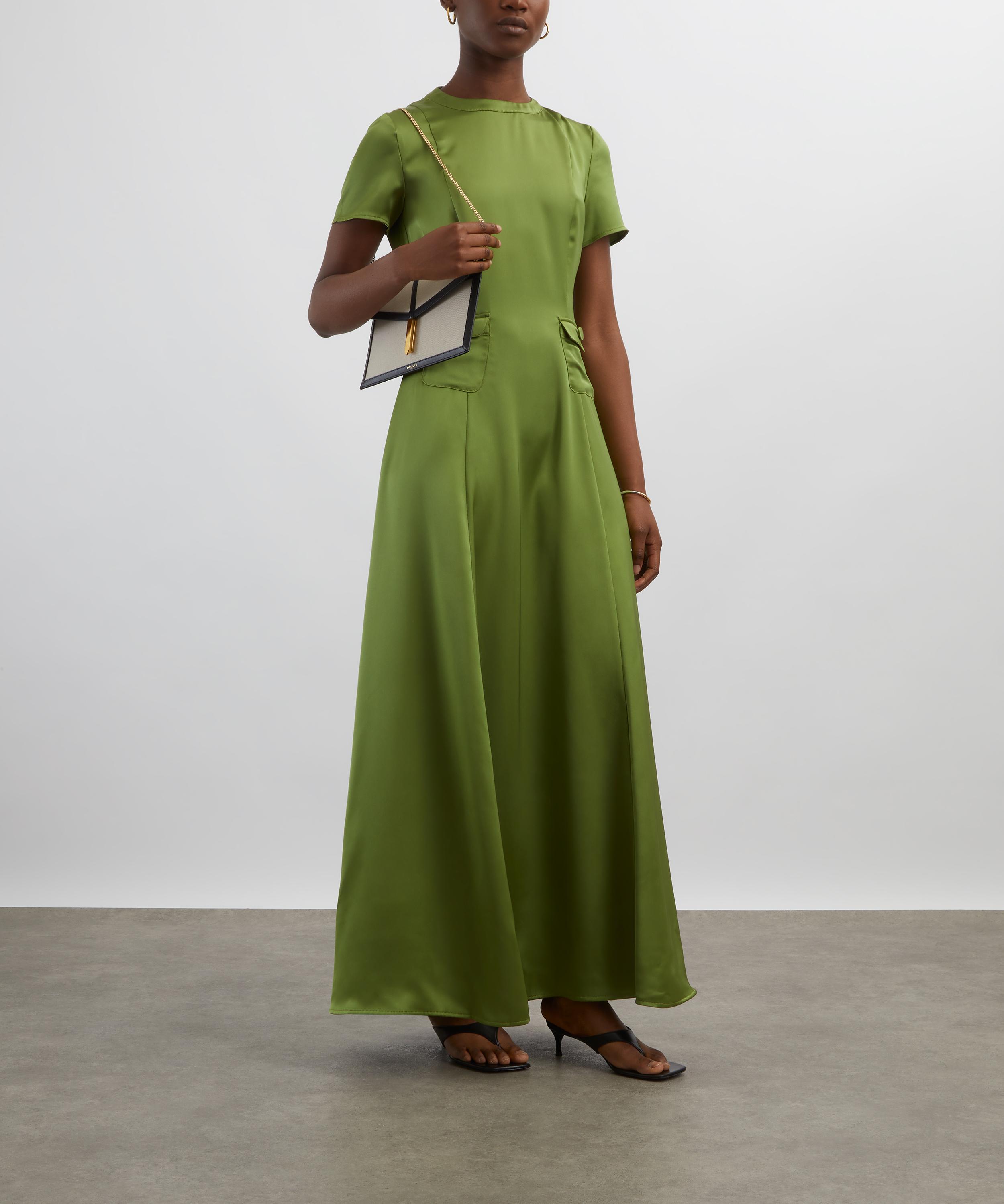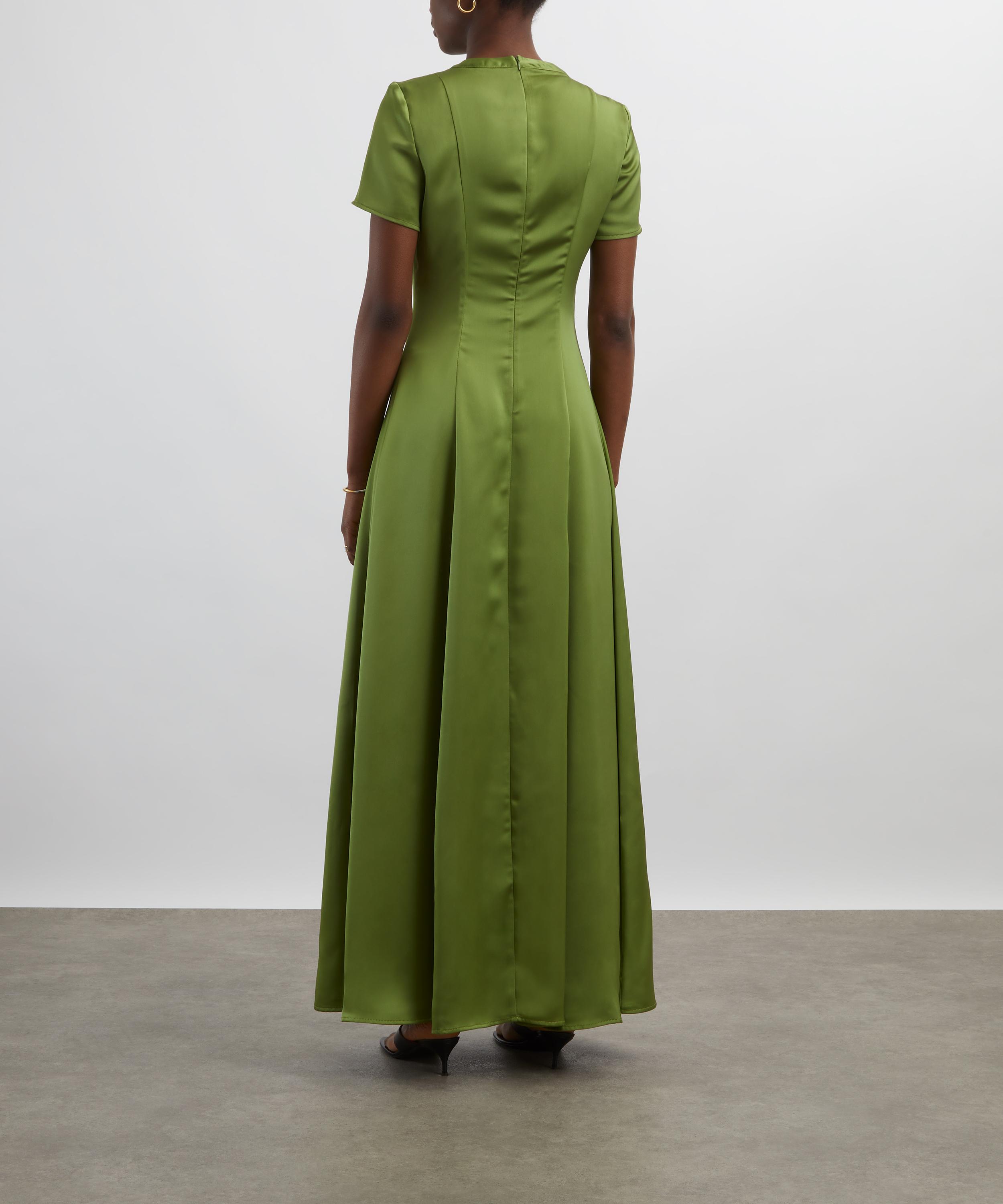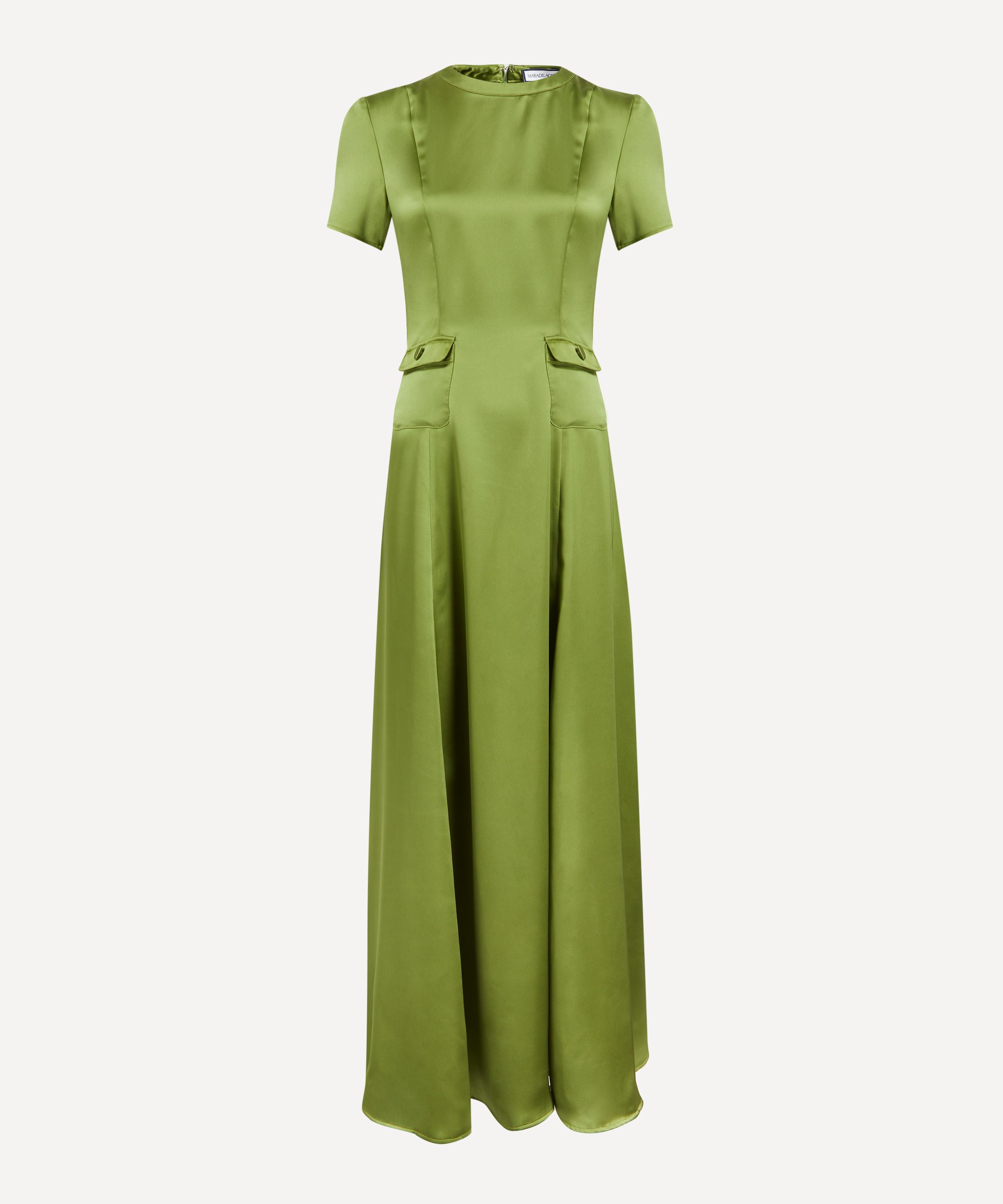Crafted from sleek olive satin, the Albane dress exudes effortless elegance. Cinched at the waist with a flowing skirt that reached the ankle, it features short sleeves and two small front flap pockets for a chic, yet practical finish.