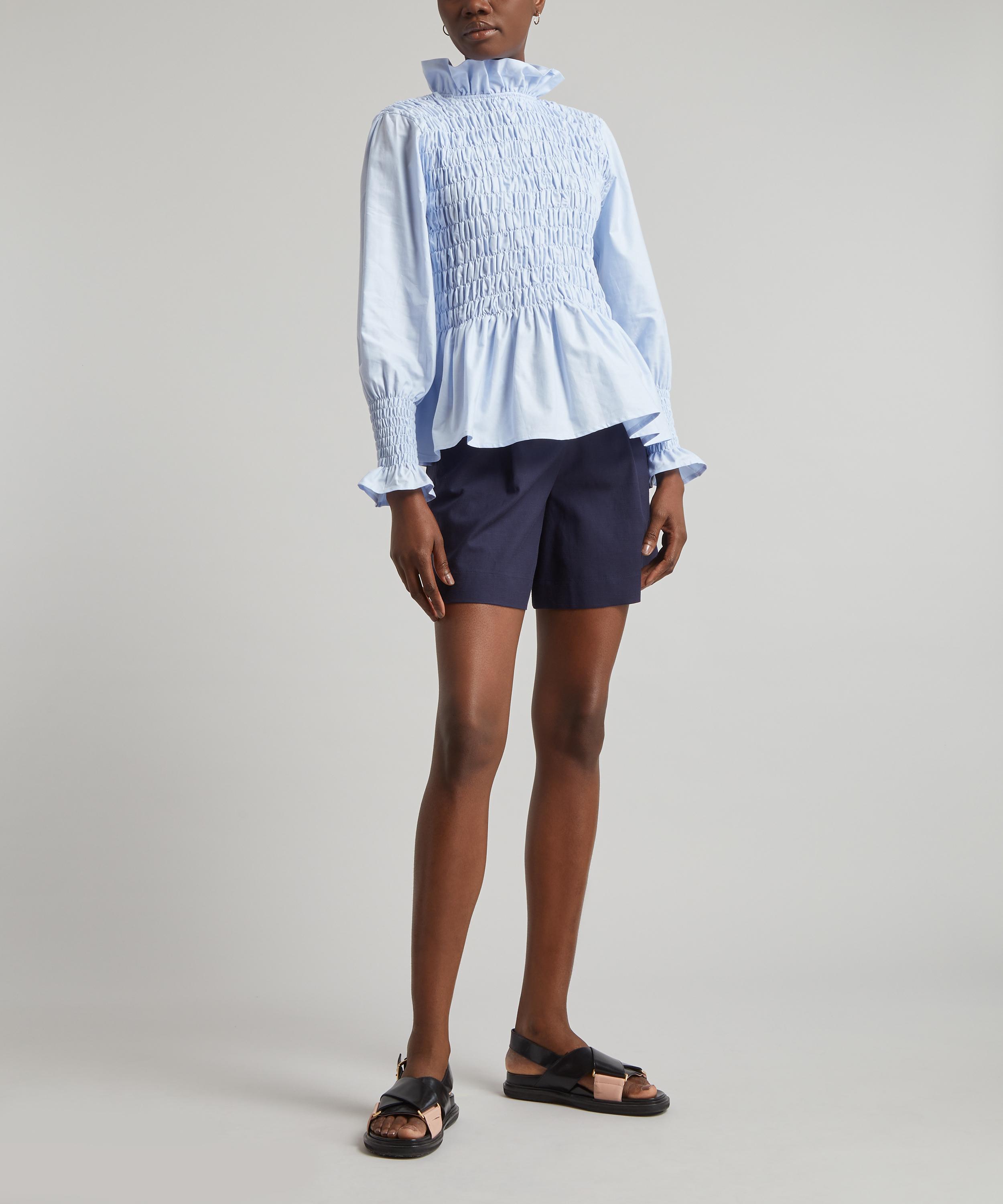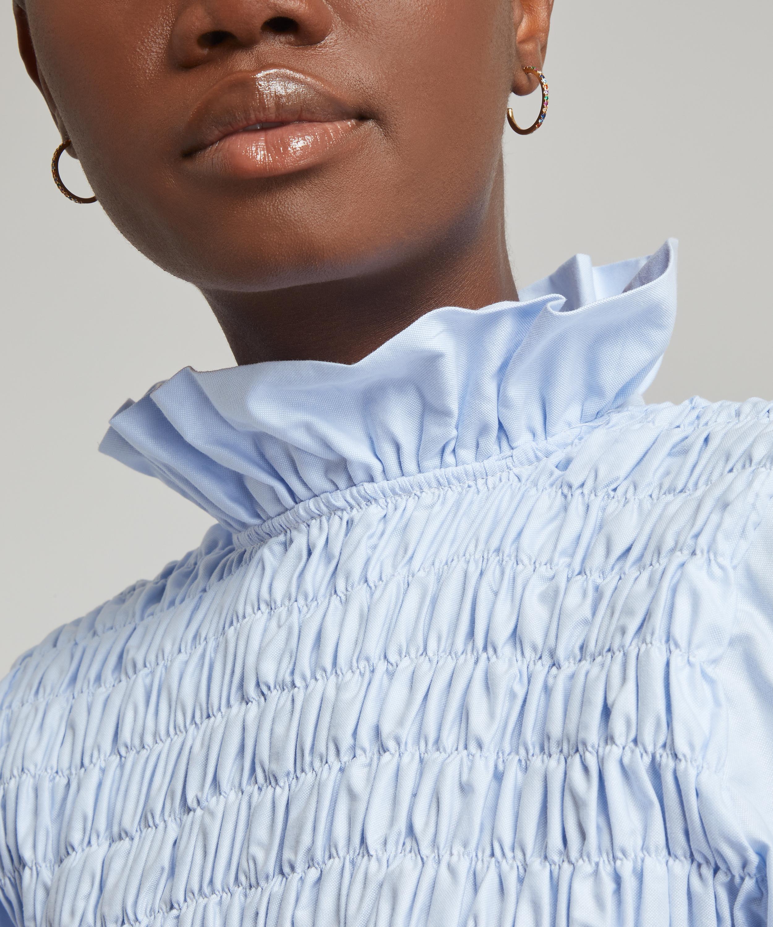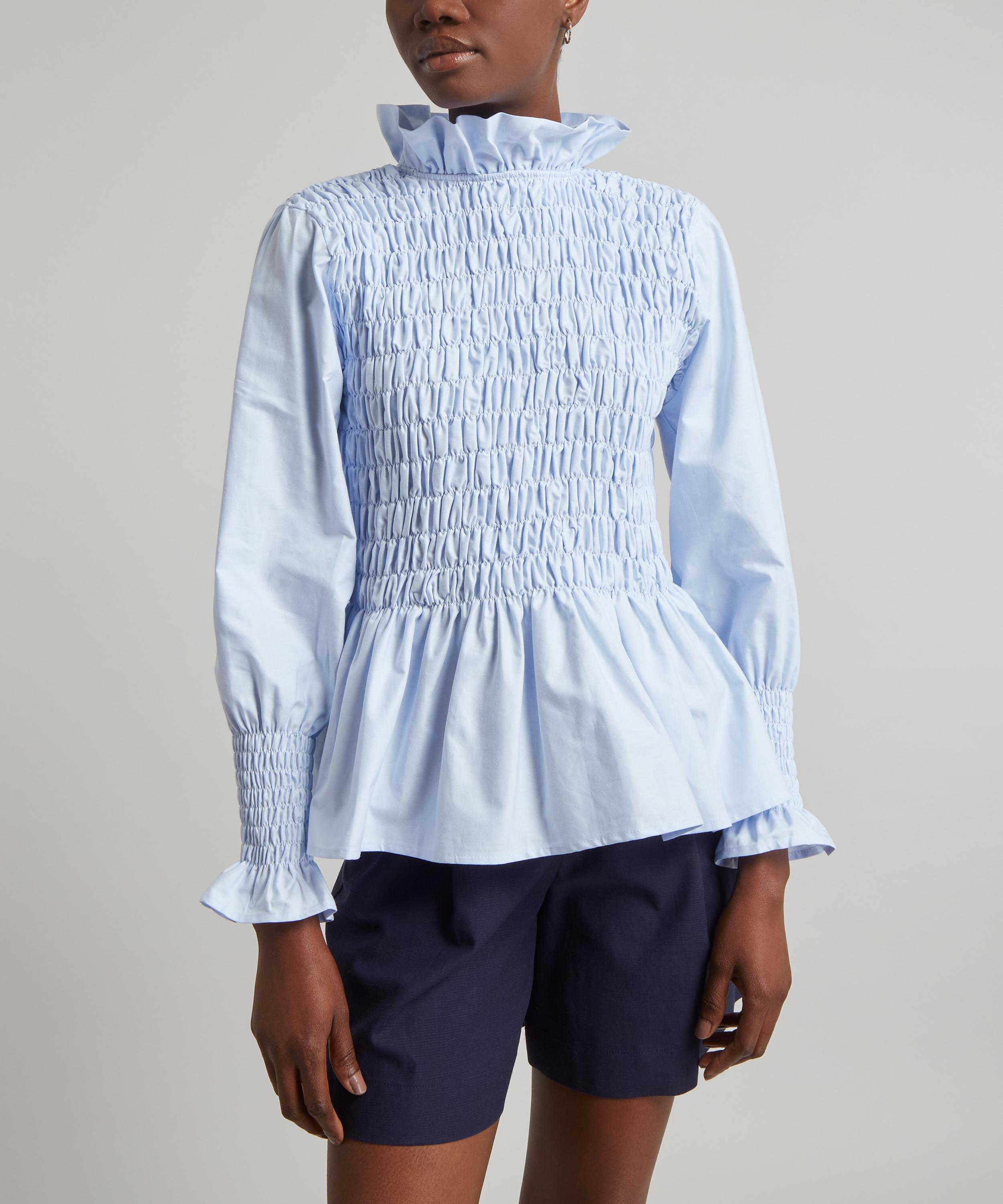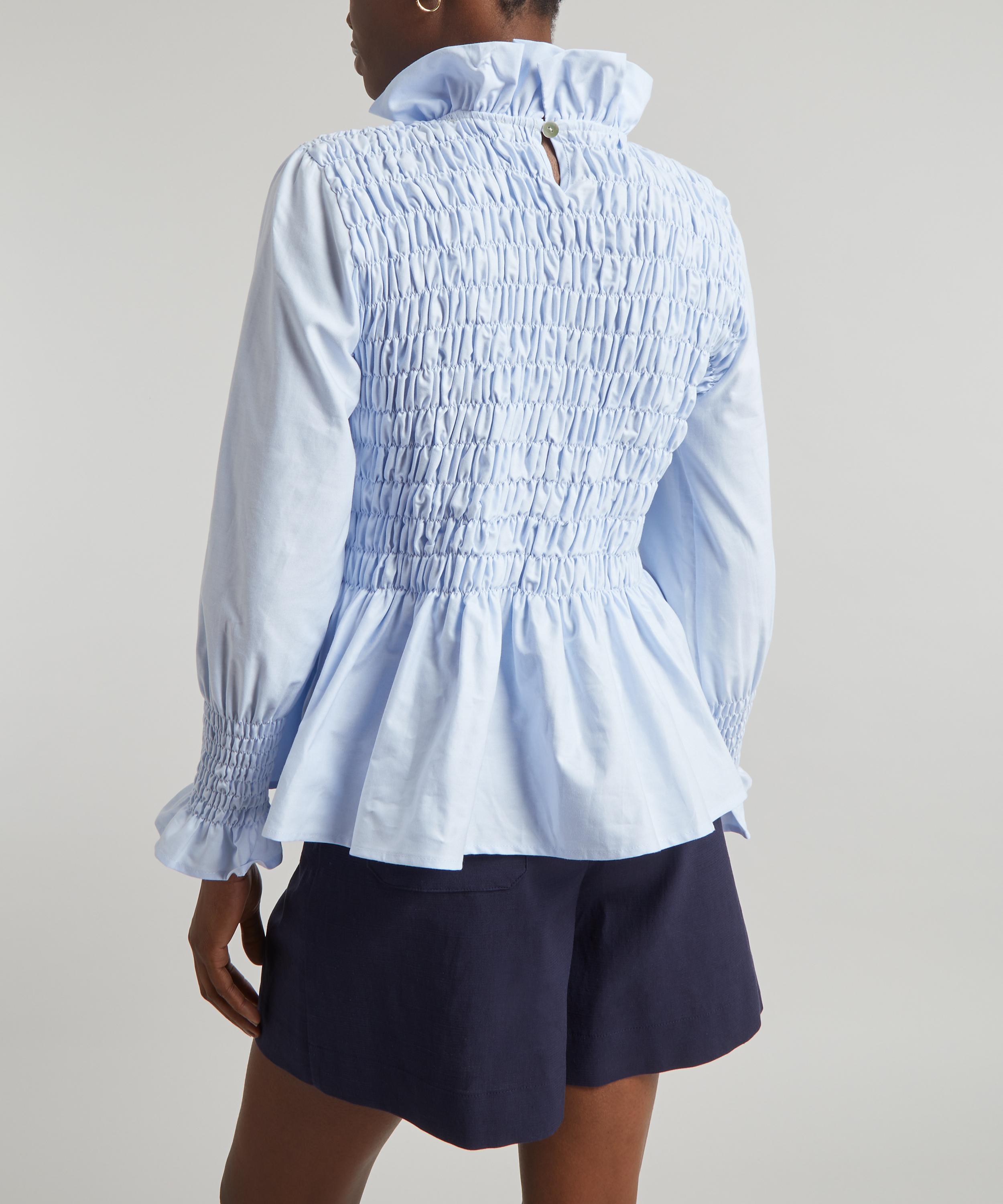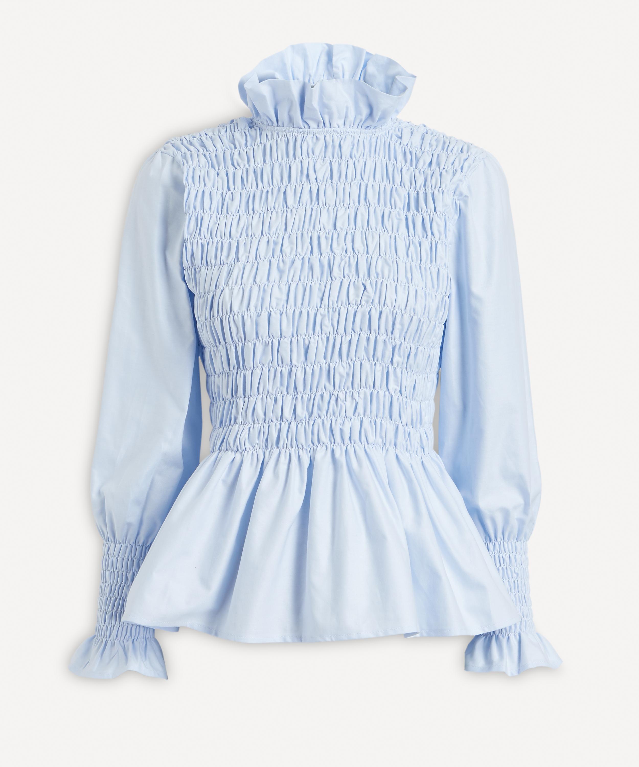 A signature style from Maria de la Orden, the Aleria shirt is an elegant and easy to wear style with its delicate ruffle embellished collar and cuffs. Crafted from cotton for a lightweight and airy feel, the Aleria is expertly tailored to a slim-fit with its figure-forming ruched bodice, complete with a ruffled hem and dramatic puffed sleeves for an overall, voluminous silhouette. Simply team this baby-blue blouse with navy shorts for a tonal finish to your off-duty edit.