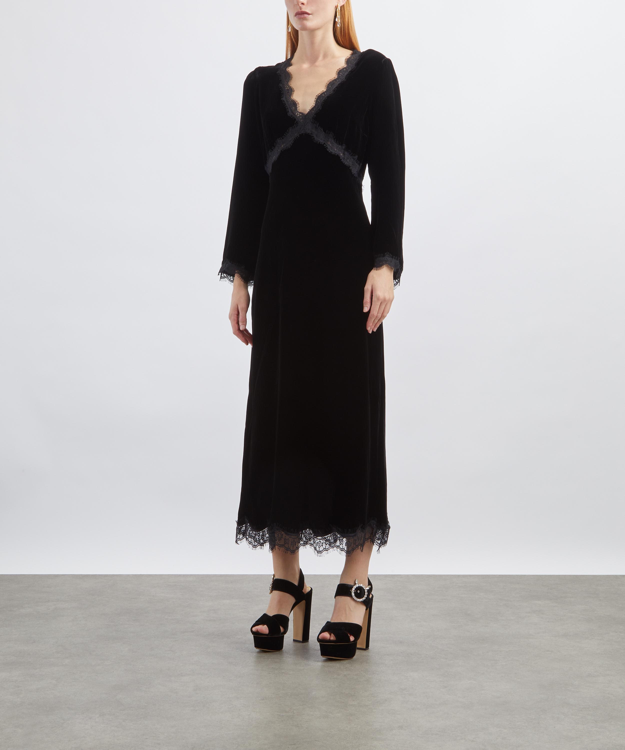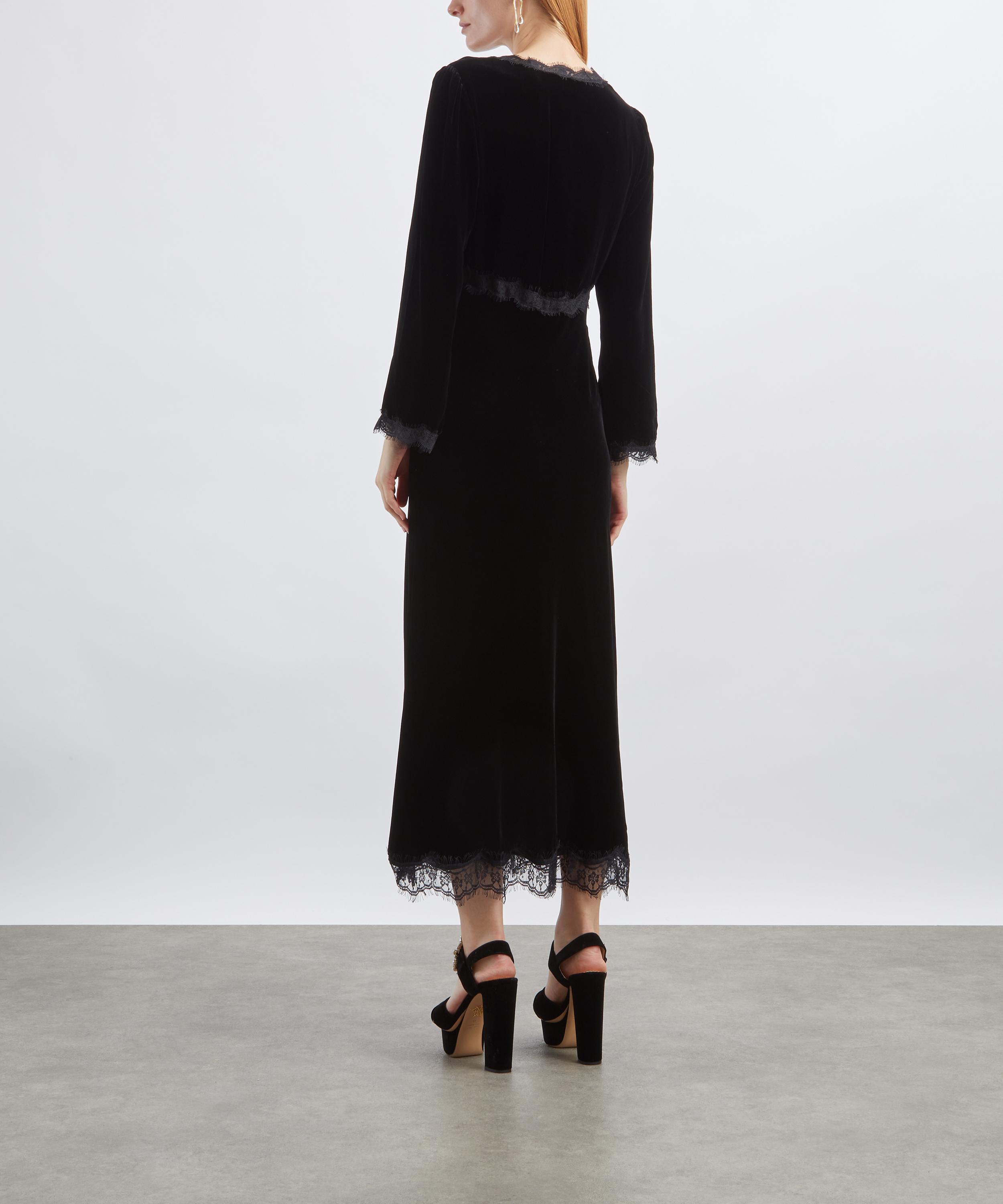 Blending boho glamour with dark romanticism, the Alessi dress is crafted from plush silk velvet and finished with delicate lace detailing throughout. Designed to flatter effortlessly, it features a classic V-neckline and an elegant empire waist that flows into a relaxed, free-moving midi length.