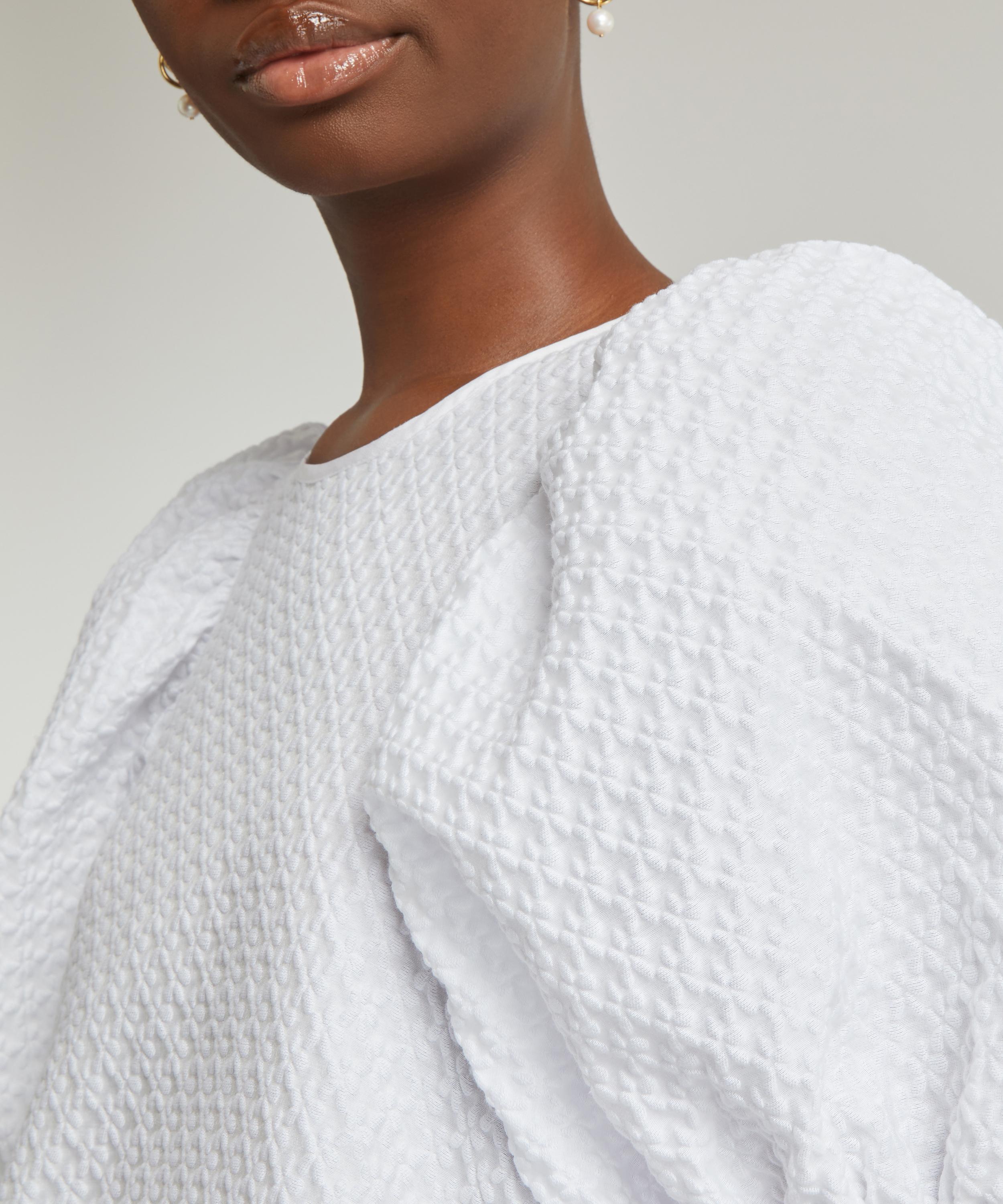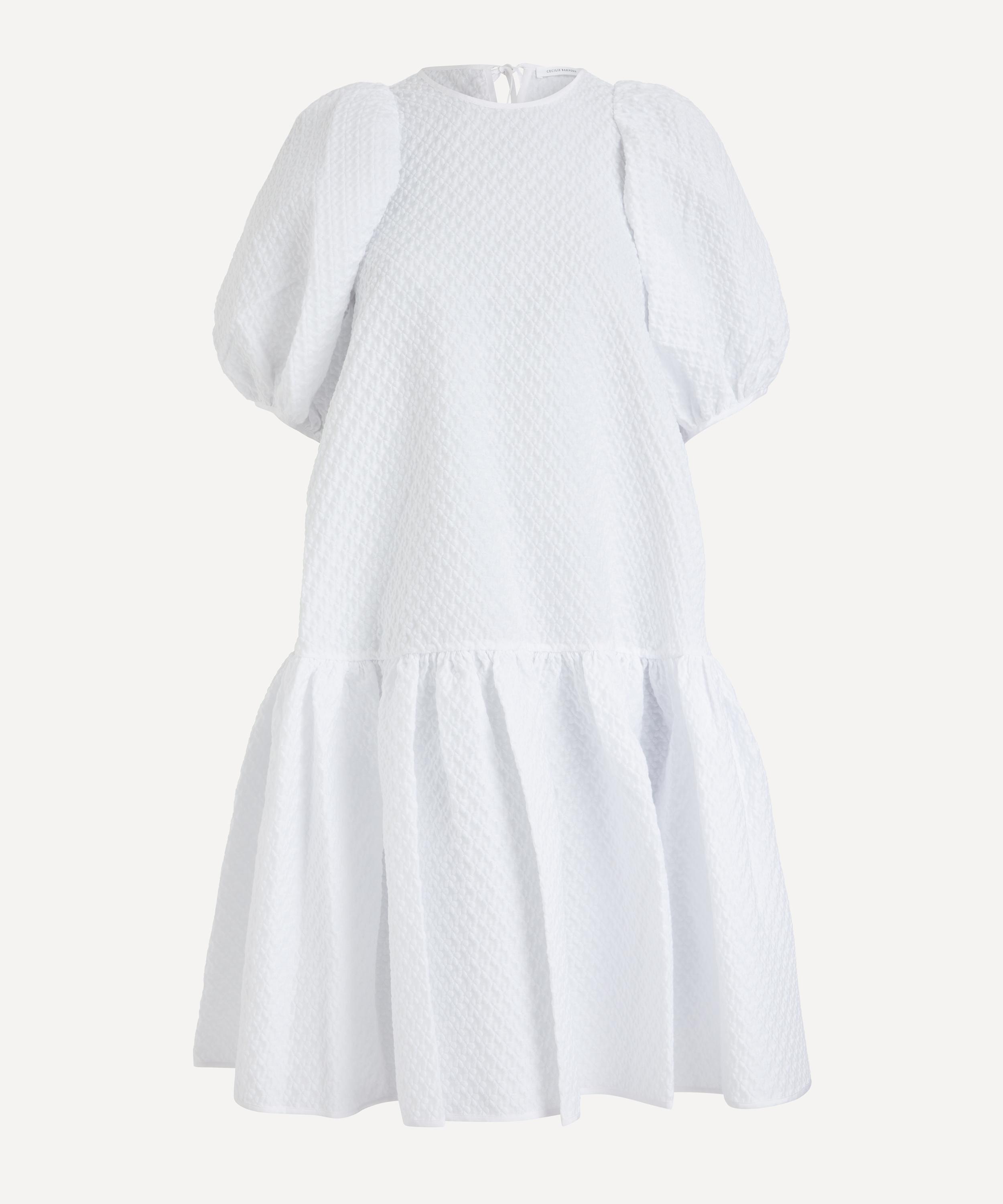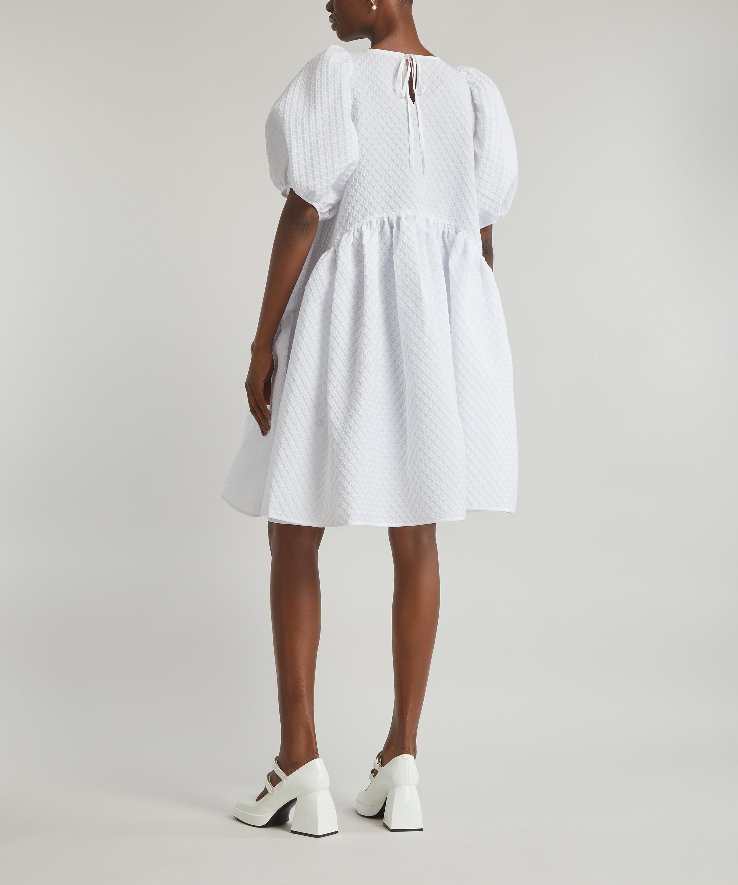 The Alexa dress from Cecilie Bahnsen embodies the designer’s alluring aesthetic for whimsical silhouettes with a sculptural edge. A studied take on feminine volume with its puff-sleeves, raised skirt and gathered, peplum-hem, it’s crafted from blossom matelassé for a tactile finish.
