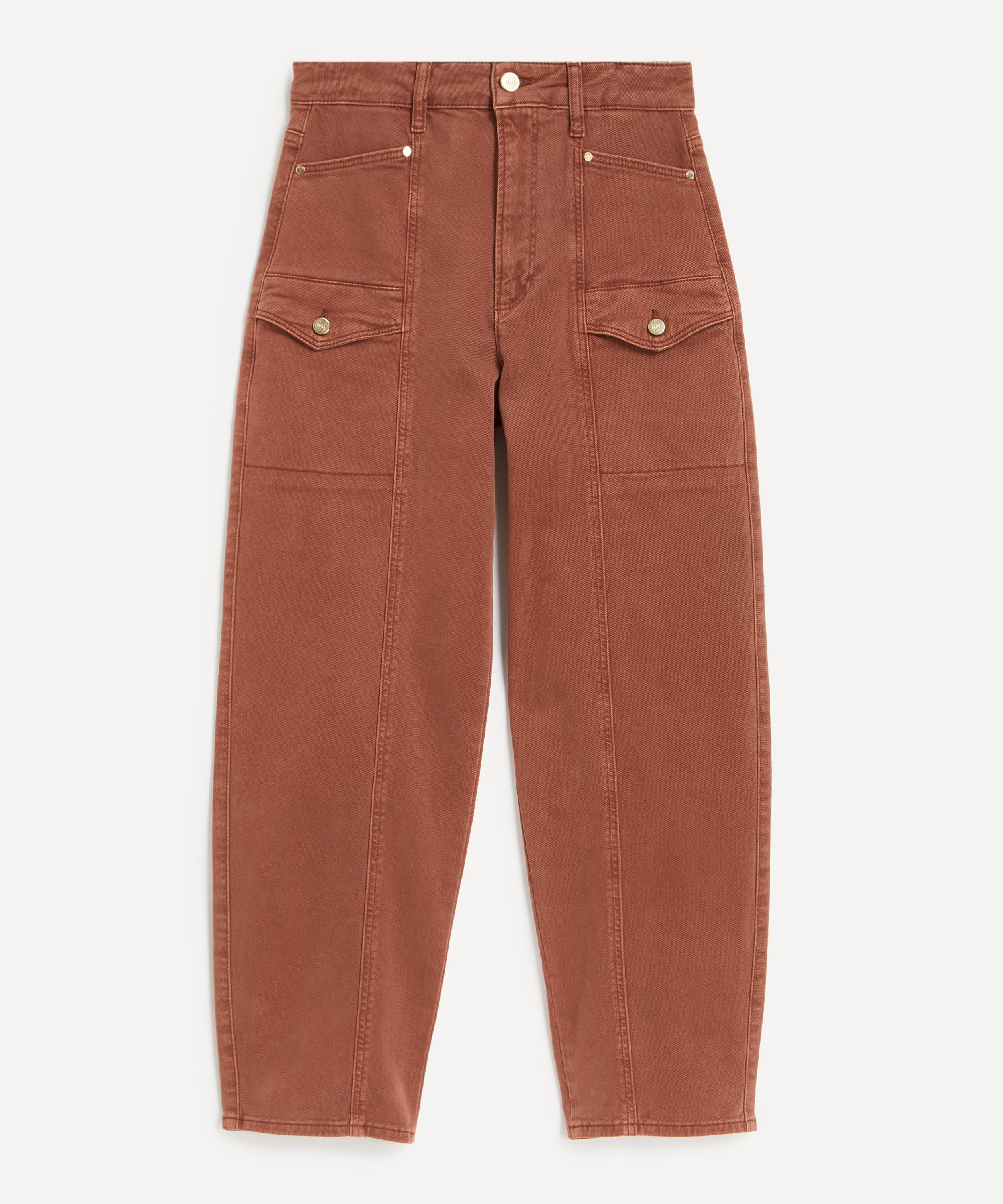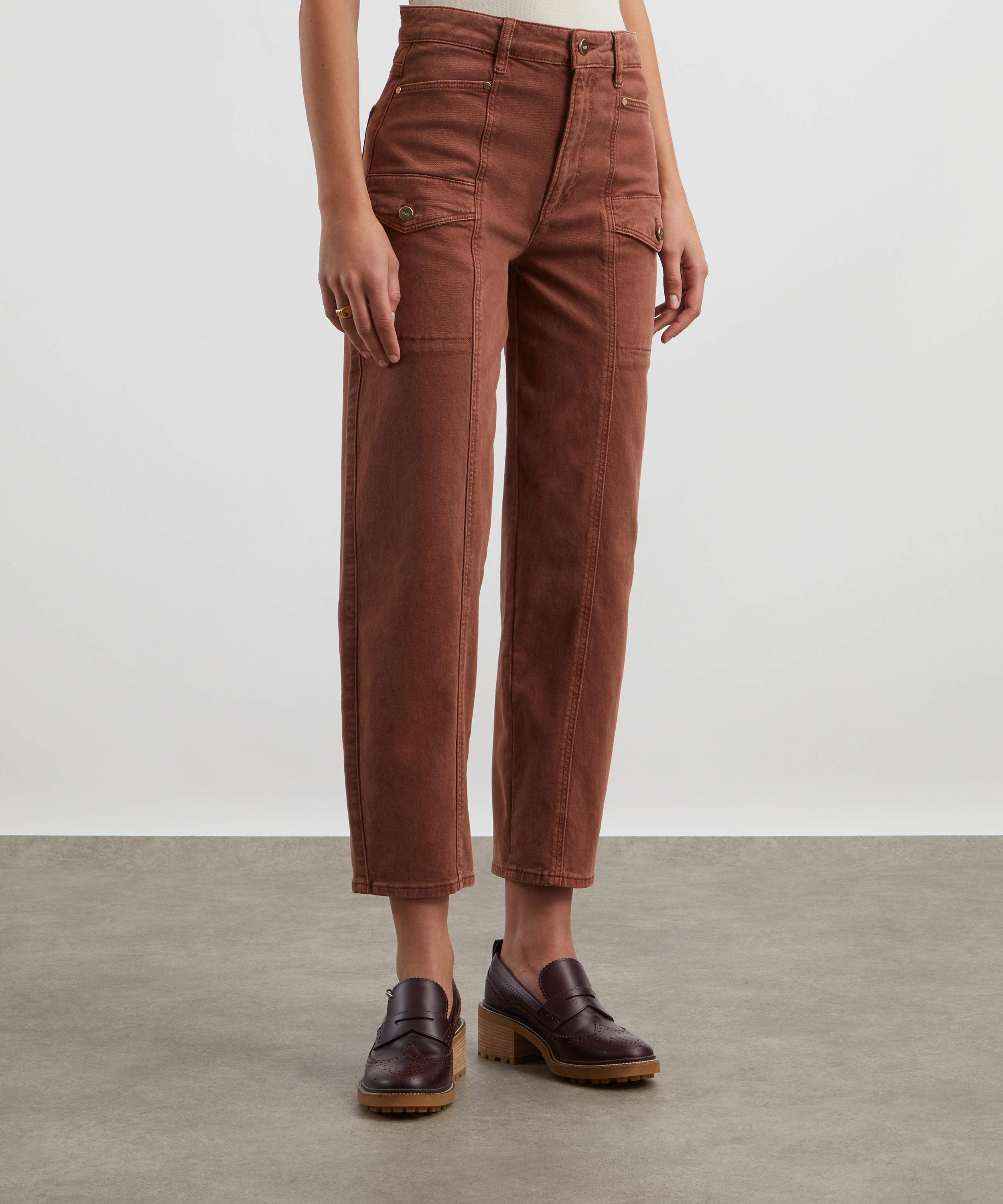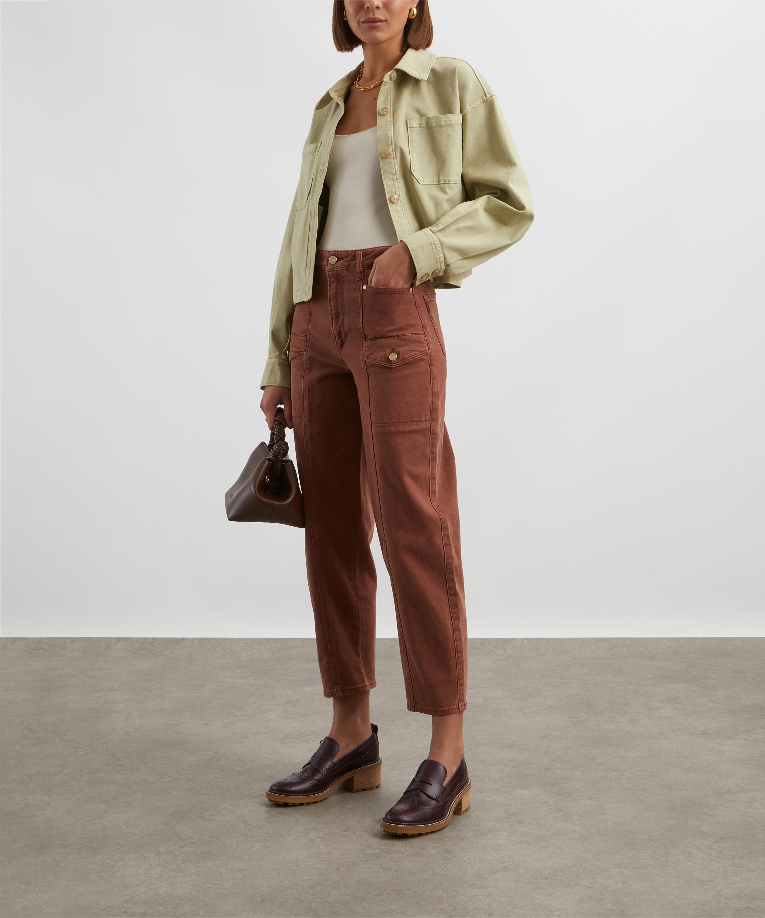 Crafted from super-soft denim with a hint of stretch, these vintage brown jeans are made to fit and flatter the body with its effortless barrel leg. Inspired by utilitarian-style cargo combats, this pair is constructed with multiple pockets, including two buttoned flap pockets to the front.