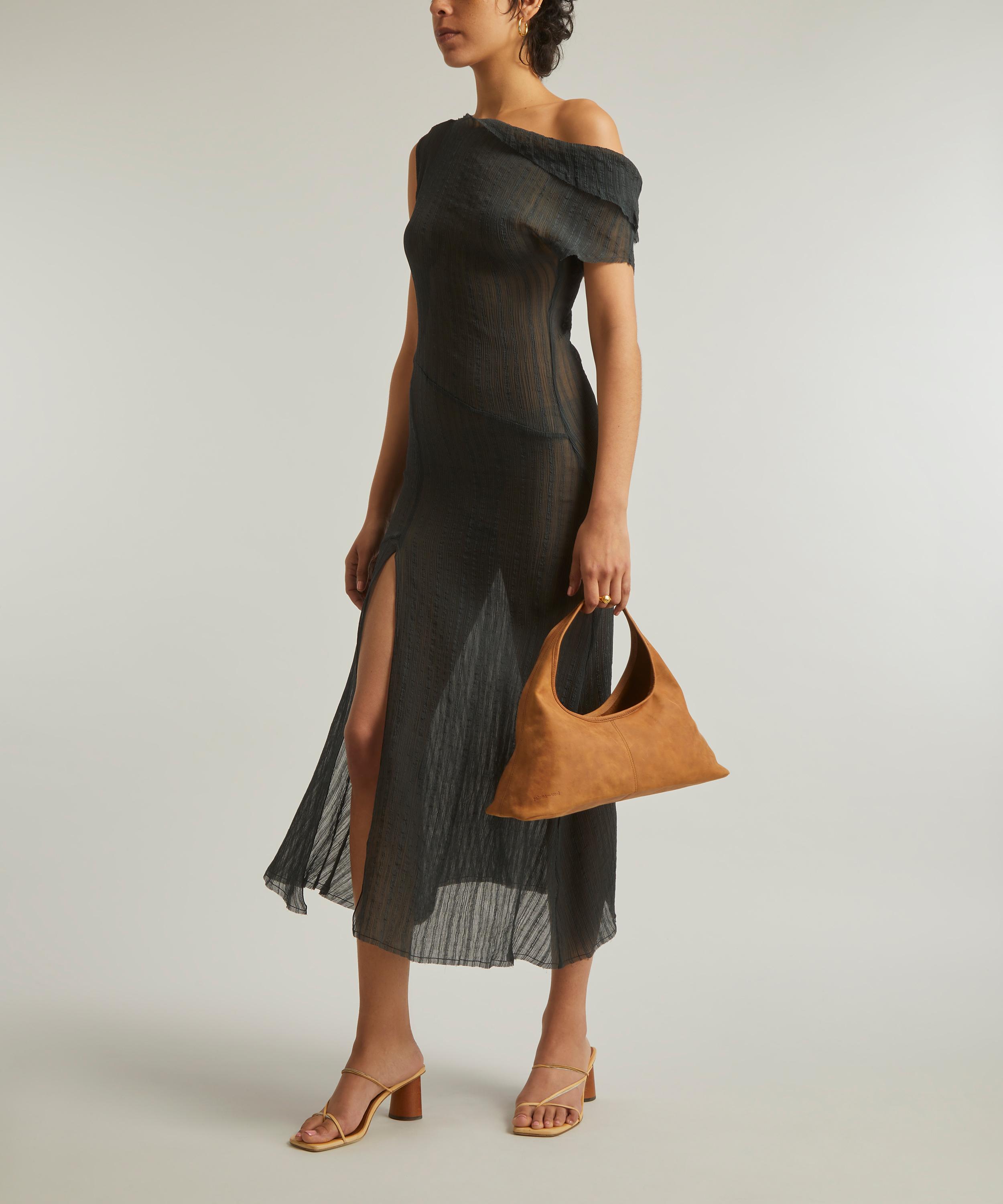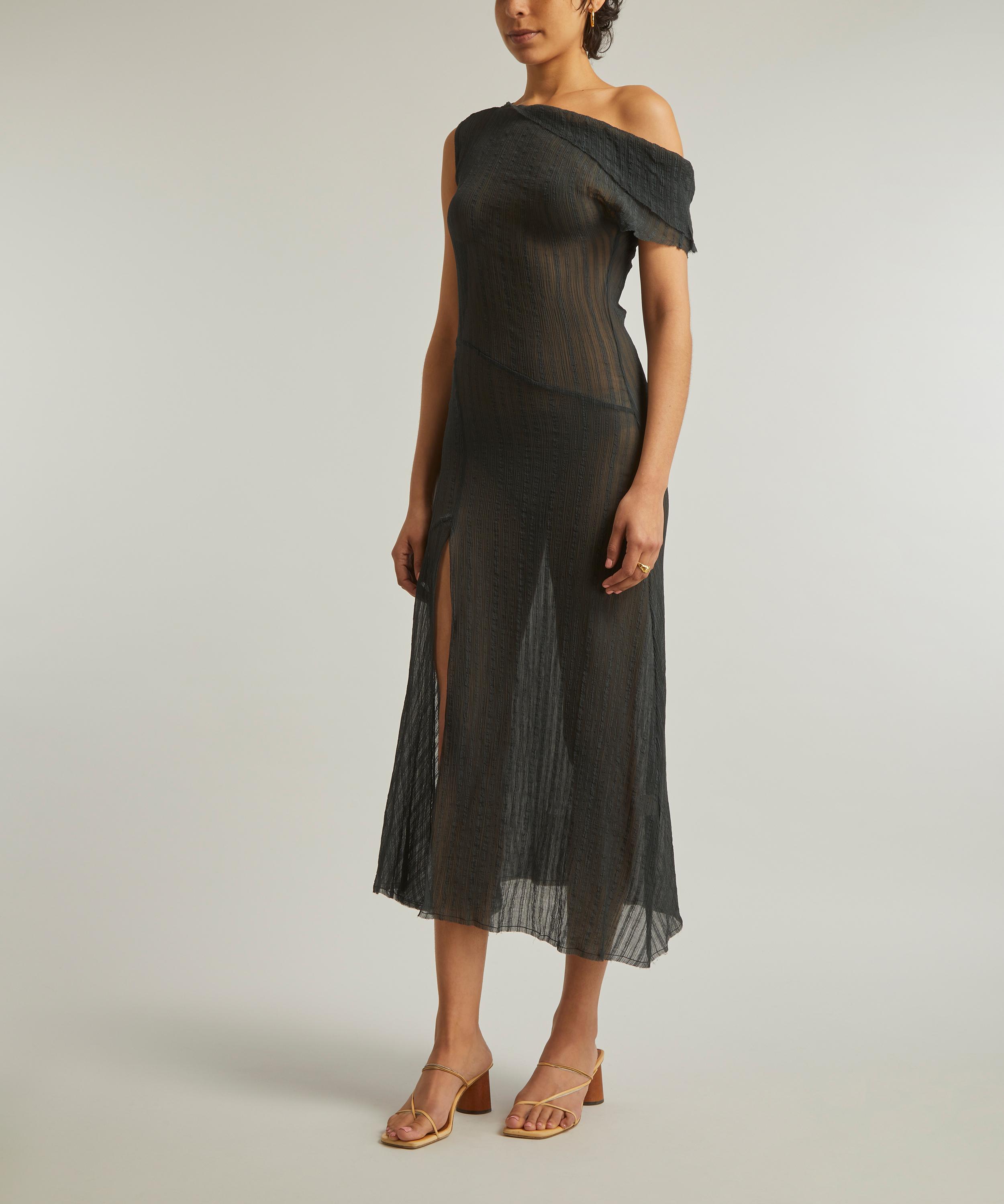 Cut for a slinky fit from a sheer, cotton and silk blend fabric, this delicate dress features an asymmetric design with mis-matched sleeves, a folded neckline and a maxi-length hem, detailed with a high side split for a playful finish.