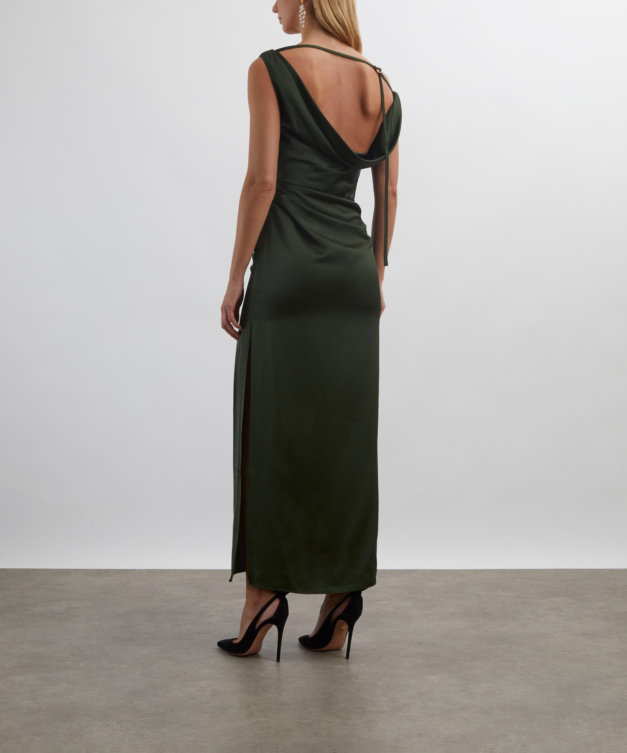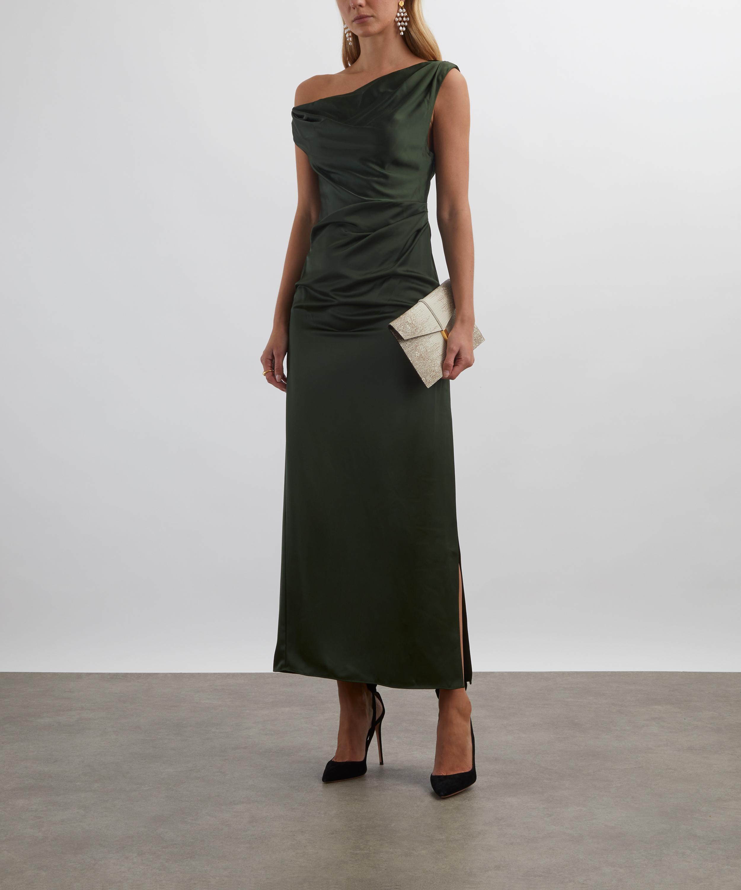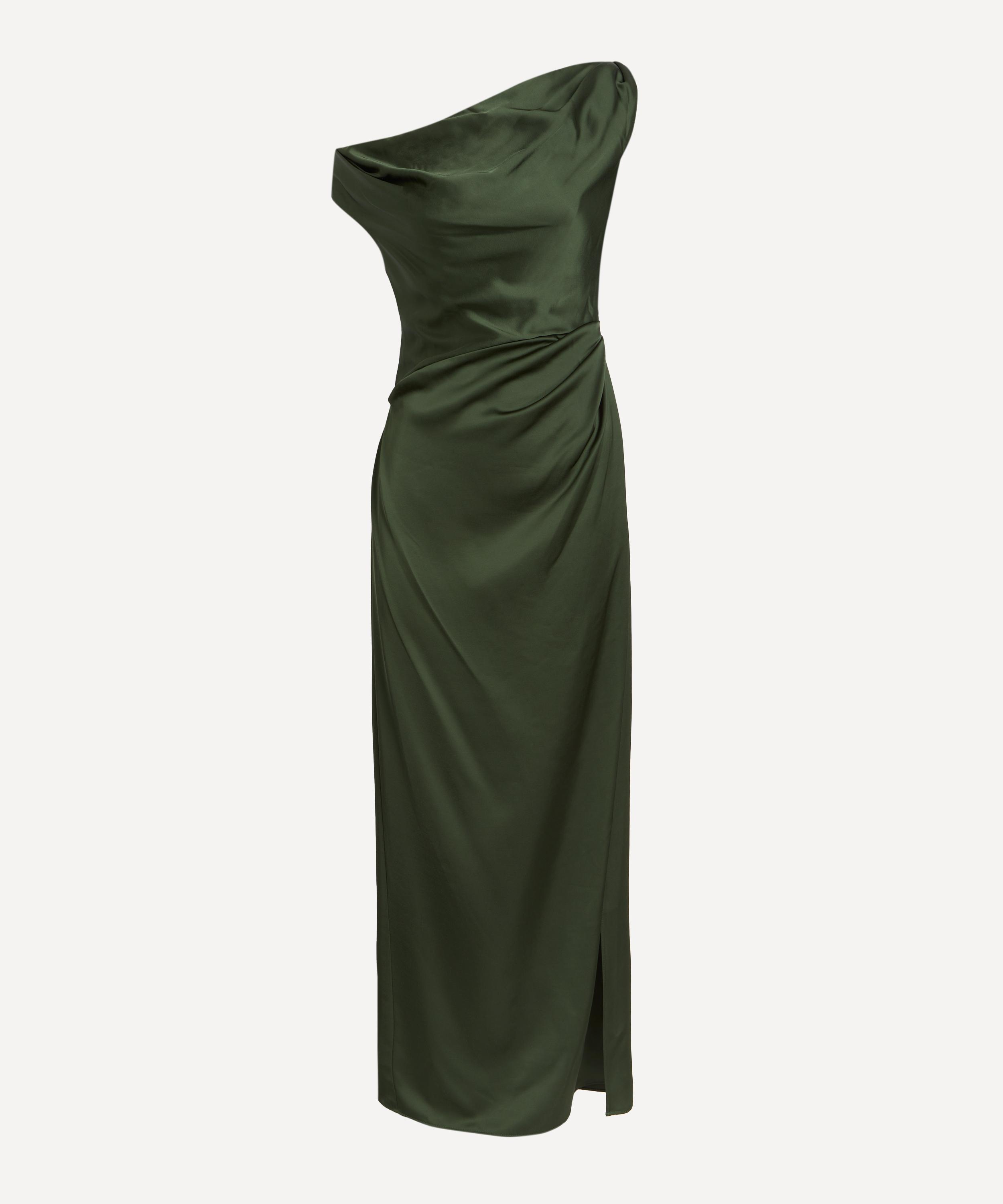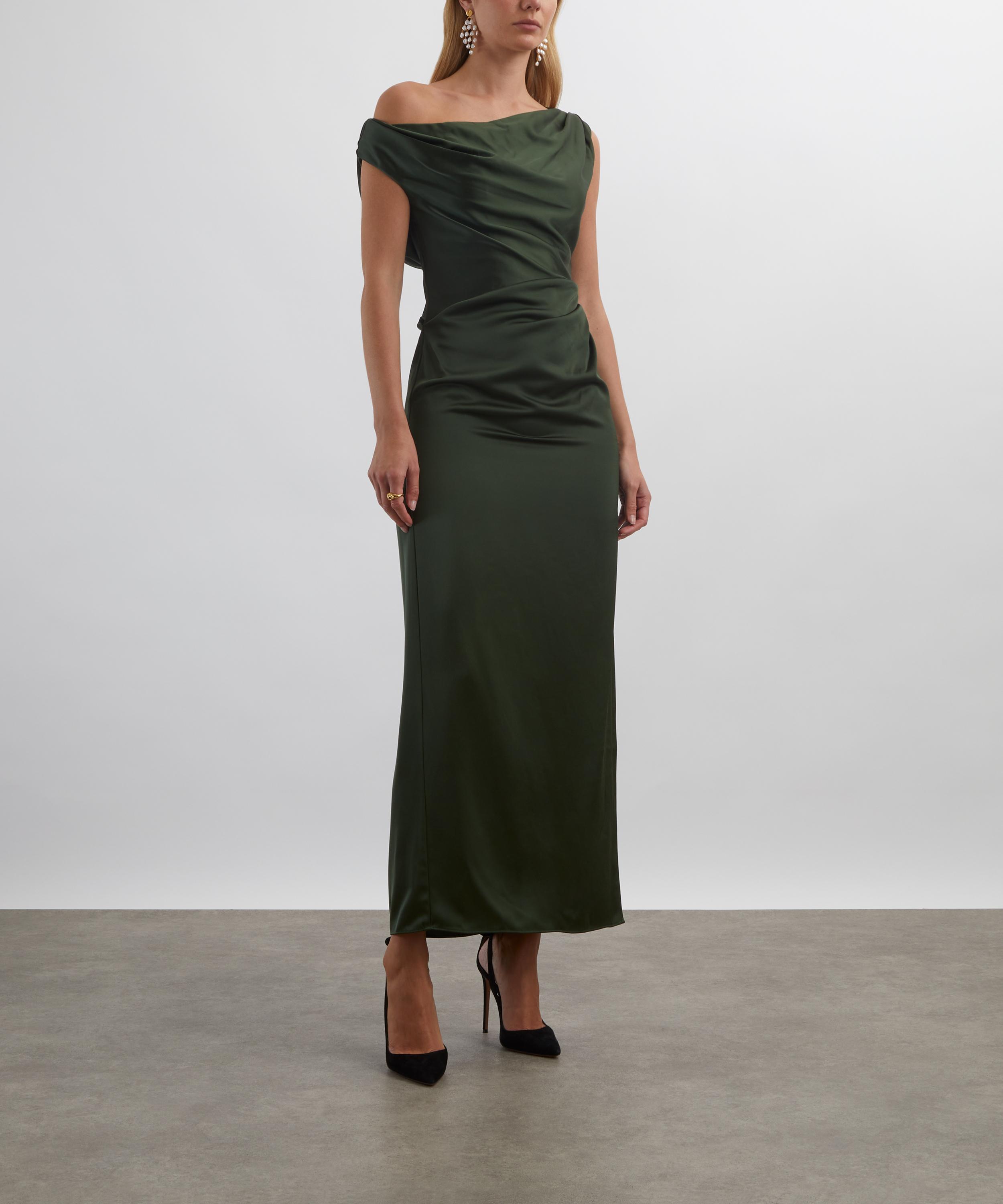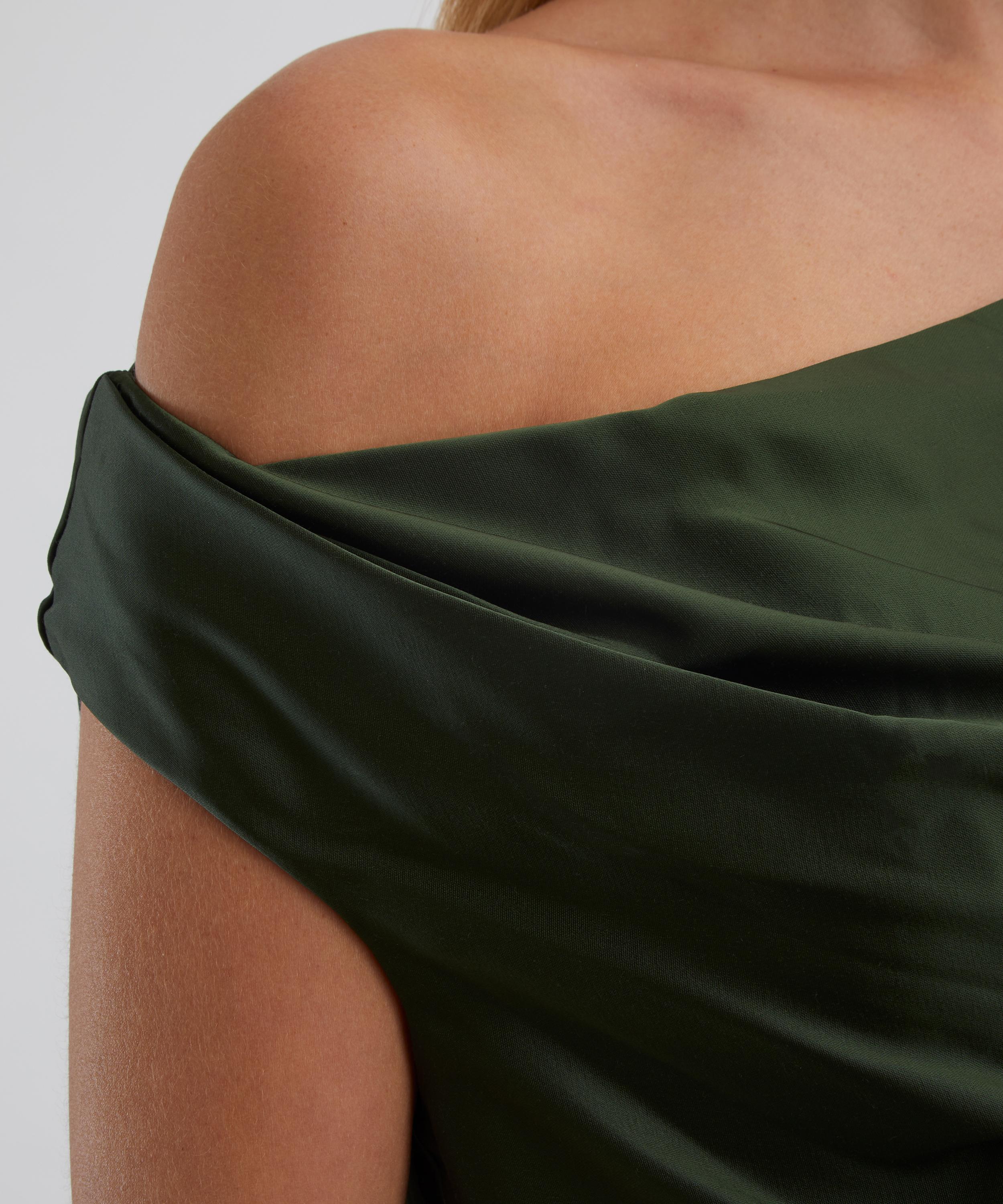 Crafted from sumptuous satin in a deep, forest-green colourway, the Alyssa Maxi exudes refined allure in a sleek, off-the-shoulder silhouette. Its soft cowl detail is balanced by an elegant asymmetric front drape, adding sculptural interest to the timeless design. The bodice is lined for a flattering, structured fit, while an invisible back zip ensures a seamless finish.