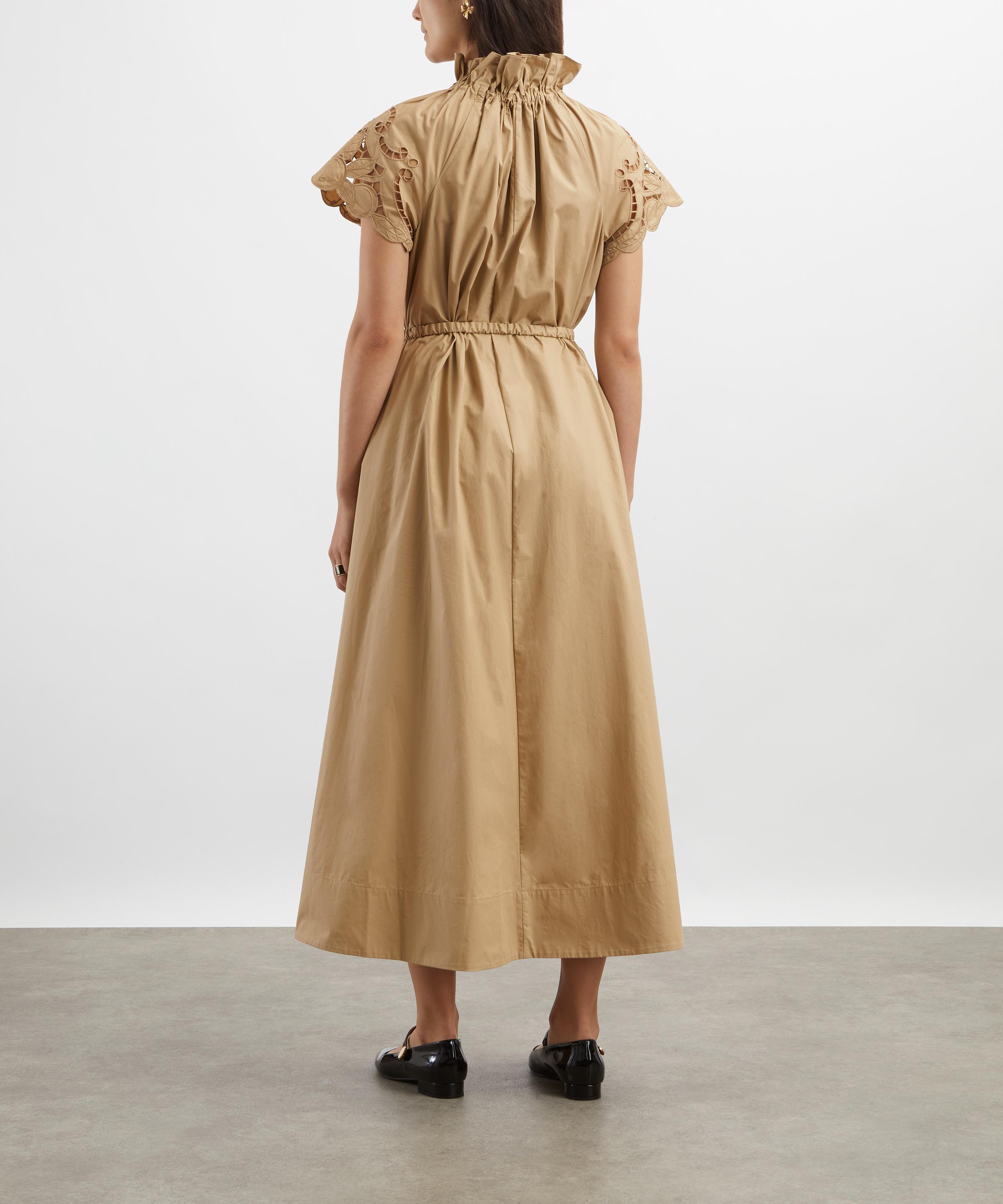 Crafted from crisp cotton in a timeless toffee hue, the Amaretti dress features a reversible neckline that can be worn high with a ruffled collar or open for a cut-away look. Designed for a relaxed fit, it comes with a detachable self-fabric belt for added shape while intricate cutwork embroidery accents across the short sleeves add a touch of artisanal detail.