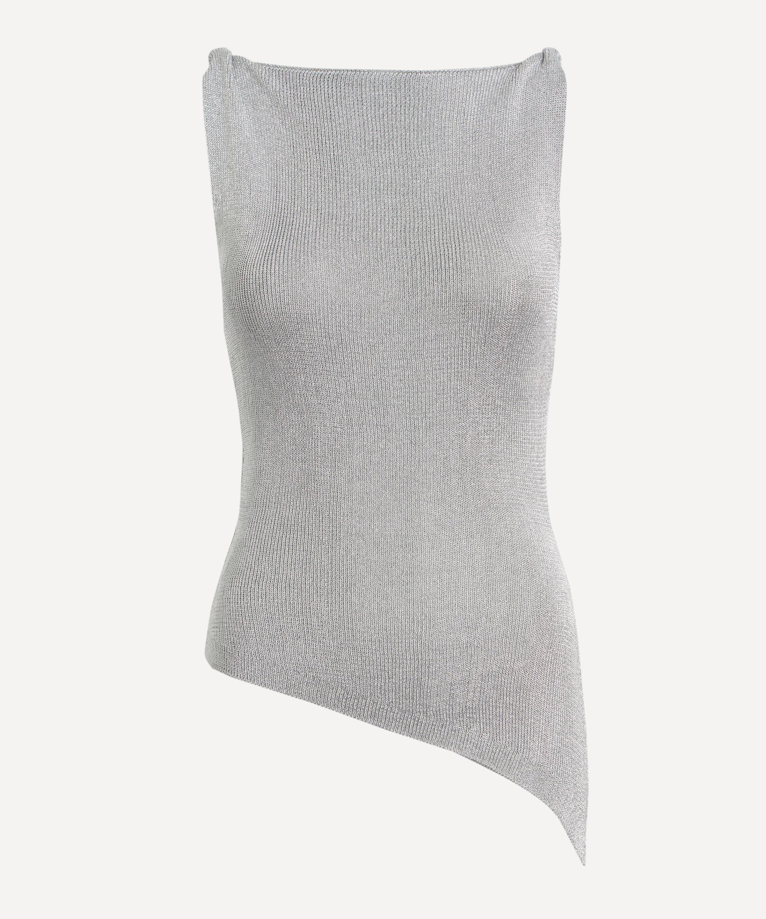 Crafted from dazzling metallic knit fabric, this versatile top features twisted straps, and an asymmetric hem with an adjustable side slit that can be knotted for a custom fit. Designed to pair seamlessly with the Amelia Metallic Knitted Skort, it can be worn with a high neckline or reversed for a scoop-front silhouette.