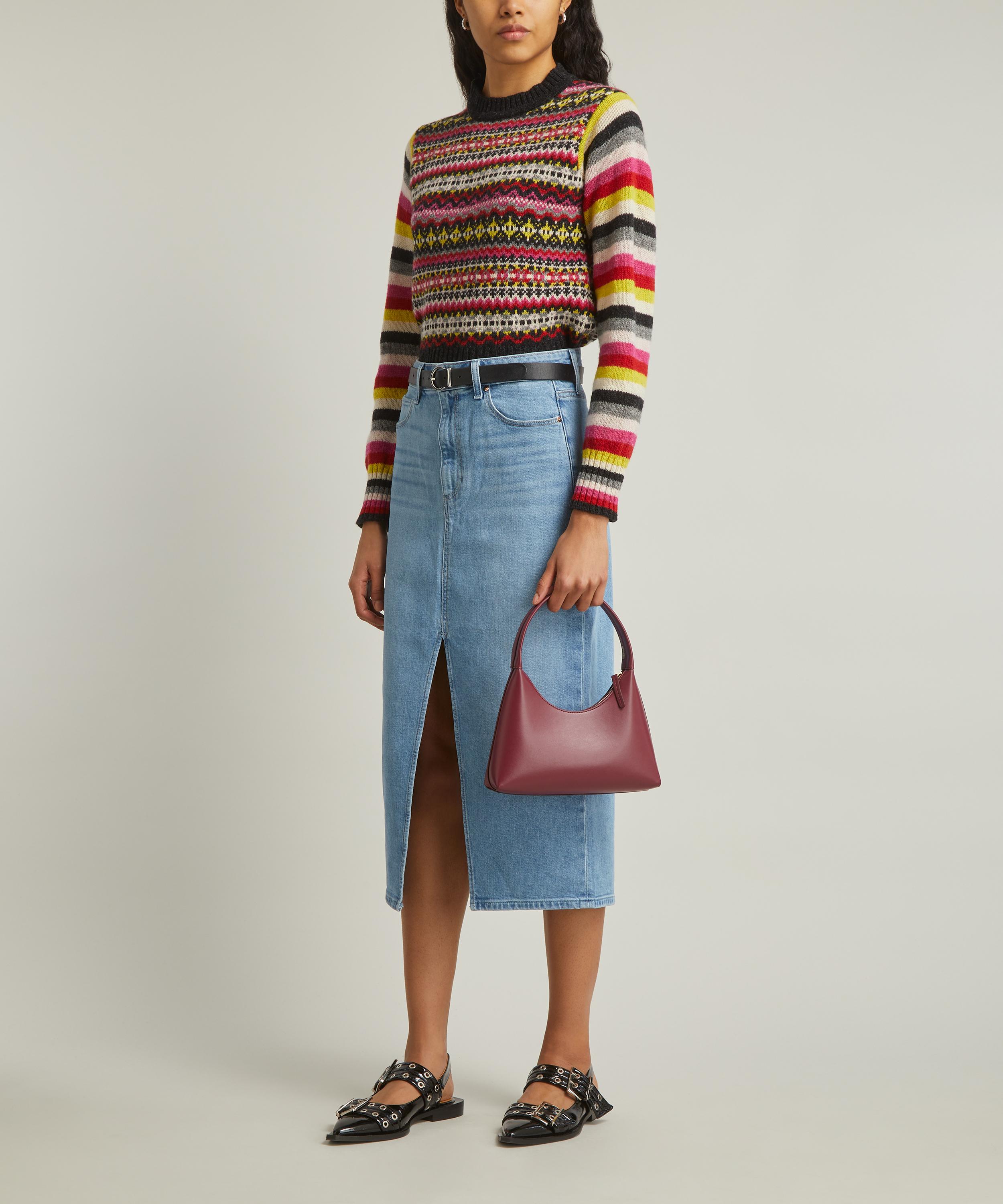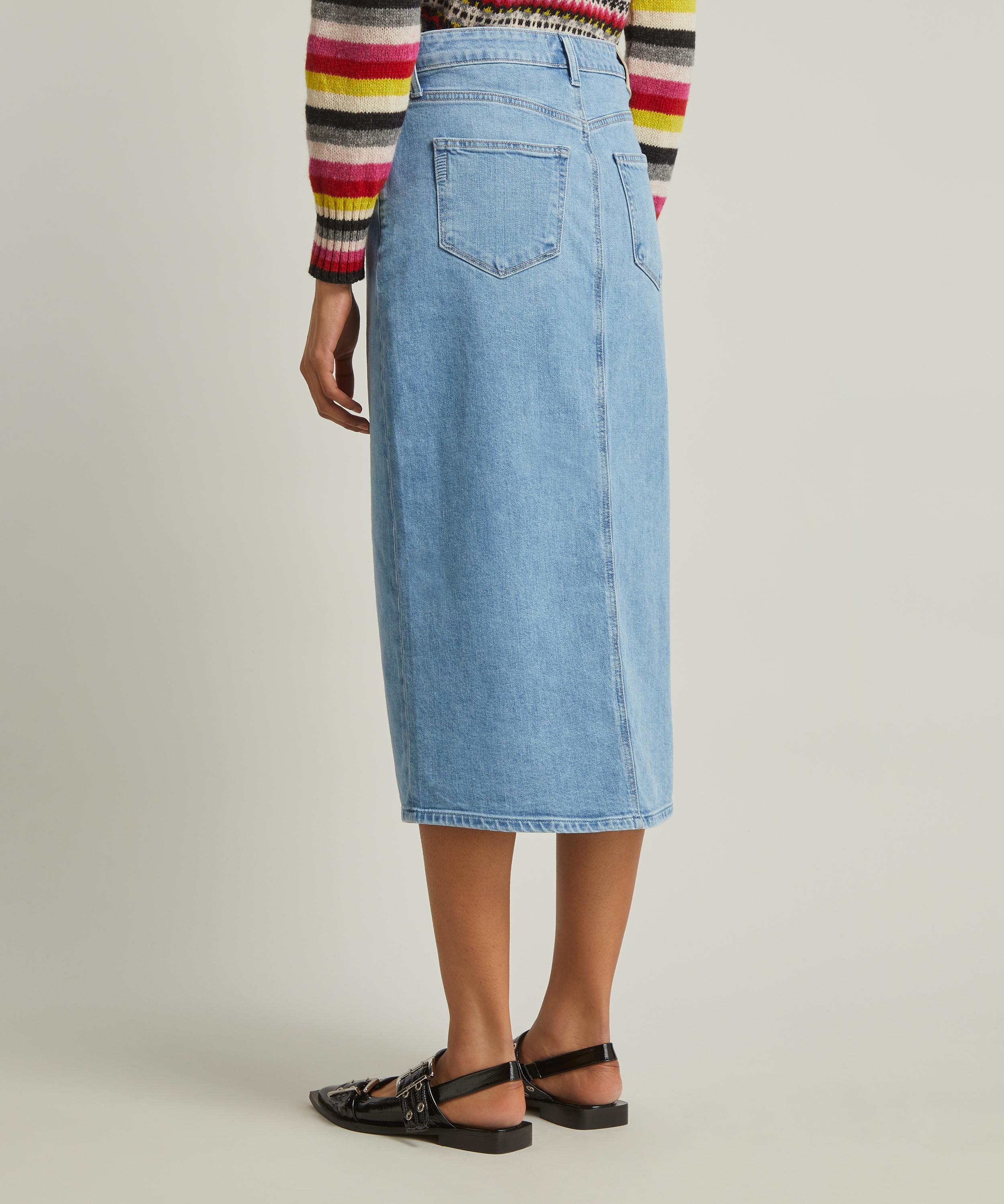 This skirt features a midi-length relaxed cut with an asymmetrical front slit – perfect for styling with a simple white tee to reign in Spring on gloriously bright days.