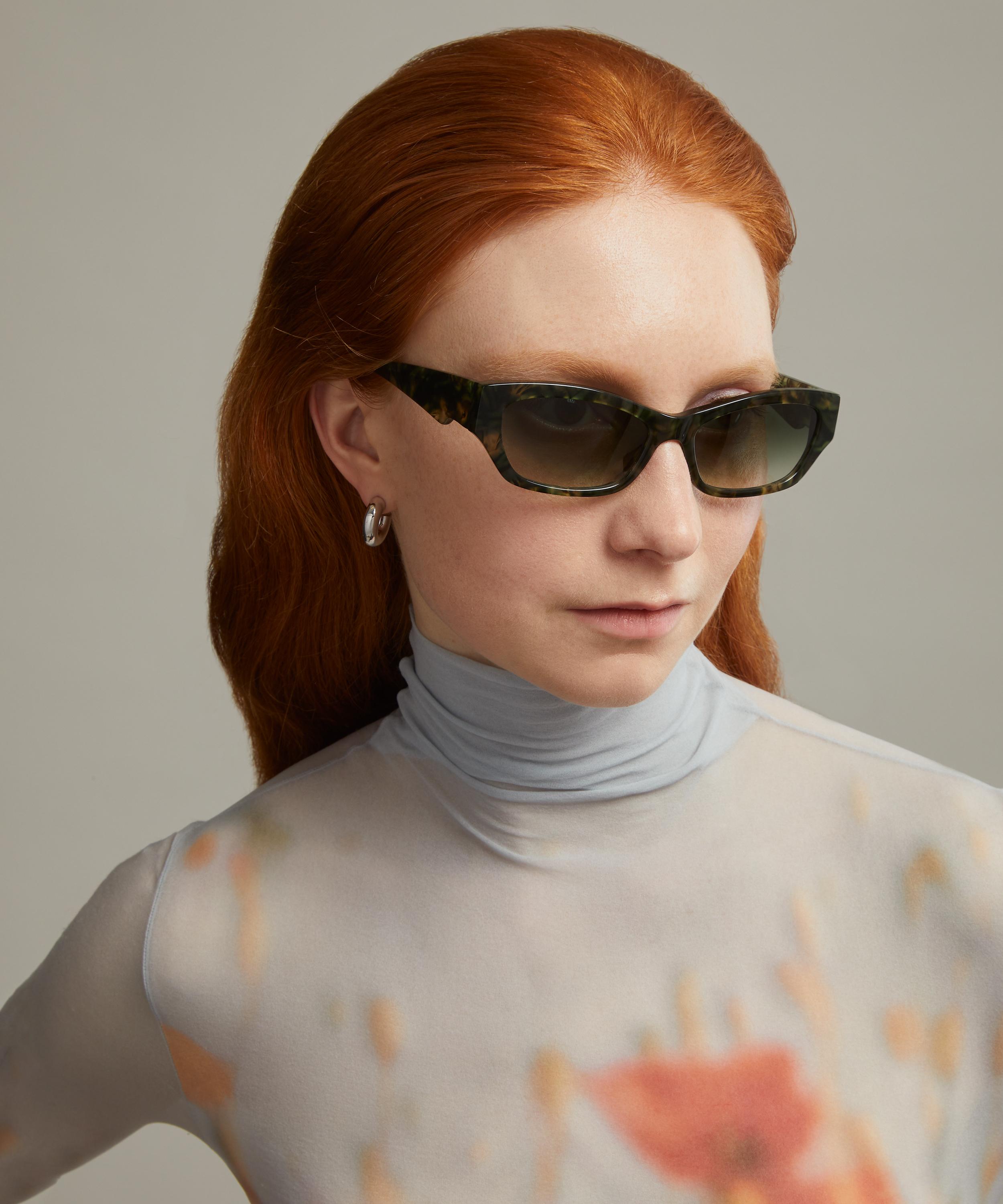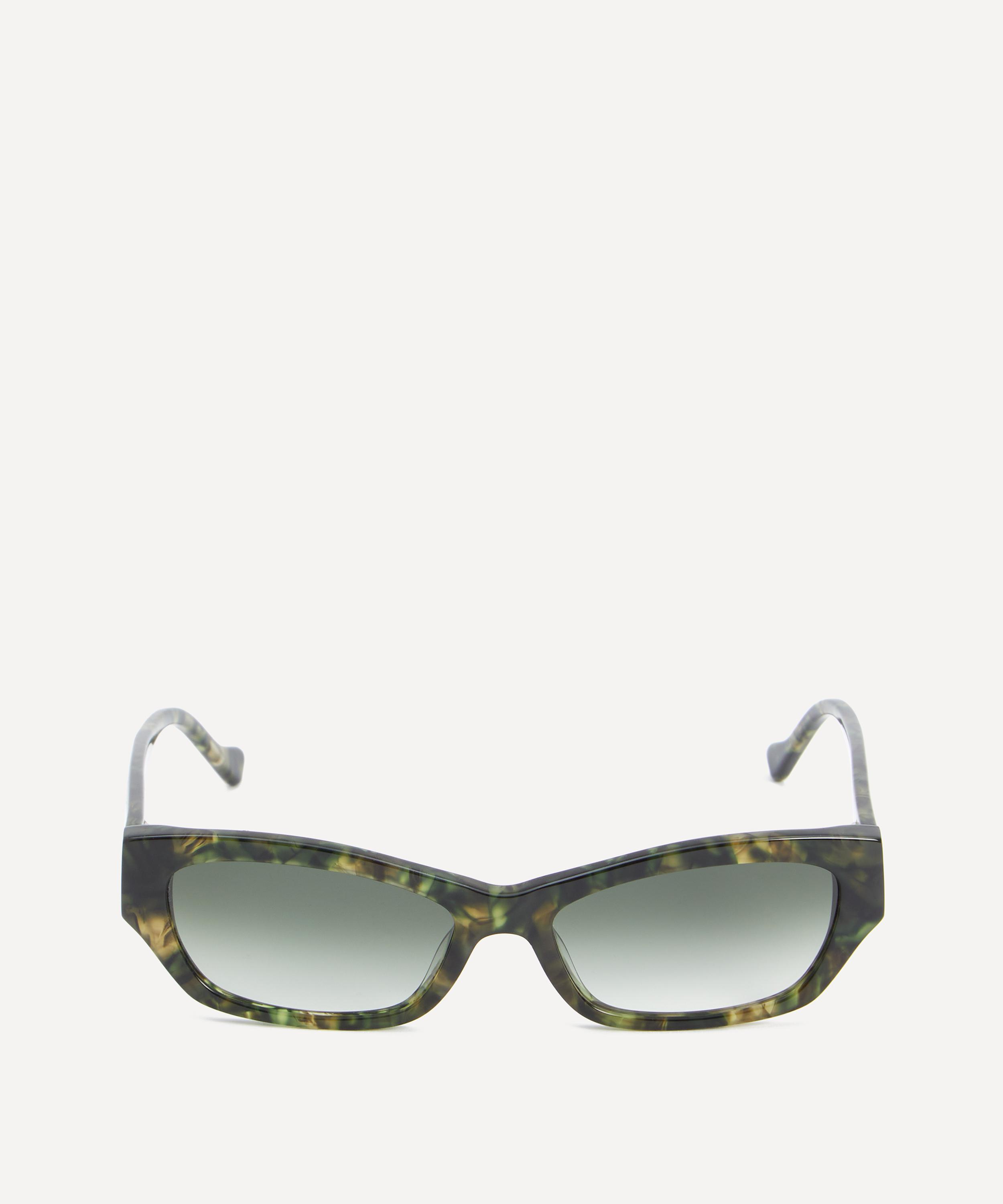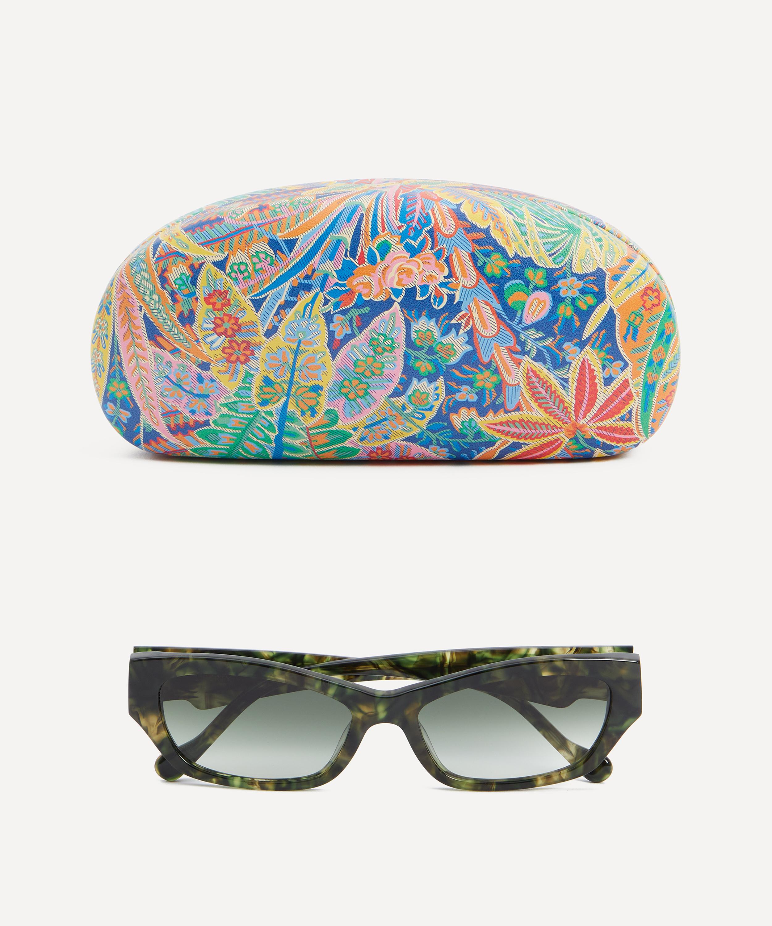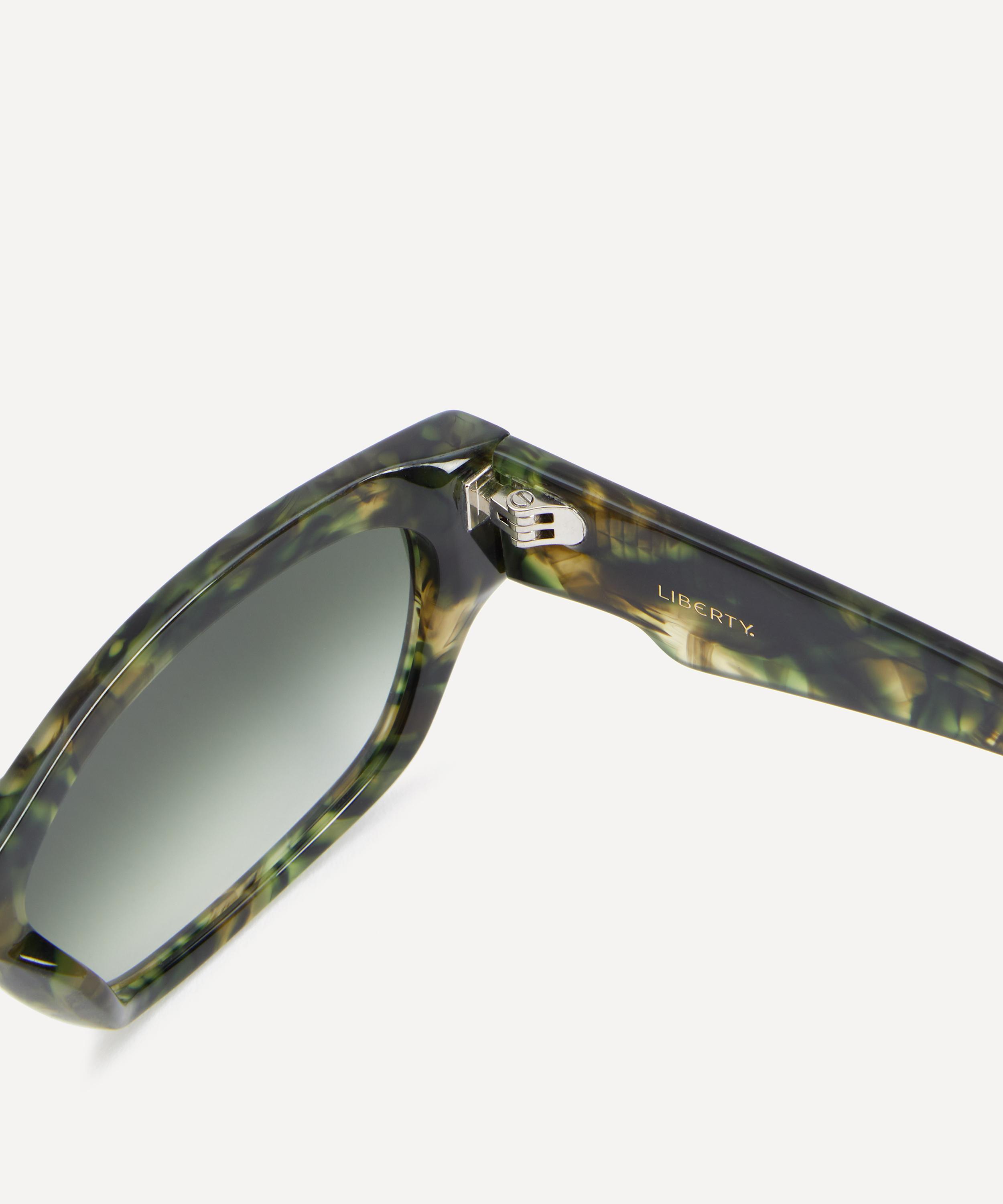 Make a bold statement and get the look of the season with these angular sunglasses from Liberty. Transforming iconic shades with a touch of Liberty print, this sleek pair are crafted to a narrow, angular silhouette from durable acetate, accentuated by a green colourway and green gradient lenses. Complete with subtle branding to the left temple, they're perfect for adding a stylish finish to any outfit.