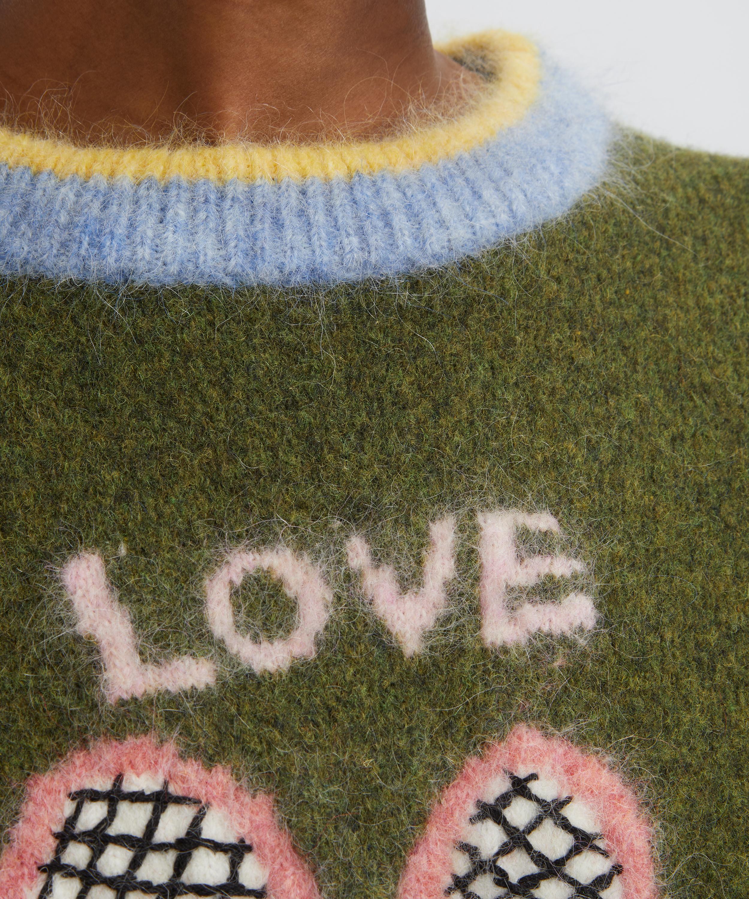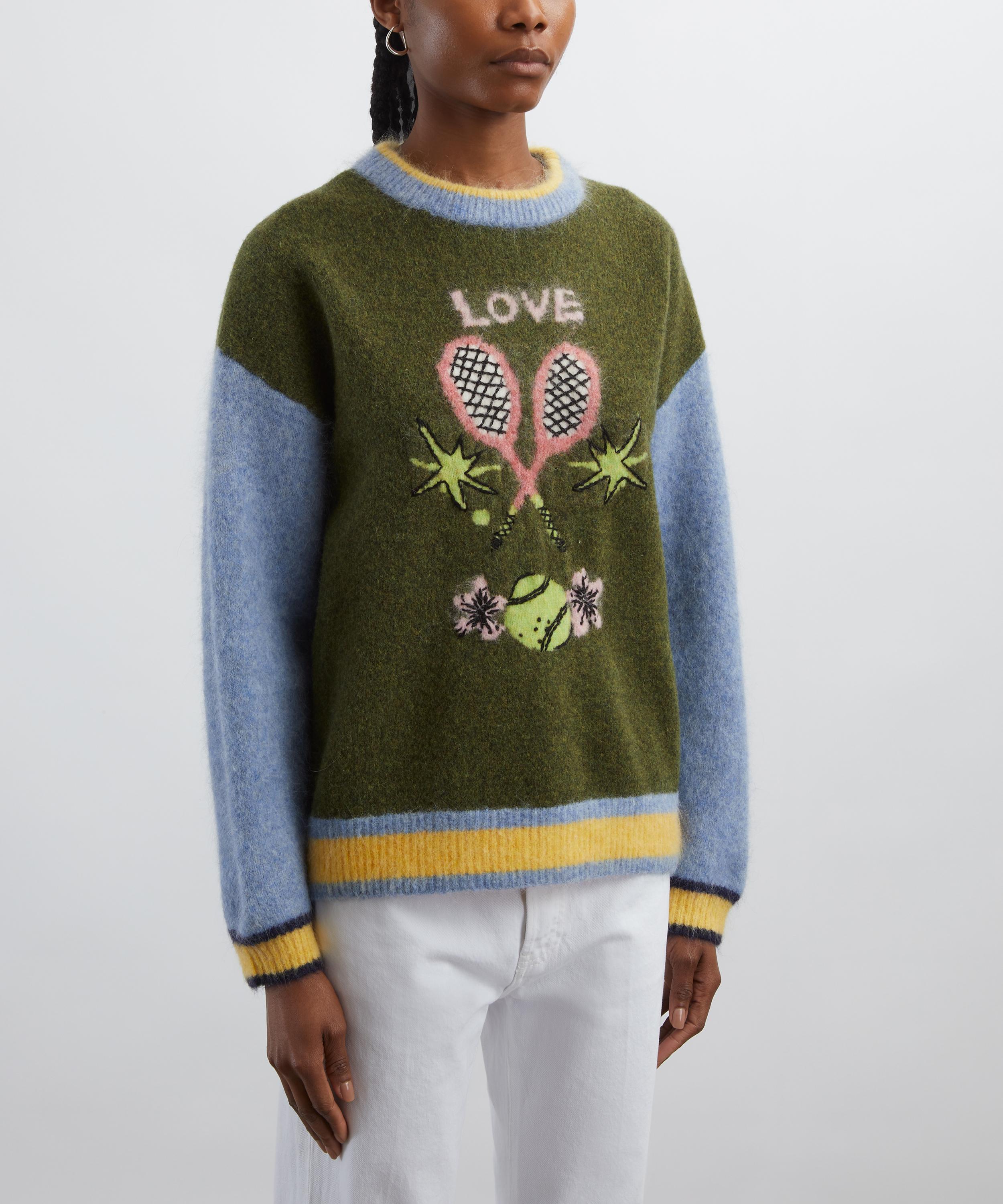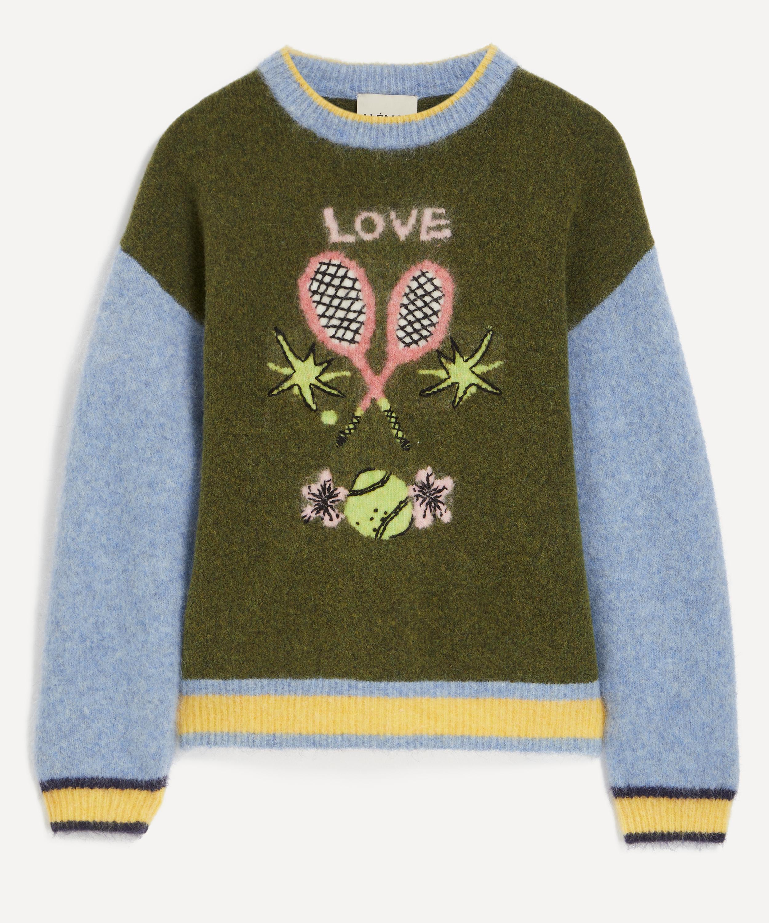 Created in collaboration with artist Anouk Colantoni, this plush jumper showcases a whimsical medley of tennis-inspired artwork. Crafted from a sumptuous blend of alpaca, mohair, and wool, it’s designed for a relaxed fit with dropped shoulders and contrasting striped trims.