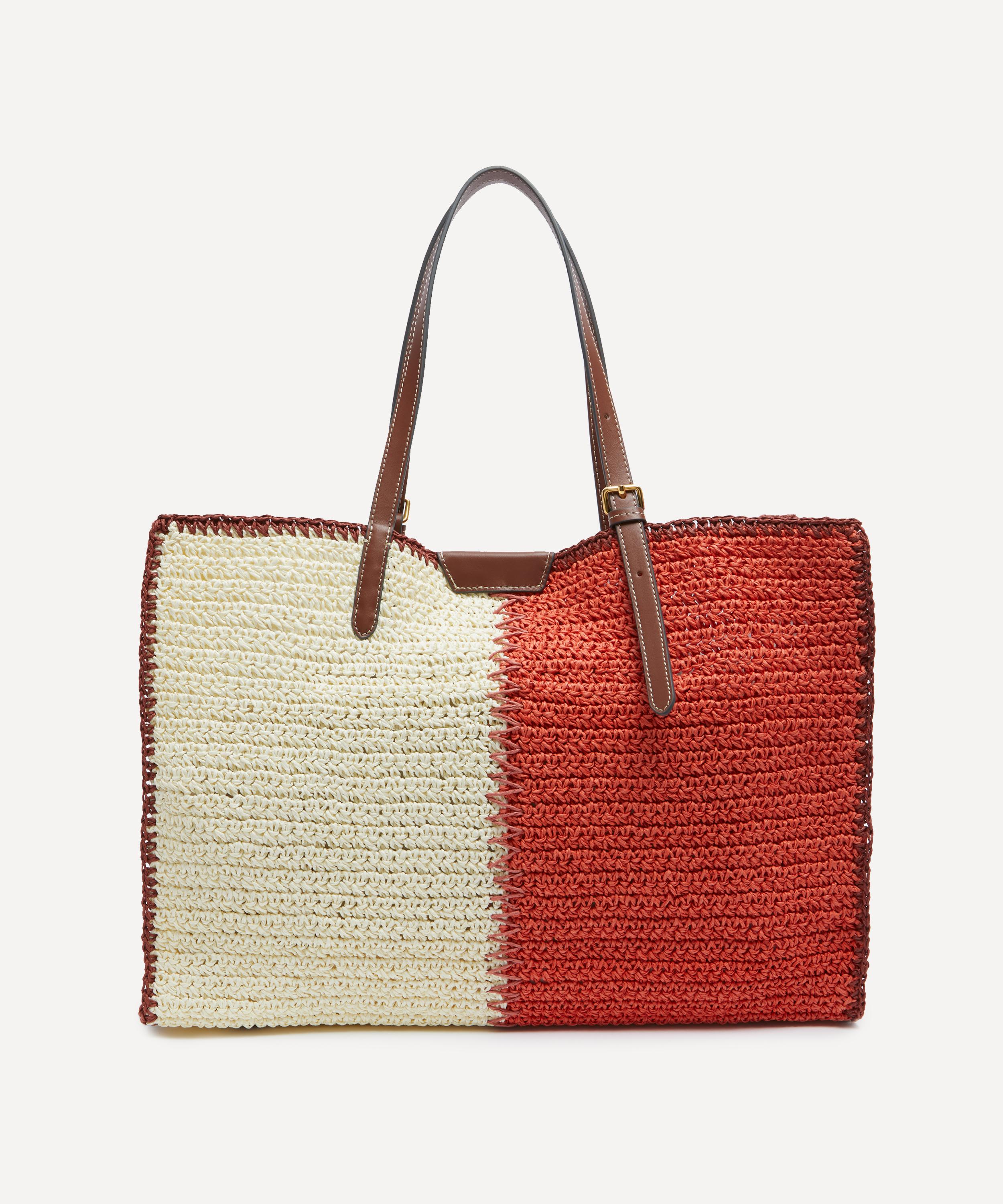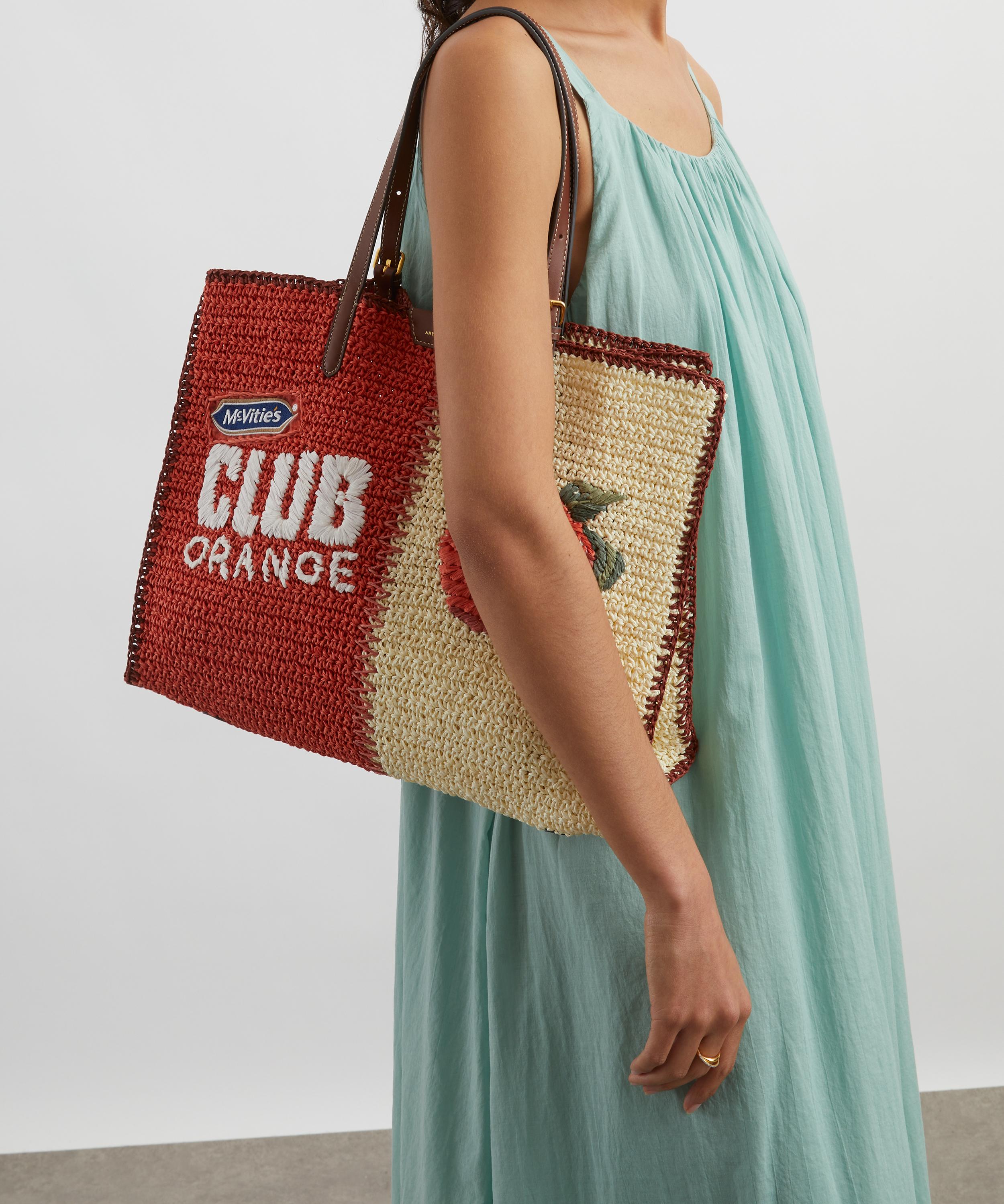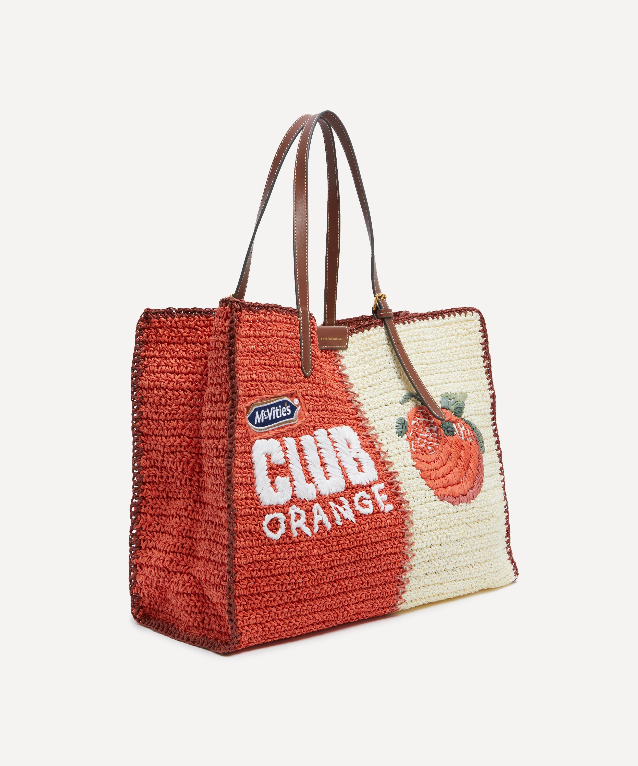Handwoven from raffia, featuring vintage artwork from the nostalgic Club Orange snacks, it’s equipped with smooth leather trims, including adjustable top handles and an internal slip pocket for keeping small trinkets and valuables. Spacious enough for toting around daily essentials like a laptop, water bottle and book, it’s perfect for errand runs in the city, sun-soaked garden strolls, and relaxing days spent on the beach. Adorn it with one of Anya Hindmarch many whimsical bag charms for an extra dose of fun and personalisation.