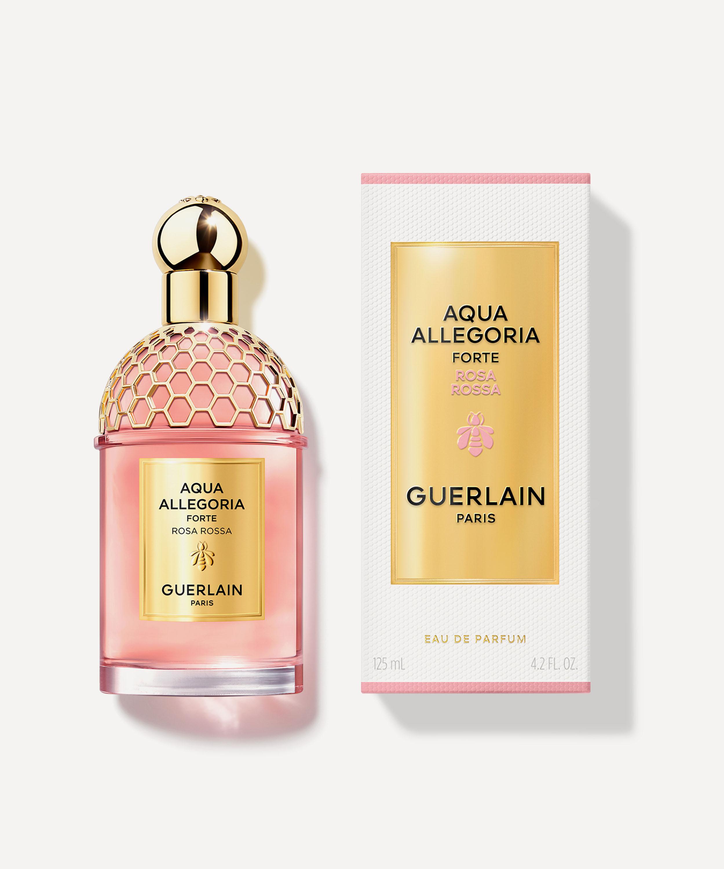 GUERLAIN’s Aqua Allegoria Forte Rosa Rossa eau de parfum is a blooming, velvety rose bathed in golden light. Boasting a cheerful and sweet creation, its composition is an overdose of French, Bulgarian and Turkish roses, a powerful trio enhanced by a silky smooth white peach, magnified by a deliciously woody base of sandalwood and patchouli.