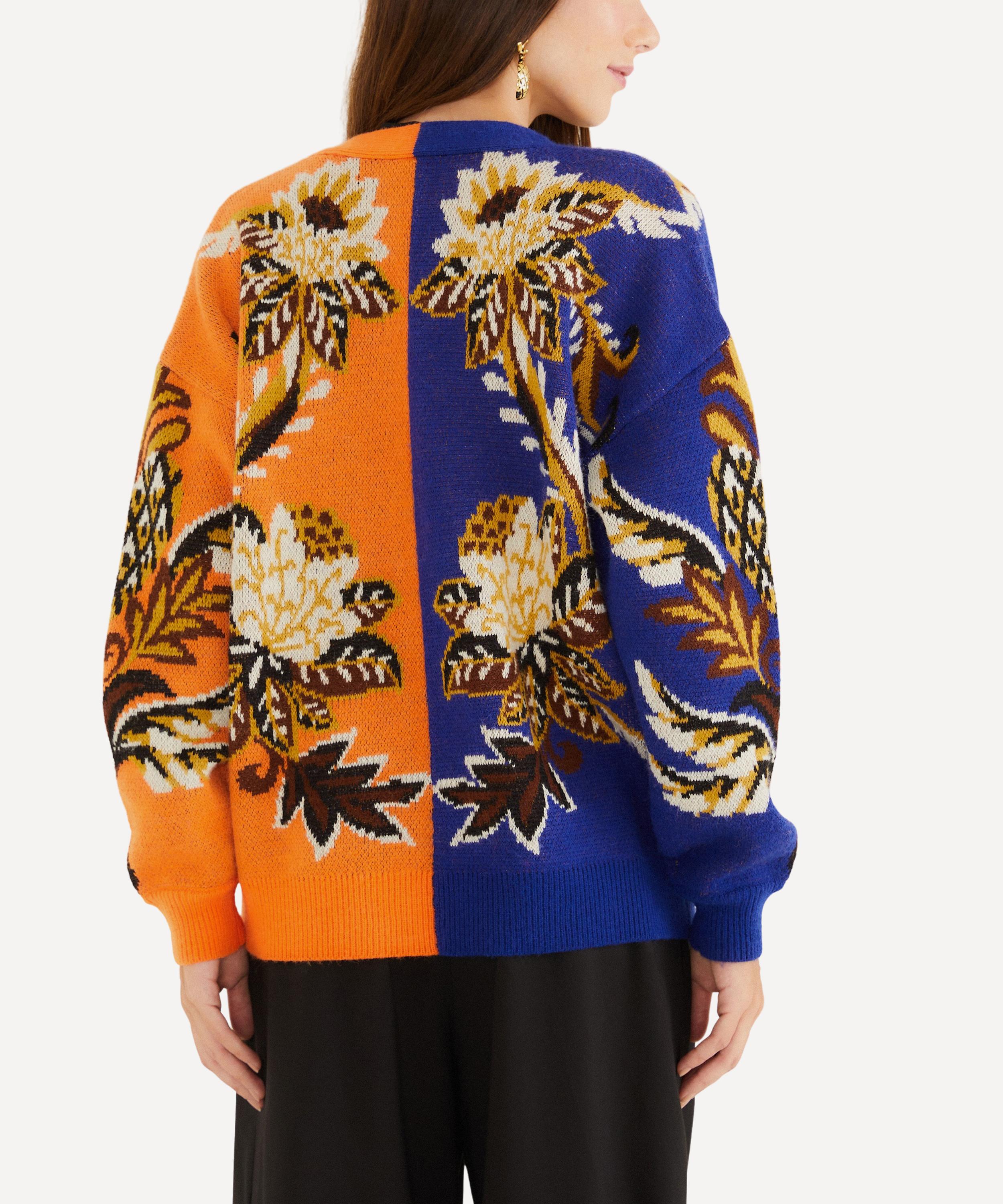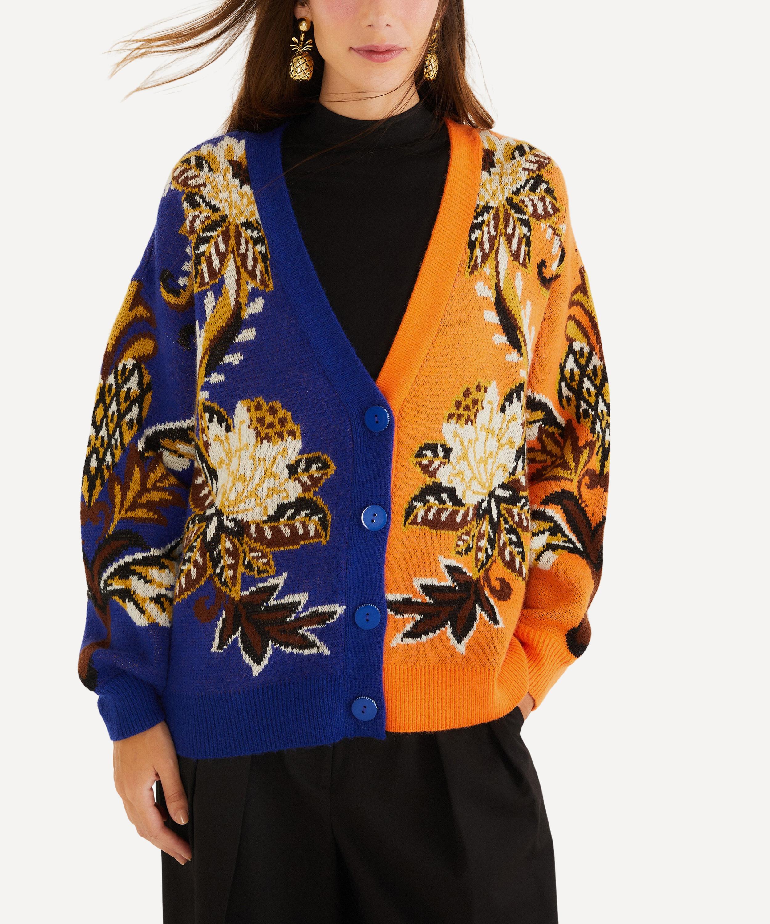 The Arabesque Paradise Mixed Print Cardigan charms with bold florals in contrasting orange and blue. Its relaxed fit, long sleeves, ribbed trims, and V-neckline create a cozy, playful statement - making it the perfect seasonal layer.