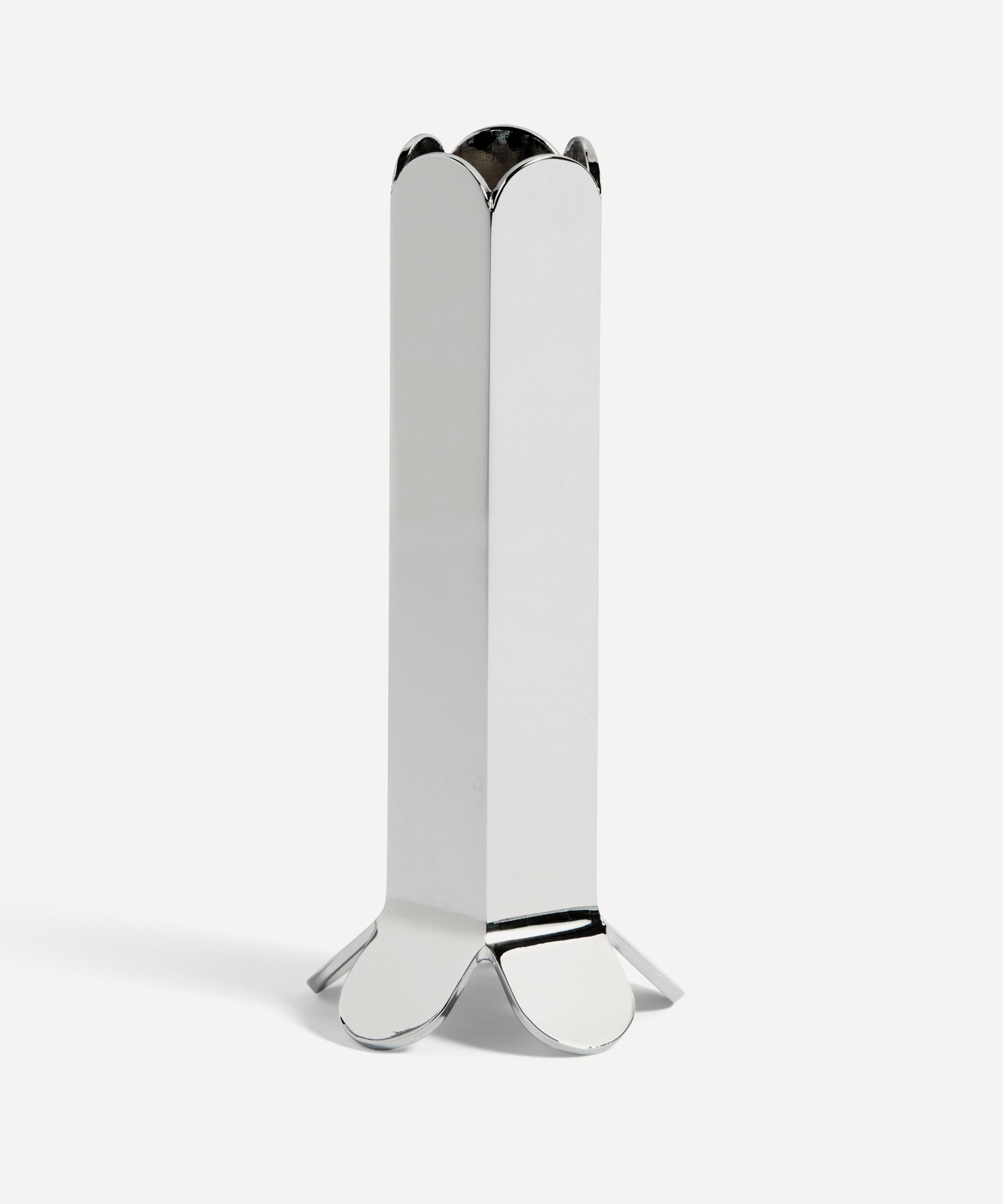 Brighten your dining or living space with Hay's Arcs candle holder. Crafted from zinc alloy and finished with a shiny mirror surface, this piece brings contemporary twists to any interior style, channelling Hay's clean aesthetic into wooden shelves or table settings. With a thick angular stem and splayed foot, this candle holder will add dimension and structural interest to any surface.