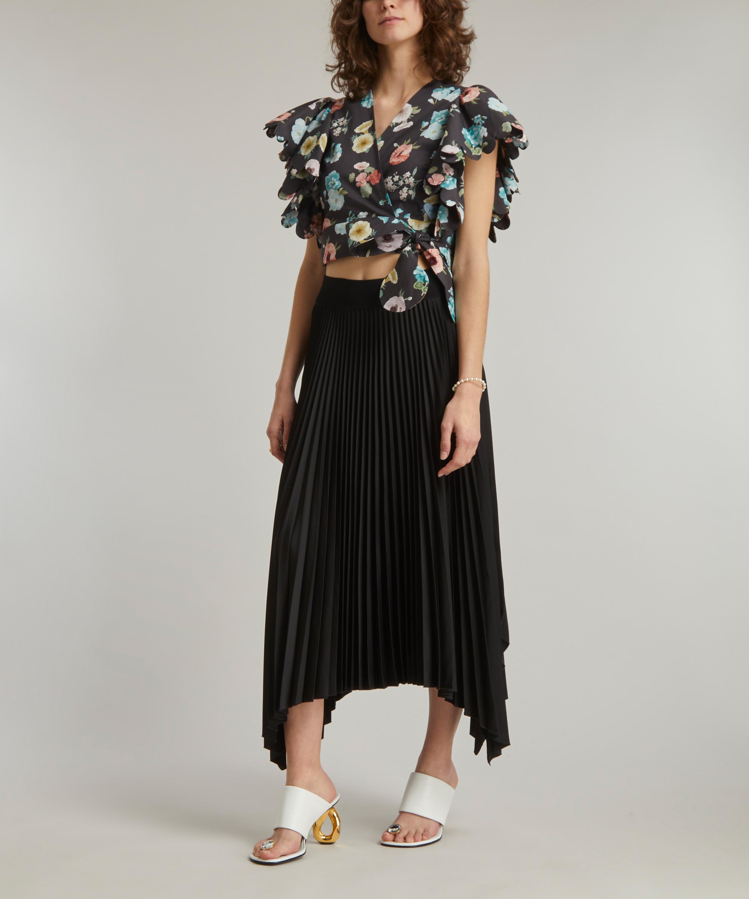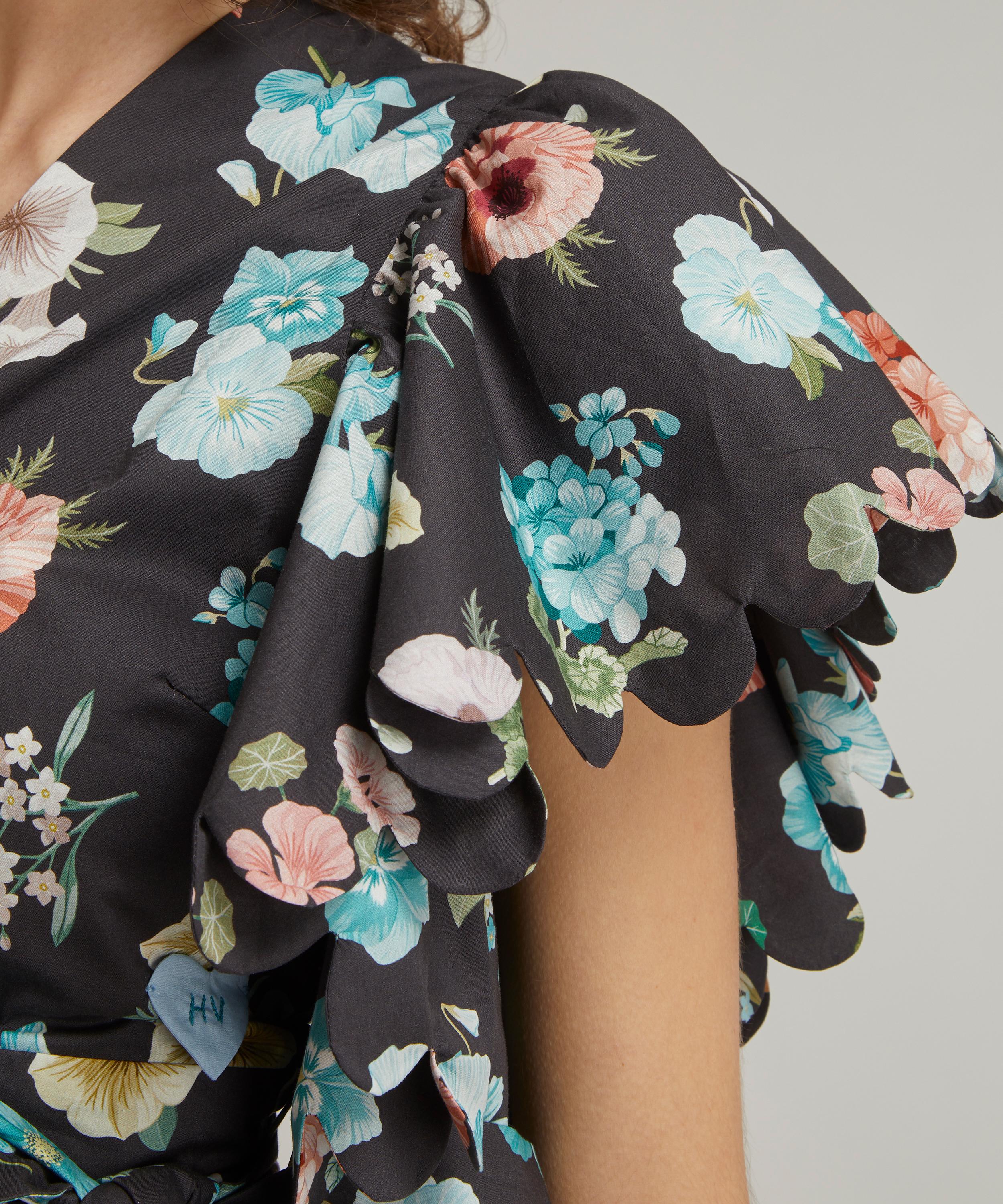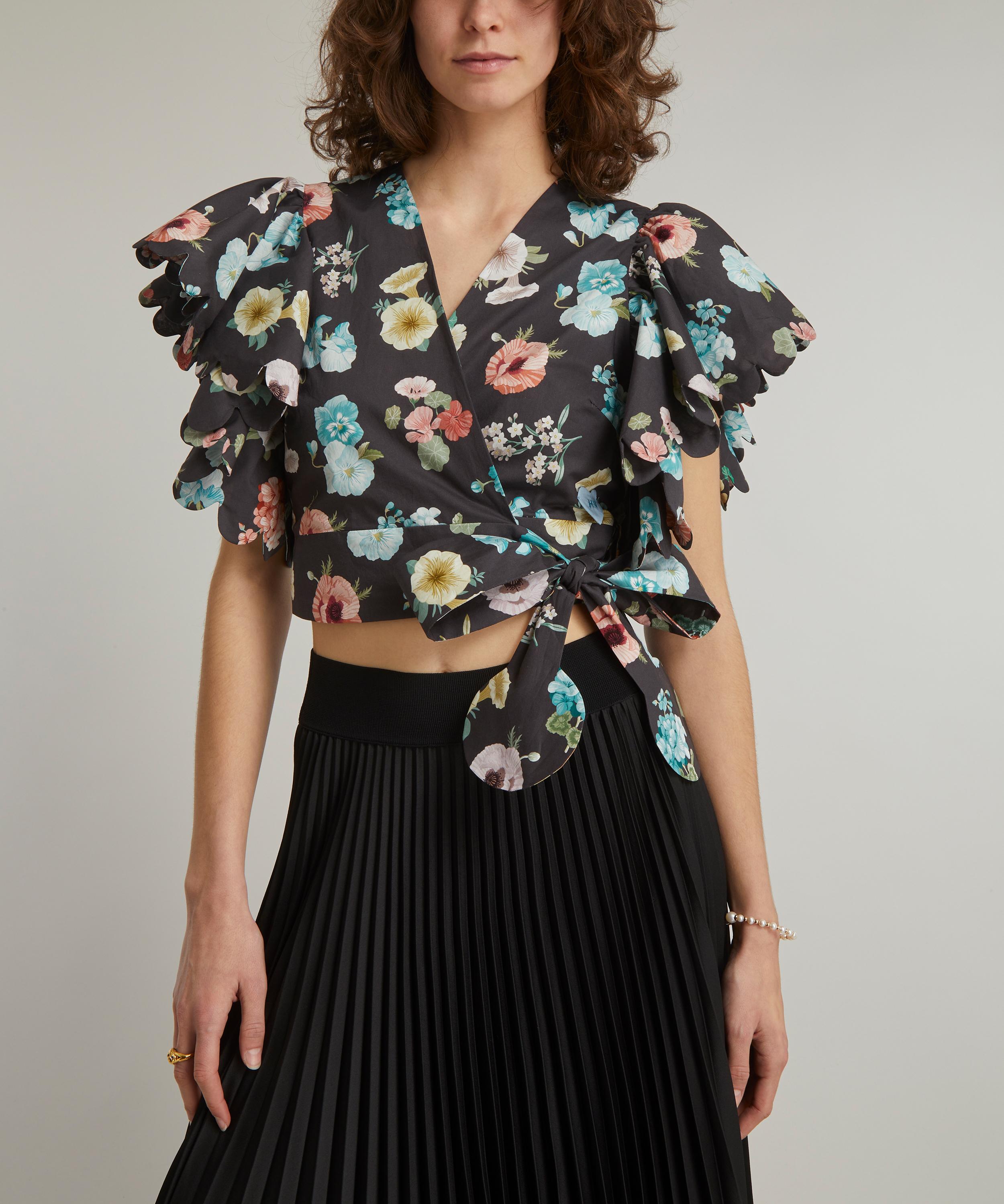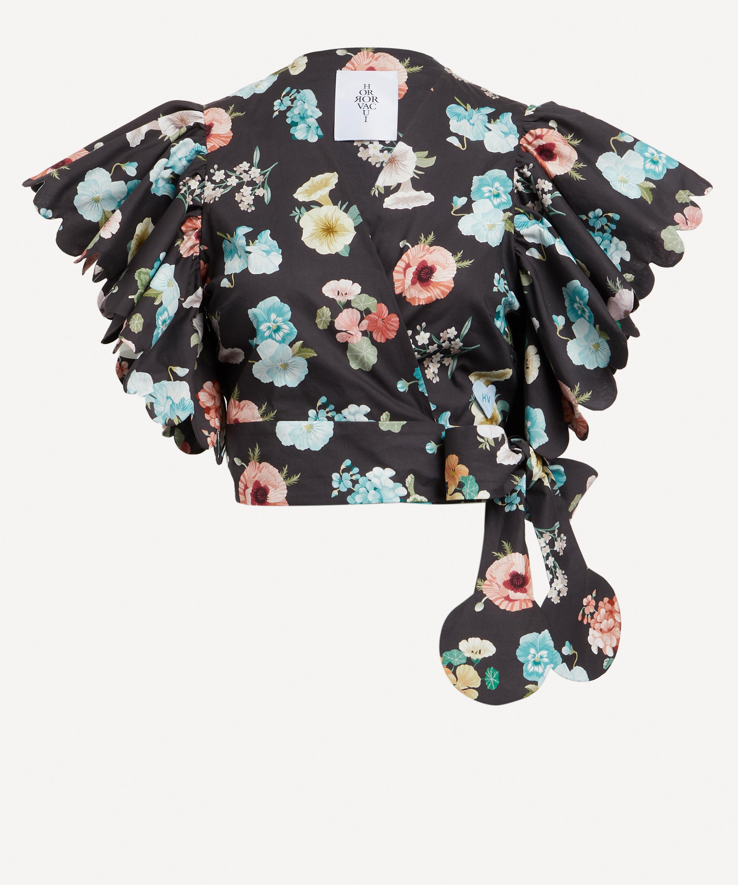 Fusing feminine frills with floral Liberty prints, Munich-based label Horror Vacui presents the Arianna crop-top. Cut from Liberty’s classic Mrs Gardener Tana Lawn™ Cotton to a wrap-silhouette with a surplice neckline and an adjustable tie at the waist, it’s elevated by its scalloped-edged, short flutter-sleeves.