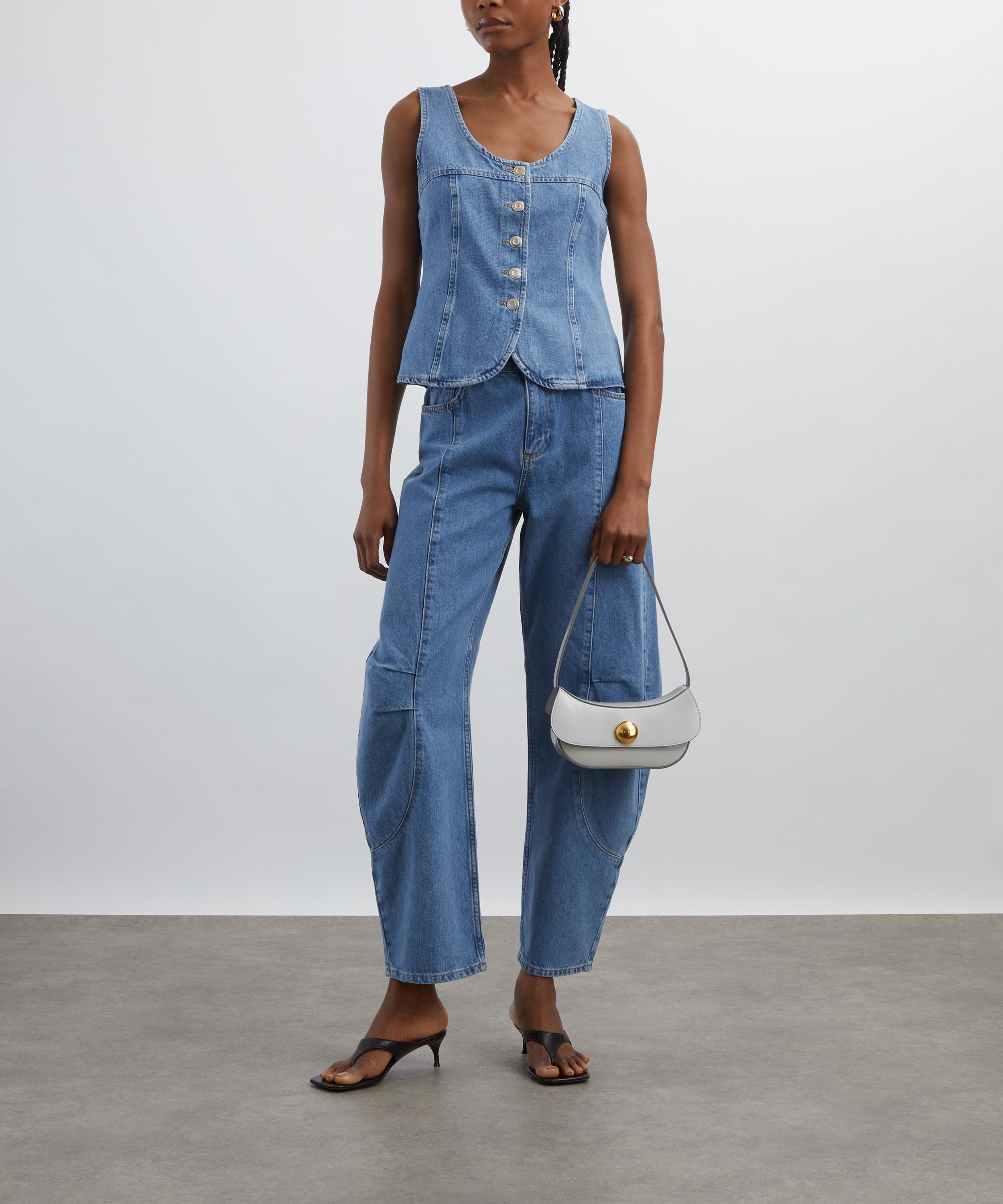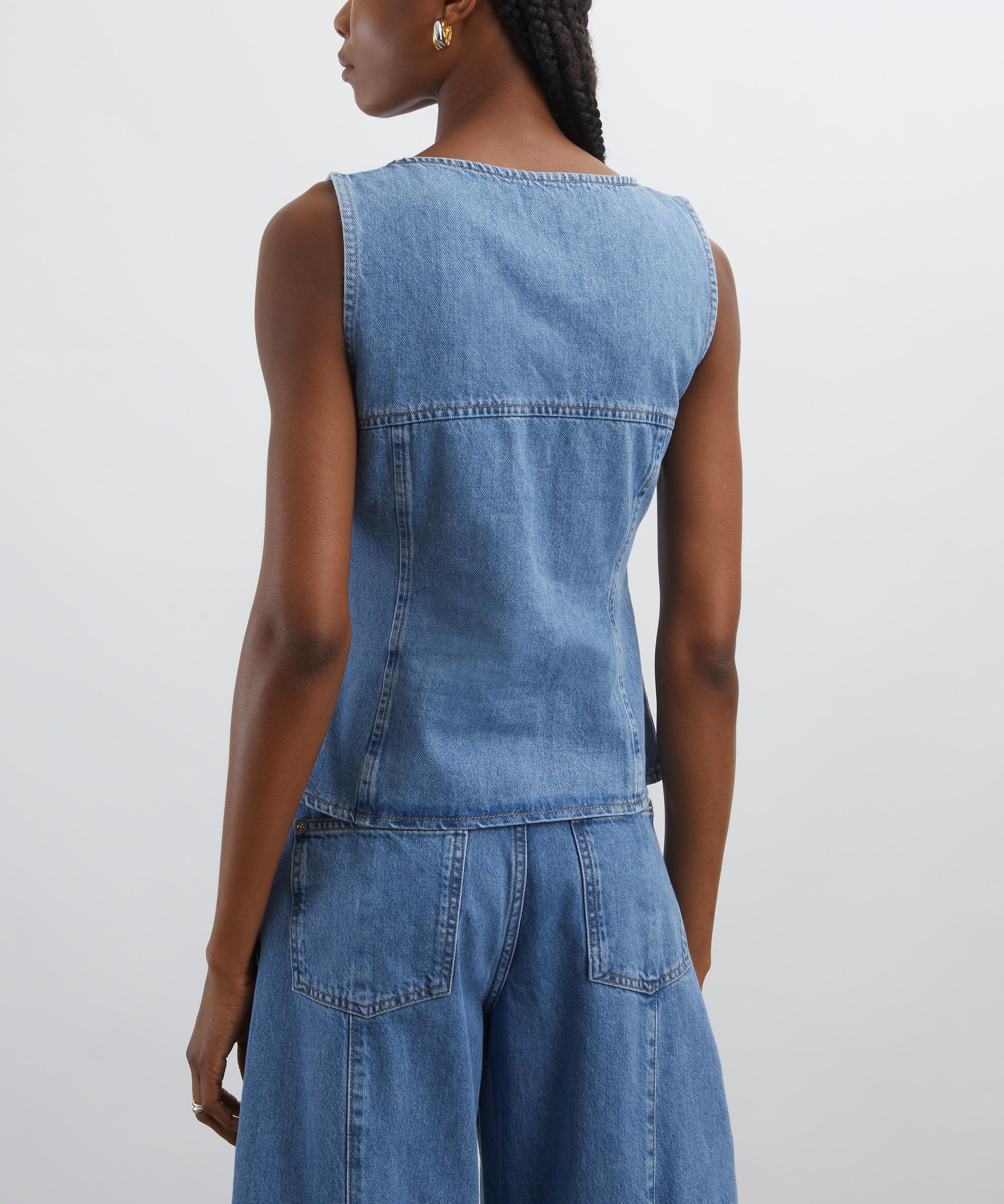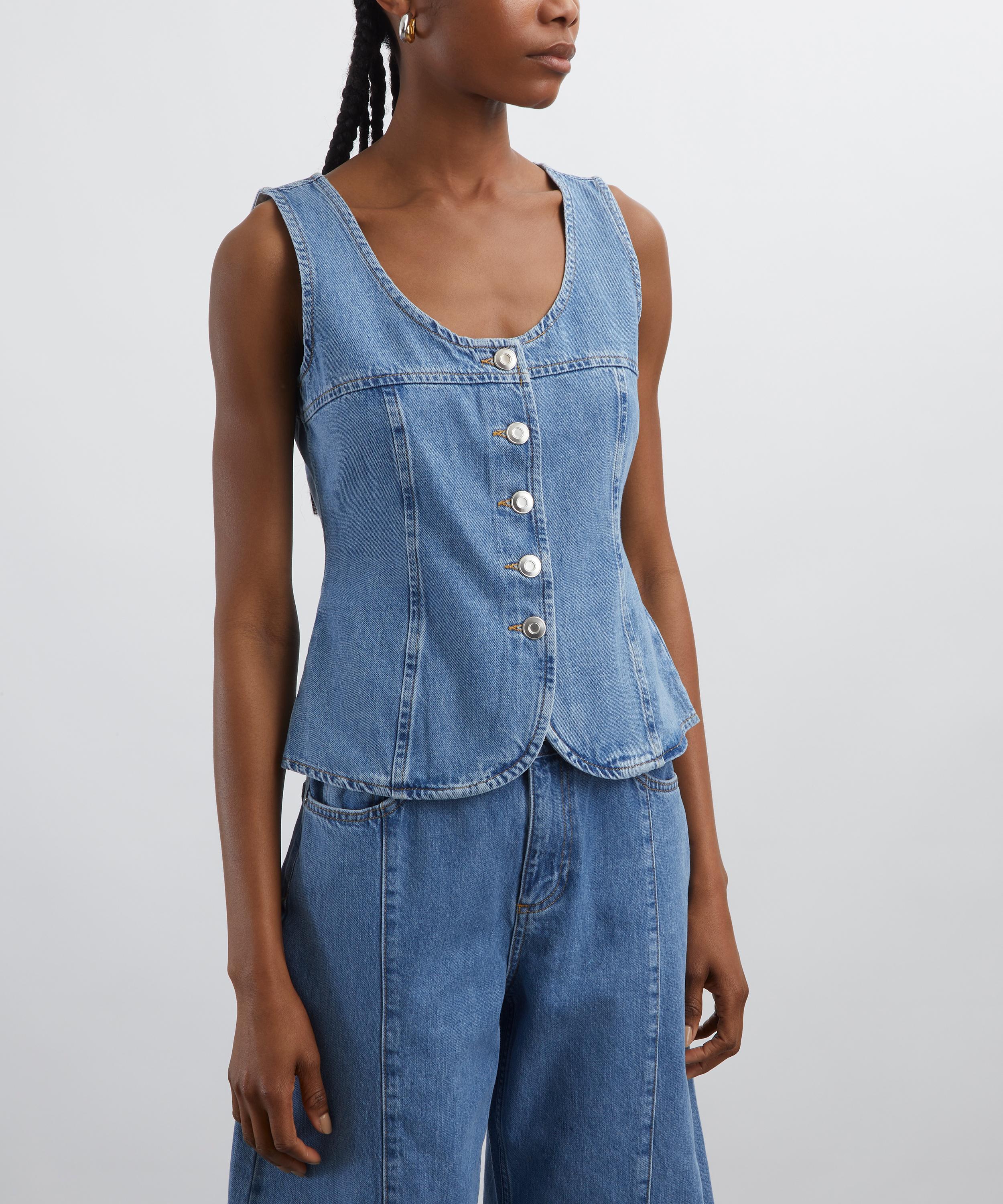 Crafted from cotton denim, this button-up top features a scoop neckline and curved hem, offering a modern yet effortless silhouette perfect for warm-weather dressing.