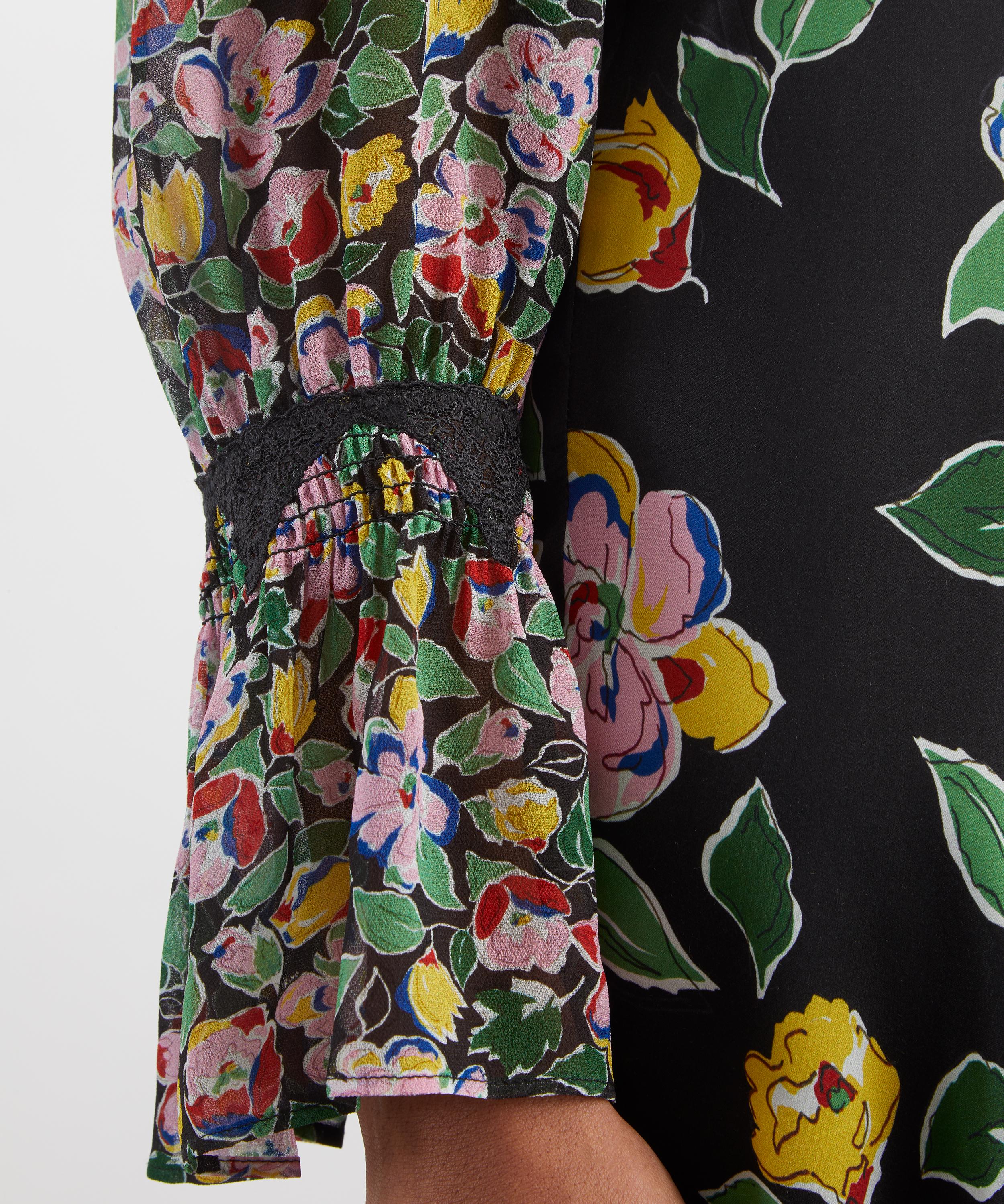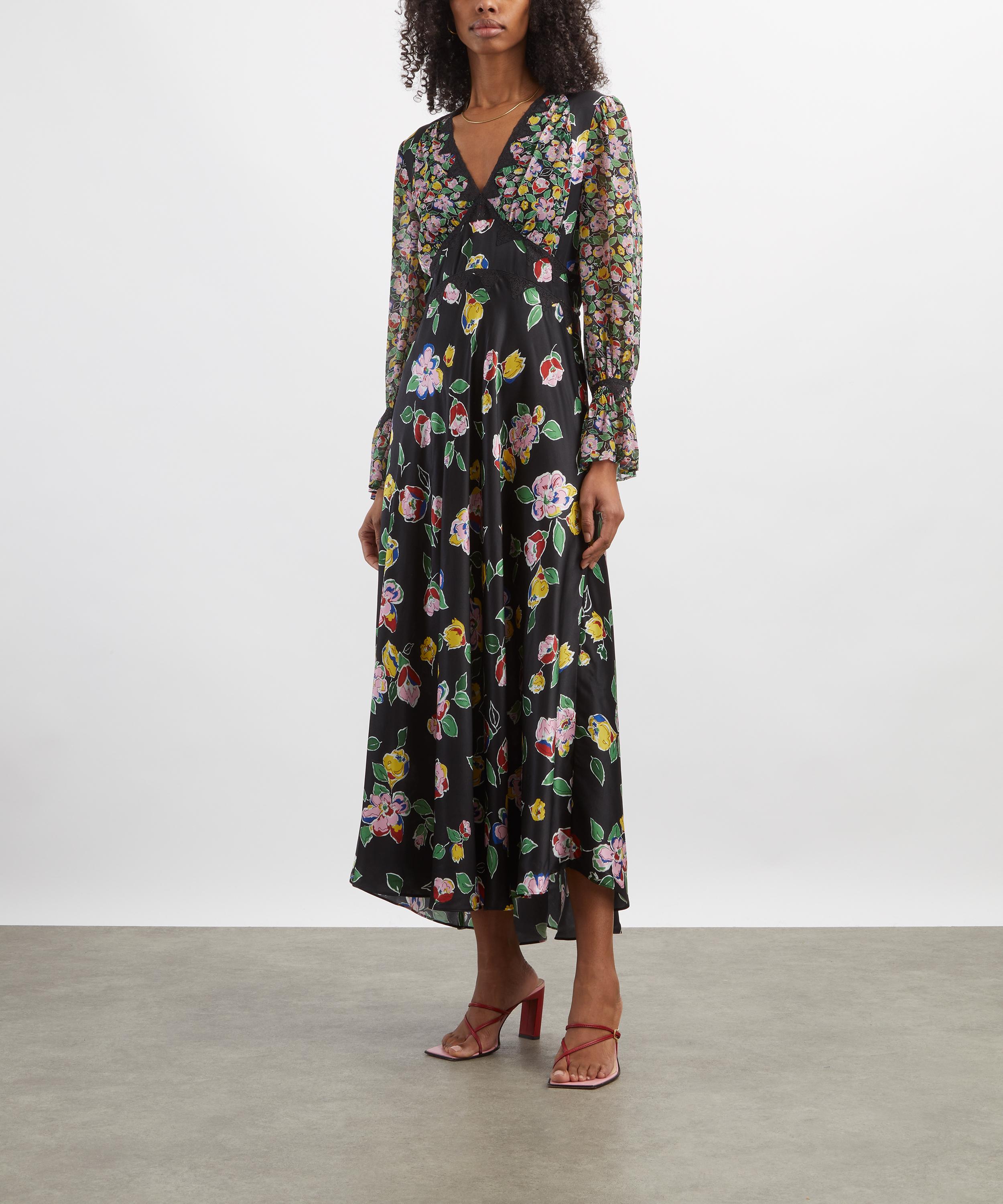 Crafted from a sumptuous silk-satin blend, this romantic, vintage-inspired dress features whimsical florals and delicate lace trims for timeless occasion appeal. A deep V-neckline and long sleeves frame the silhouette, while the empire waist flows into a graceful ankle-length skirt.