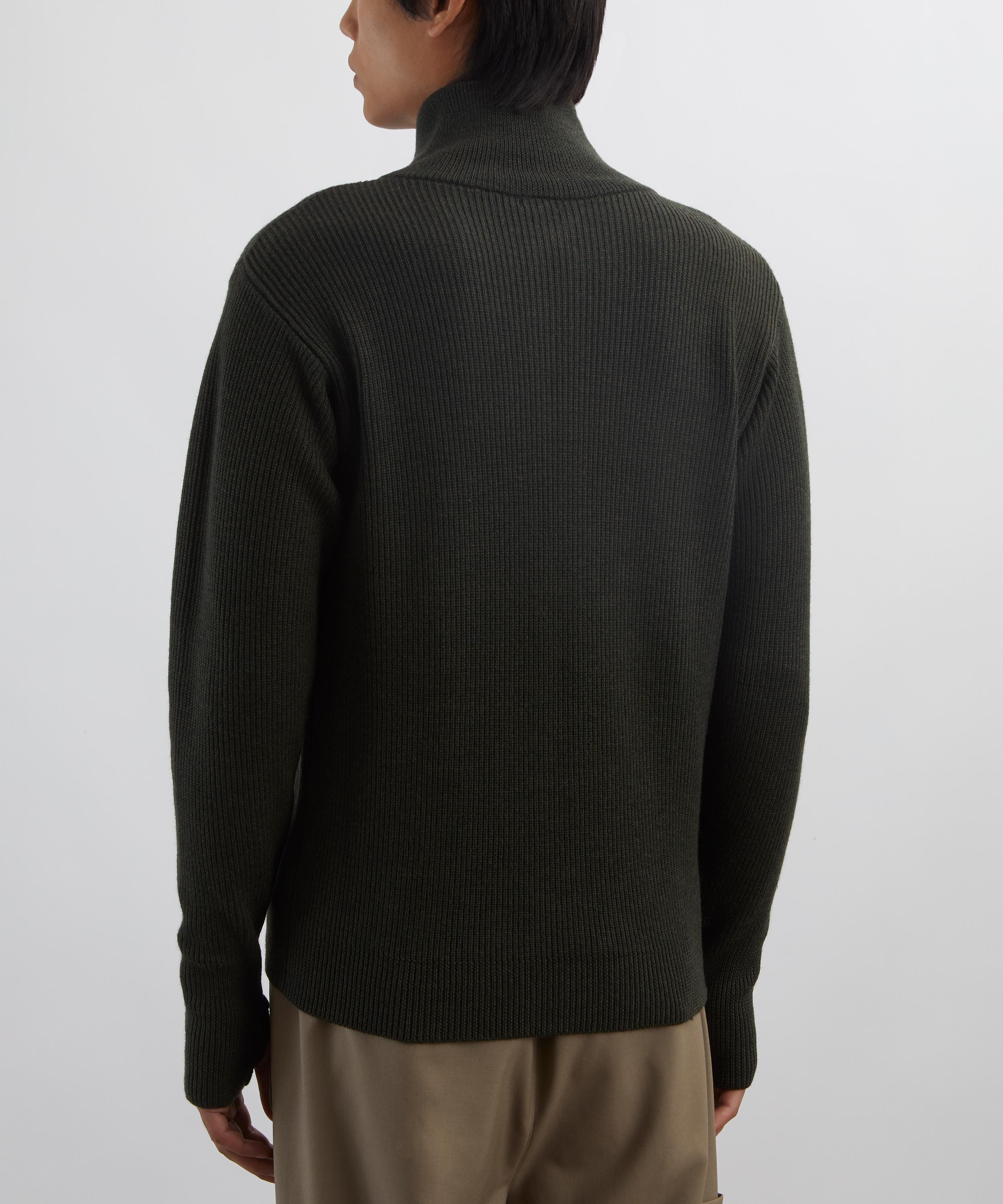 Finely knitted in Italy from virgin wool in a classic army-green hue, this rib-knit cardigan features a cosy turtleneck, thumbholes at the cuffs for added warmth, and a double-ended zip fastening for versatile styling.