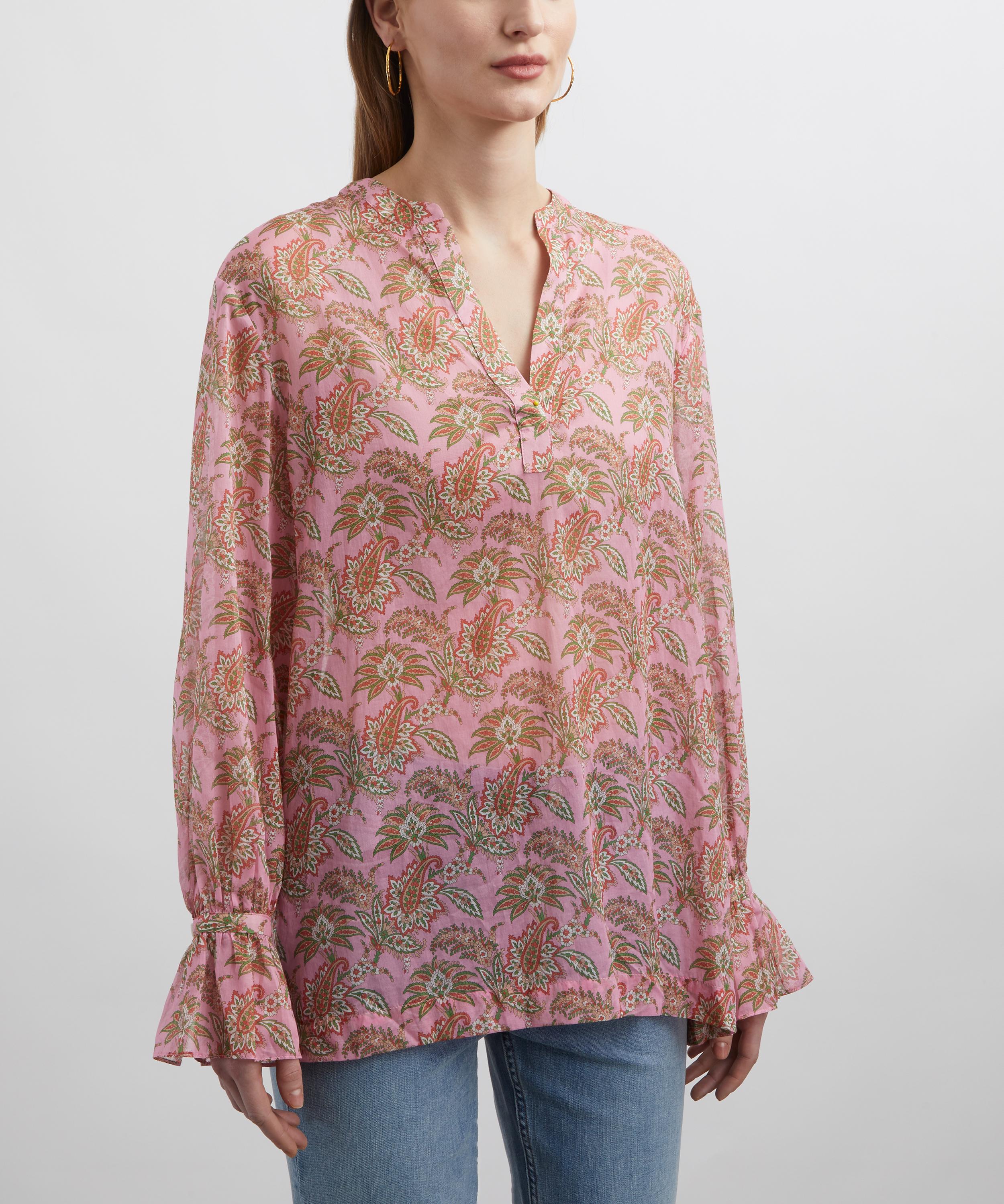 Crafted from luxurious, lightweight cotton chiffon, this breezy blouse features a relaxed silhouette that gracefully flatters the figure. With an open neckline and loose, long sleeves with flared cuffs, it’s the perfect piece for effortless summer style.