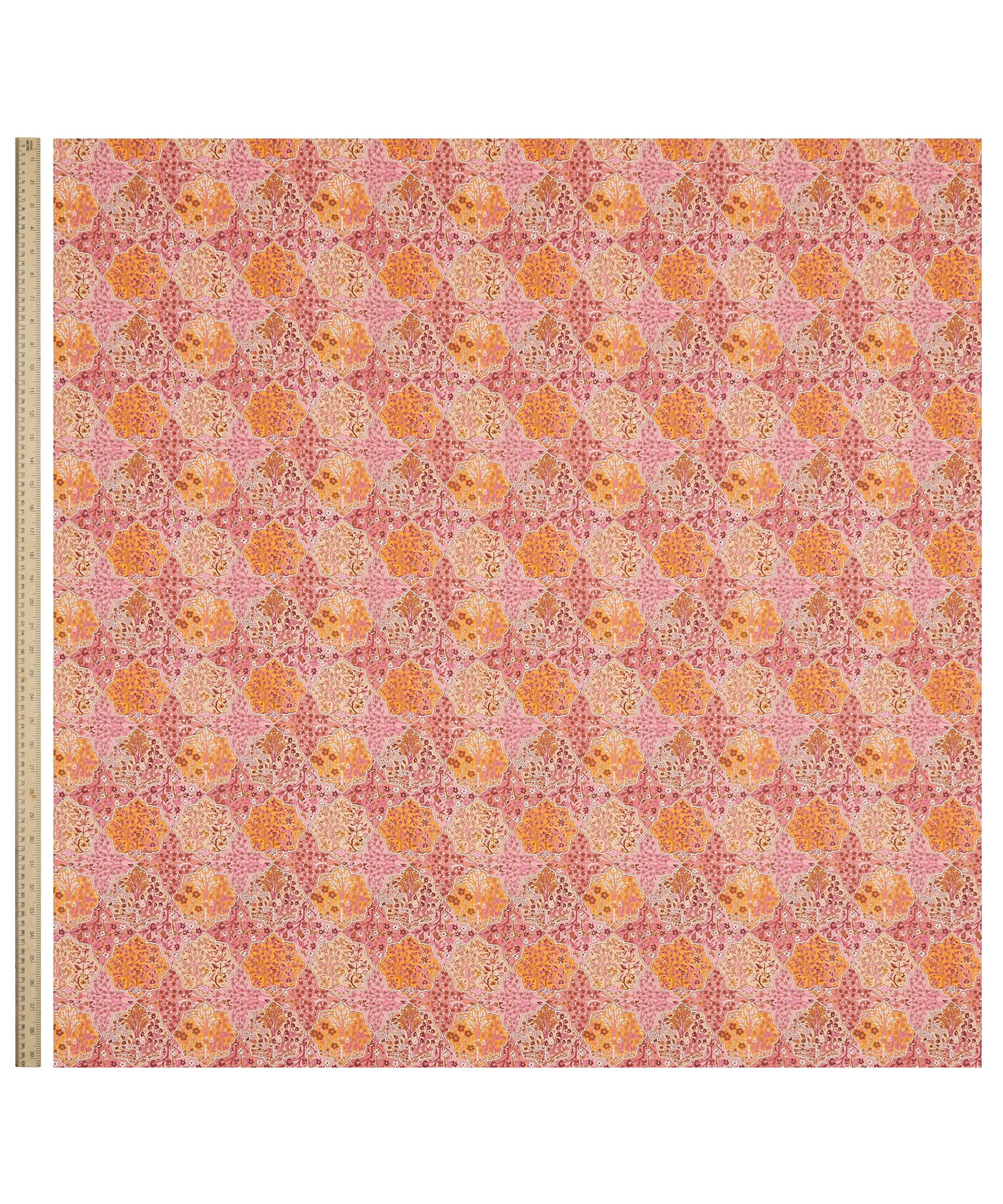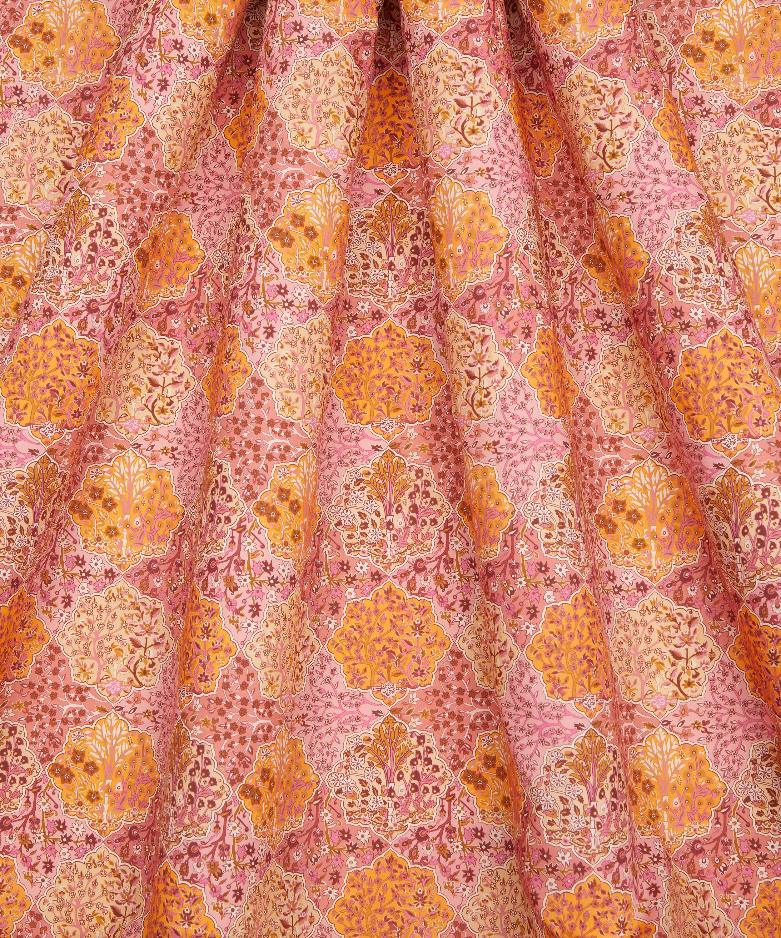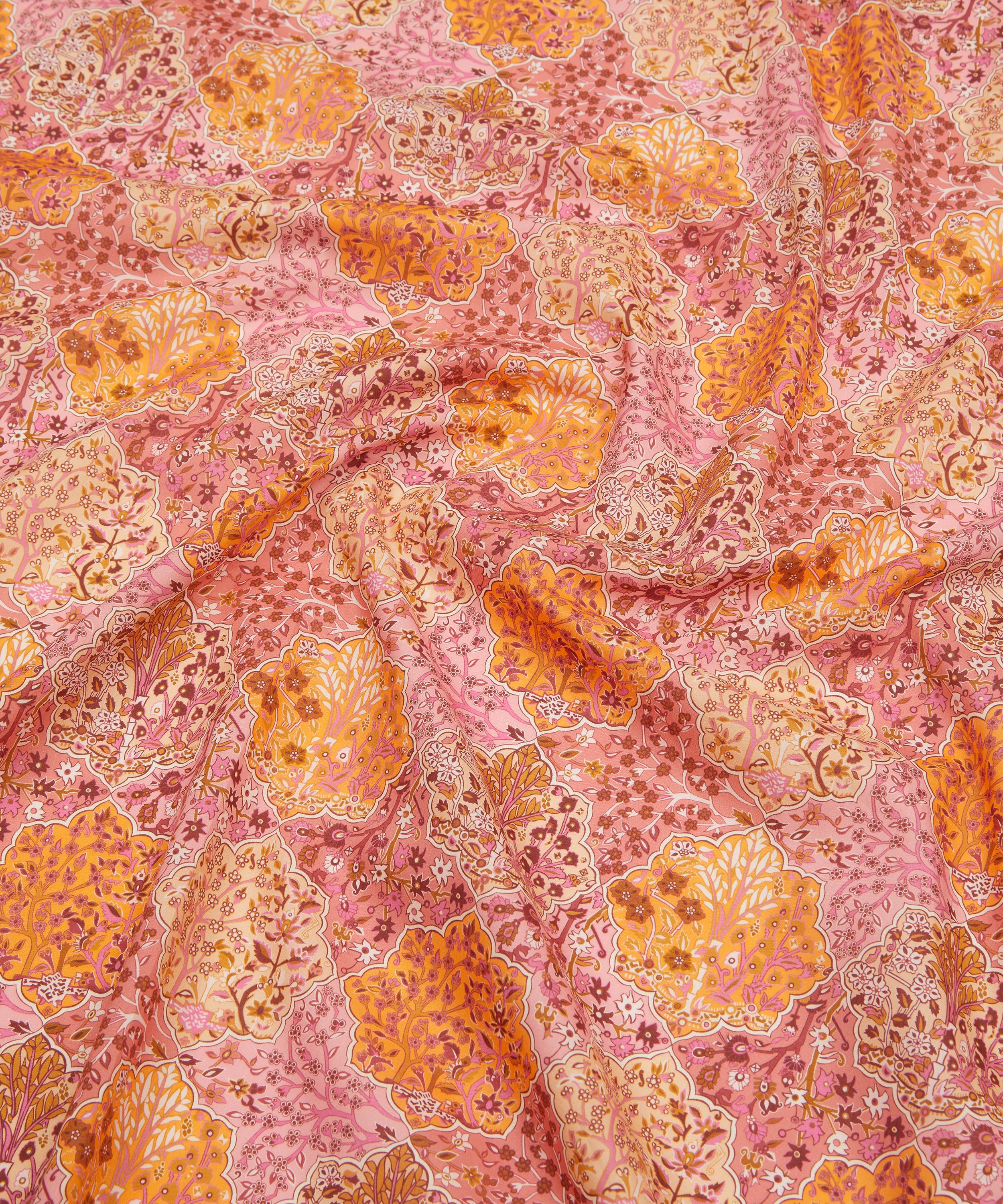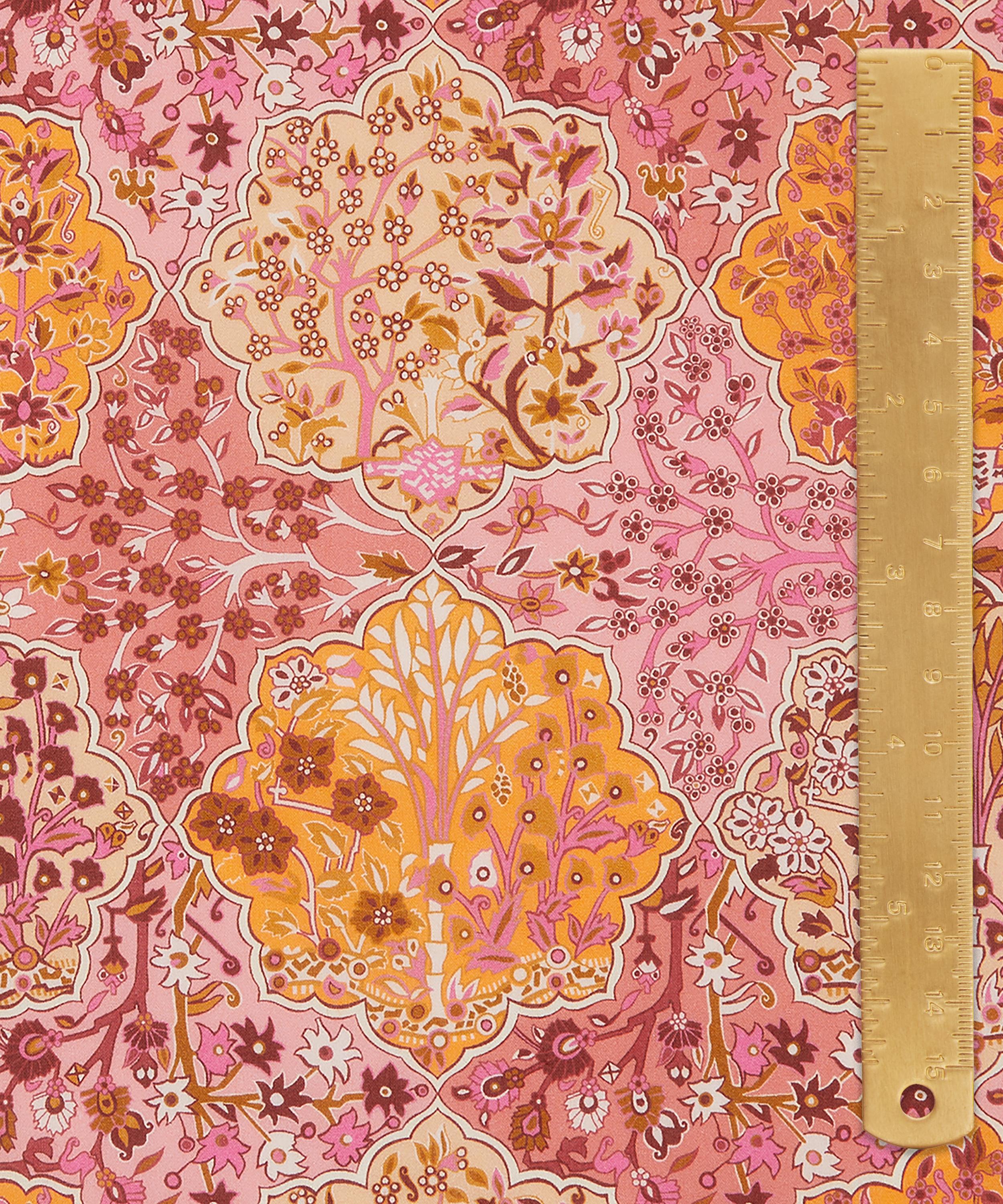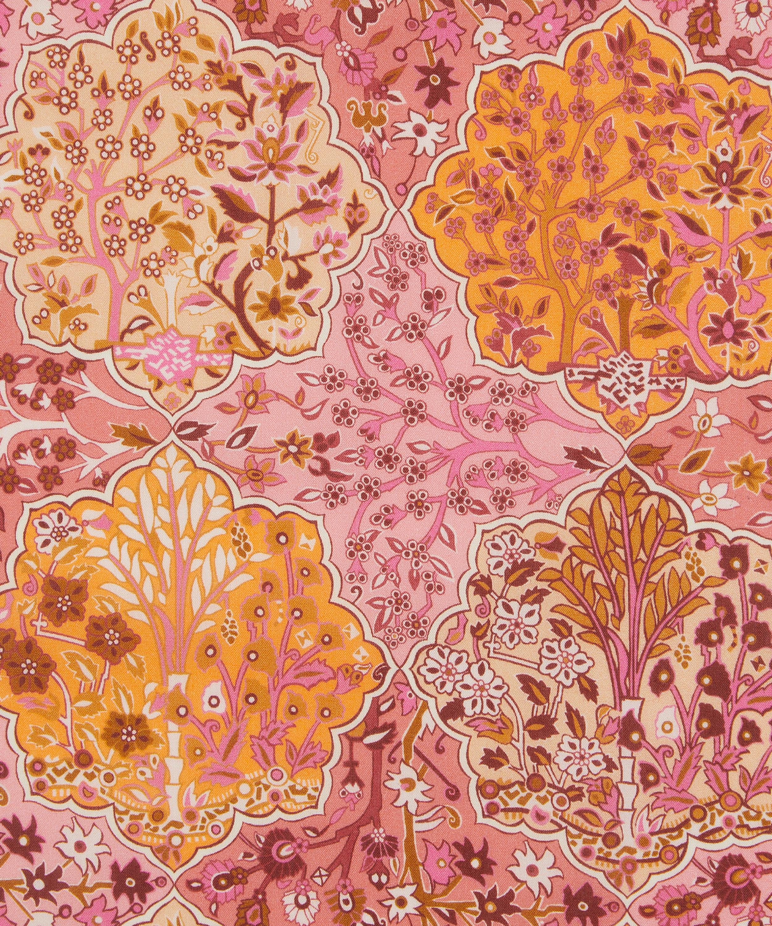 Derived from a Liberty scarf design originally printed in the late 1980s, Aspley Tile features a highly ornamental composition influenced by traditional Persian and Middle Eastern motifs. Meticulously detailed flowering trees are framed within intricate medallion shapes, evoking the richness of a finely woven patchwork tapestry.