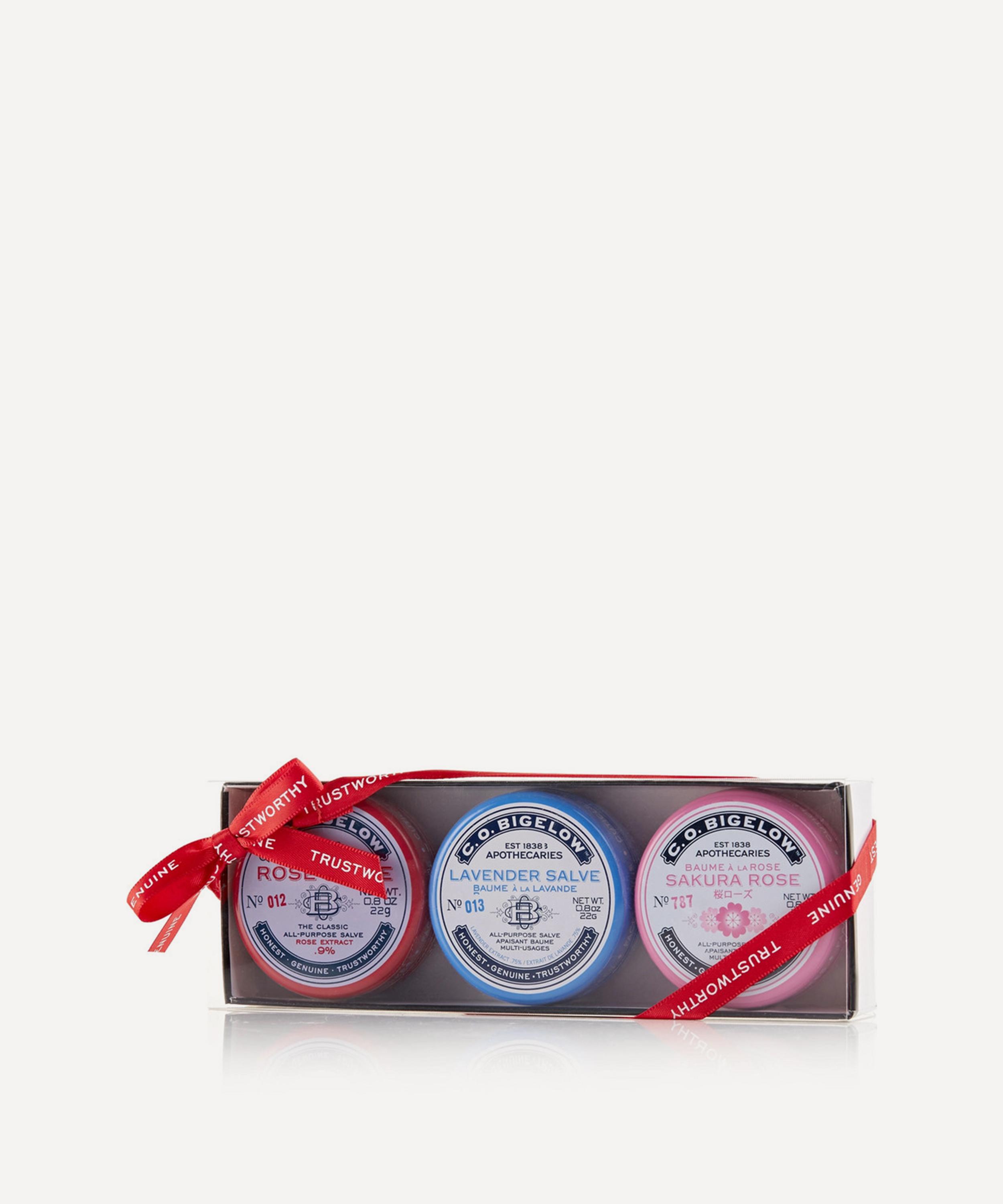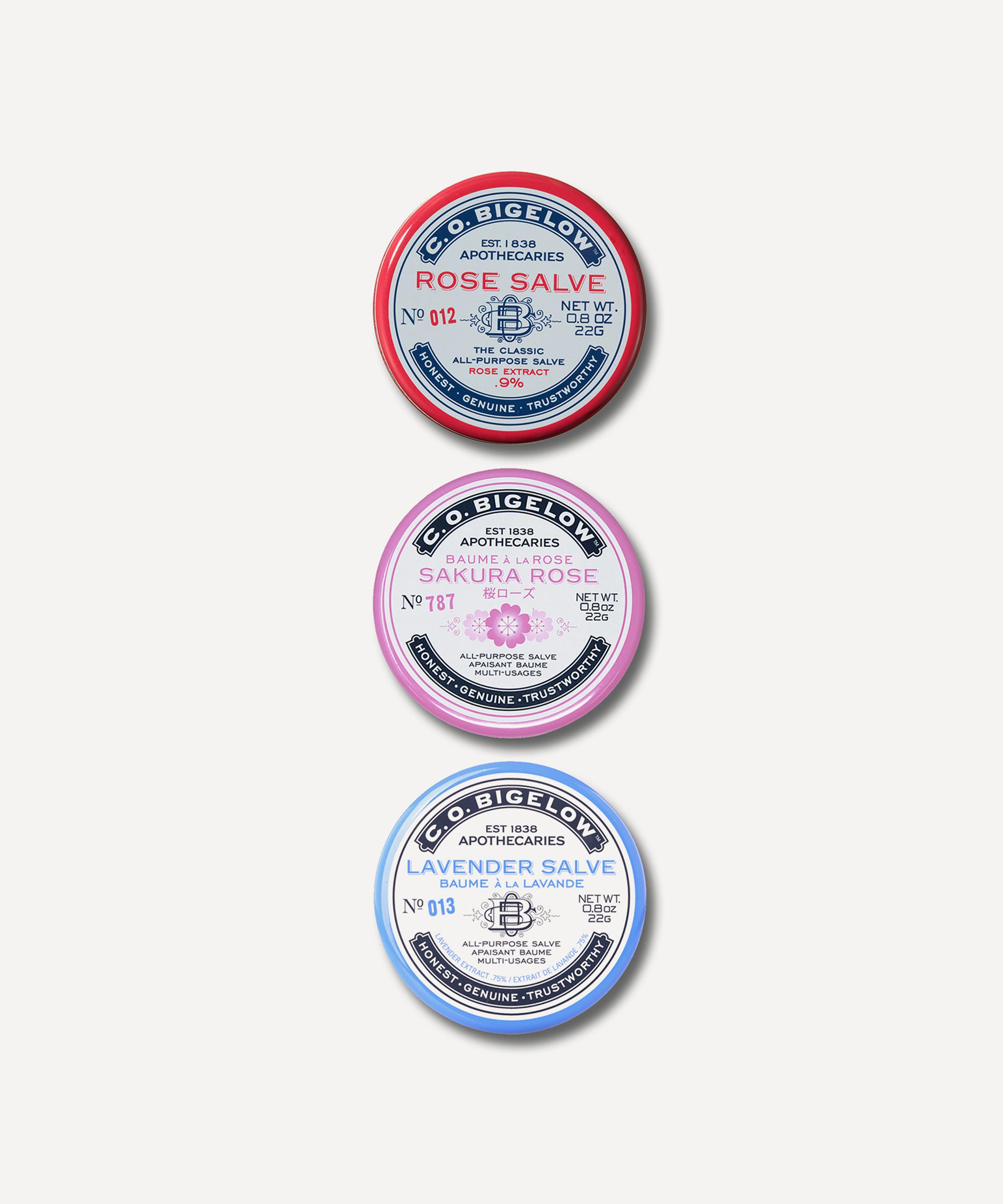 Explore an icon of the C.O. Bigelow collection with this three-piece set of multi-purpose lip salves in Rose, Sakura Rose and Lavender scents - each presented in a classic tin rendition.