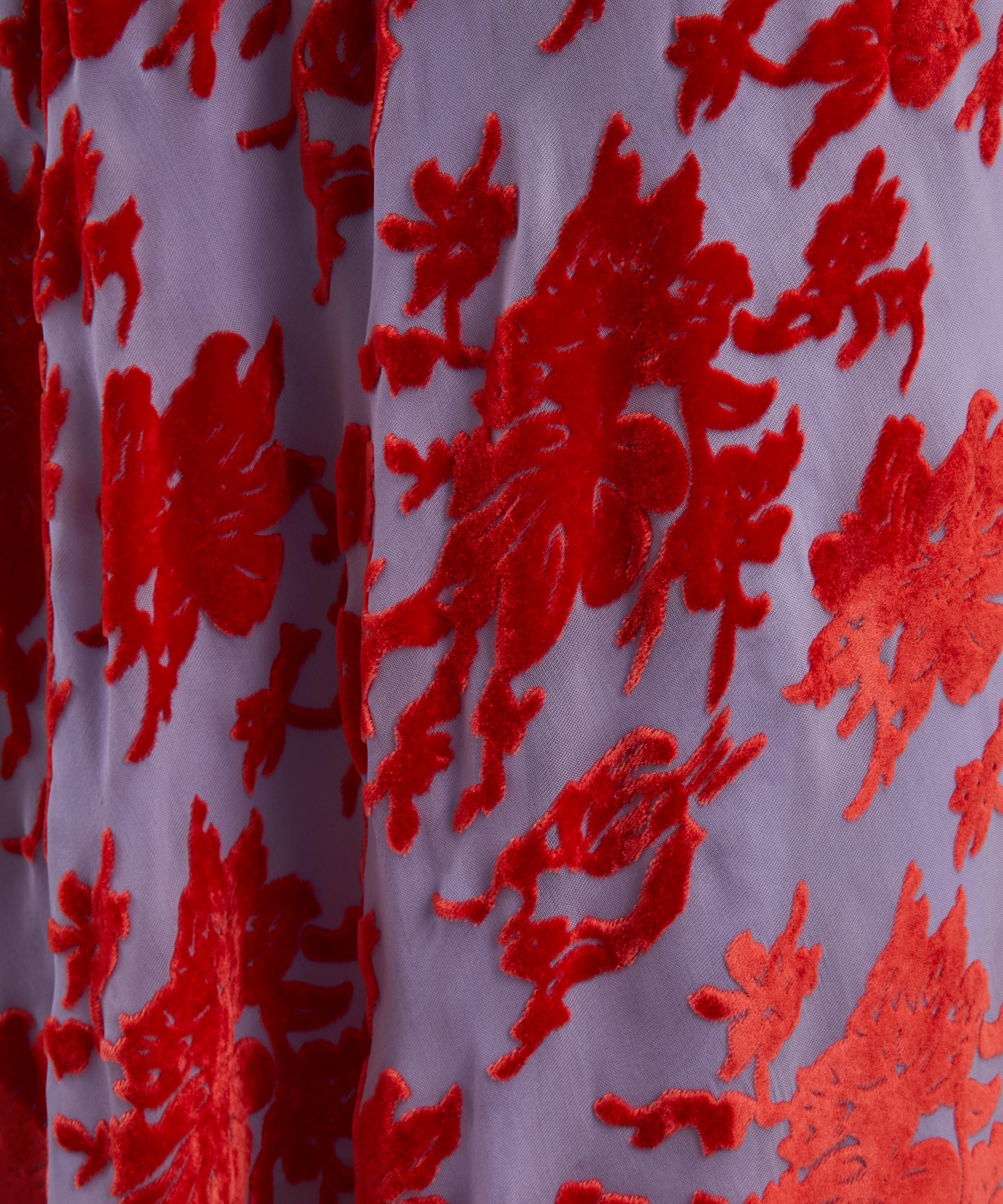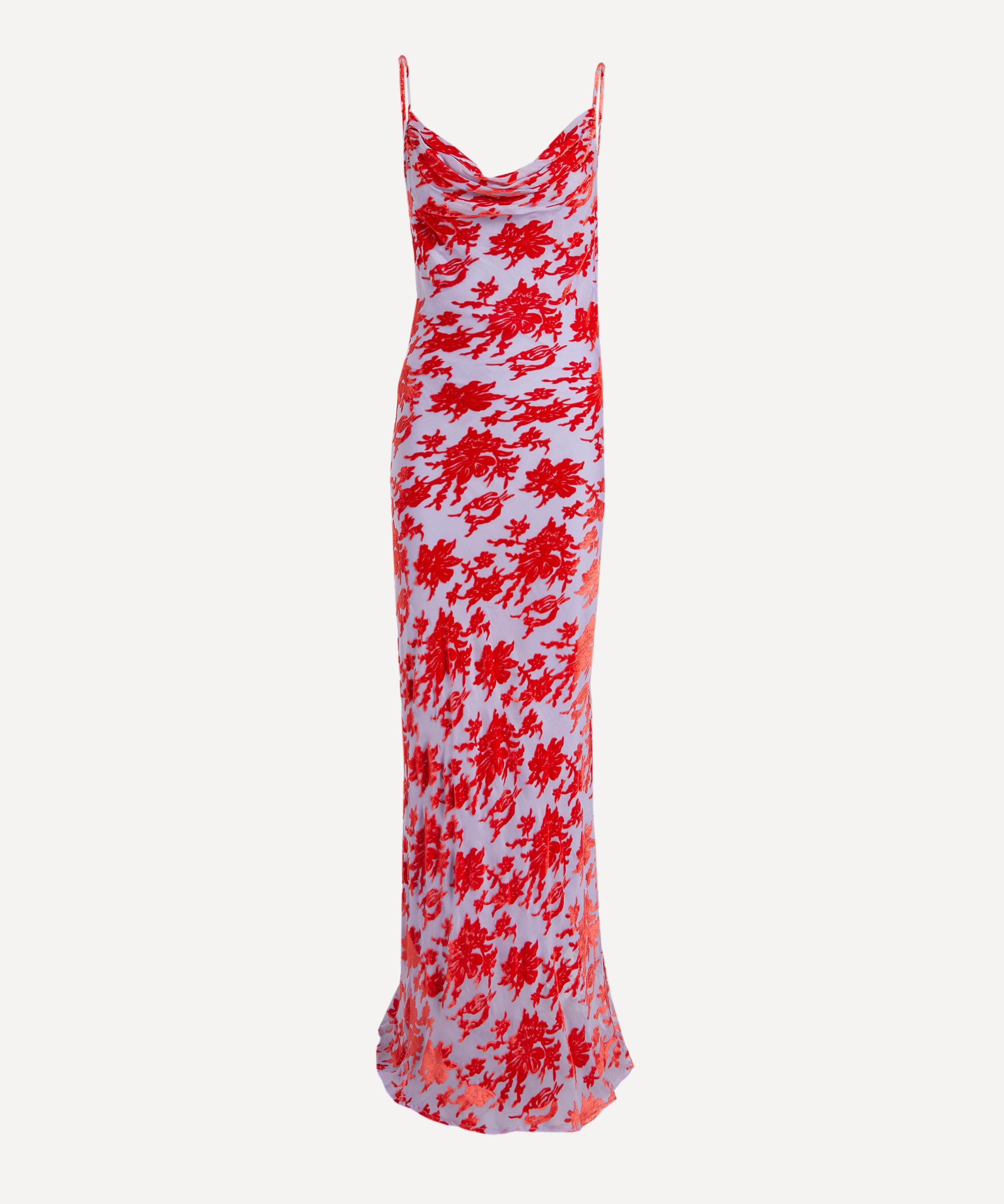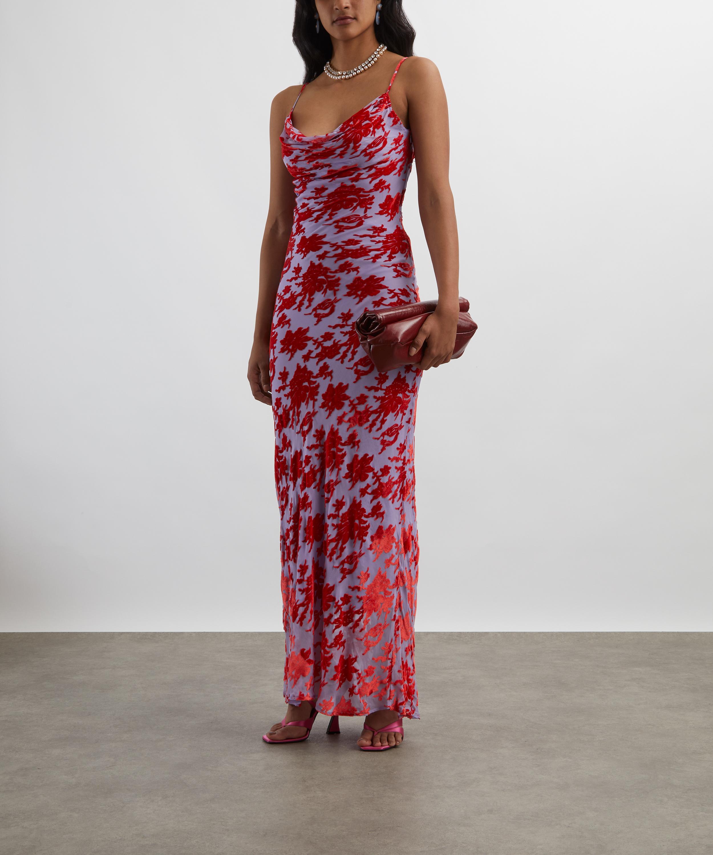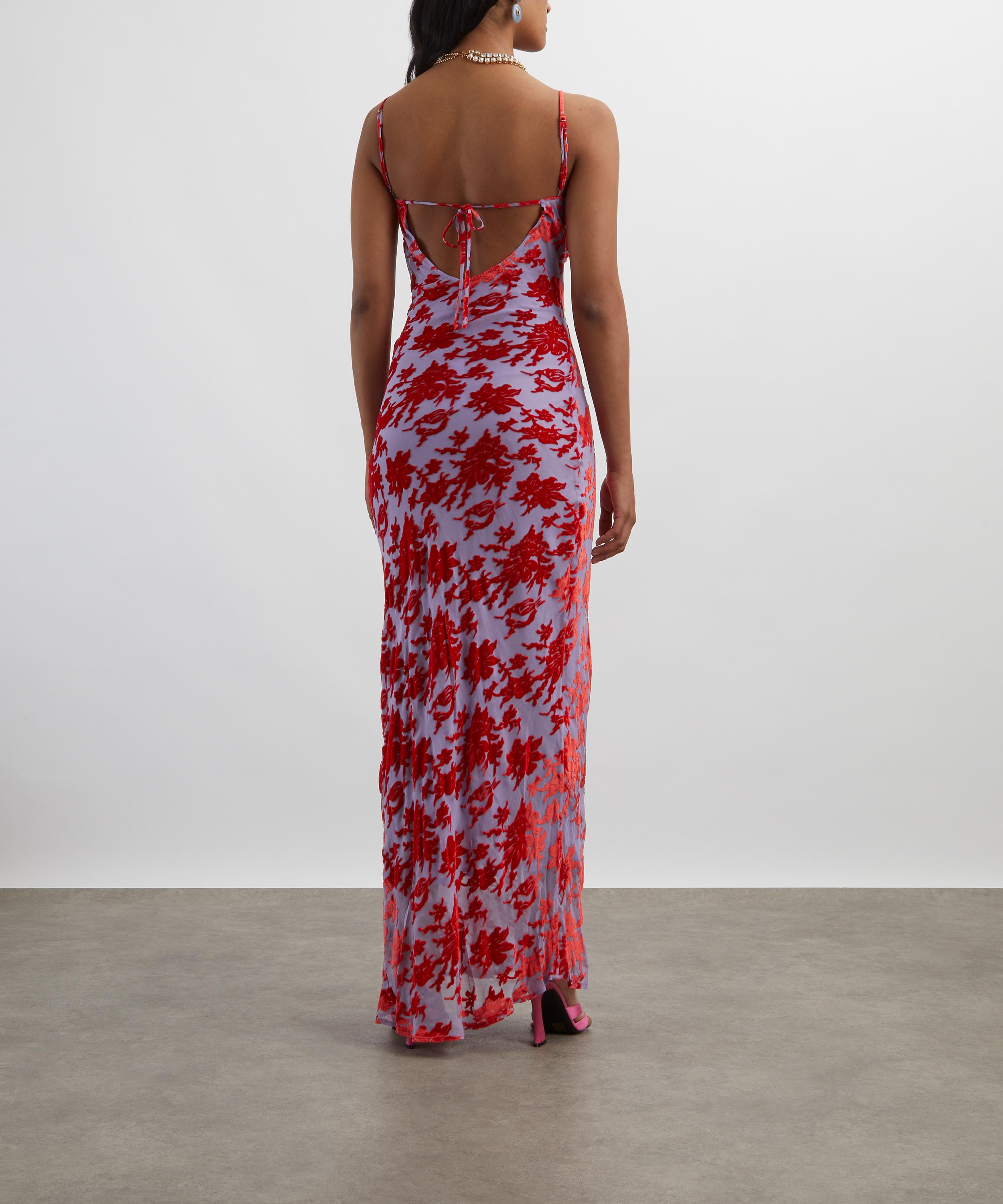 Crafted from semi-sheer silk devoreé and emblazoned with red velvety florals, this maxi dress exudes sophistication with its figure-skimming sheath silhouette, cowl neckline, and open back.