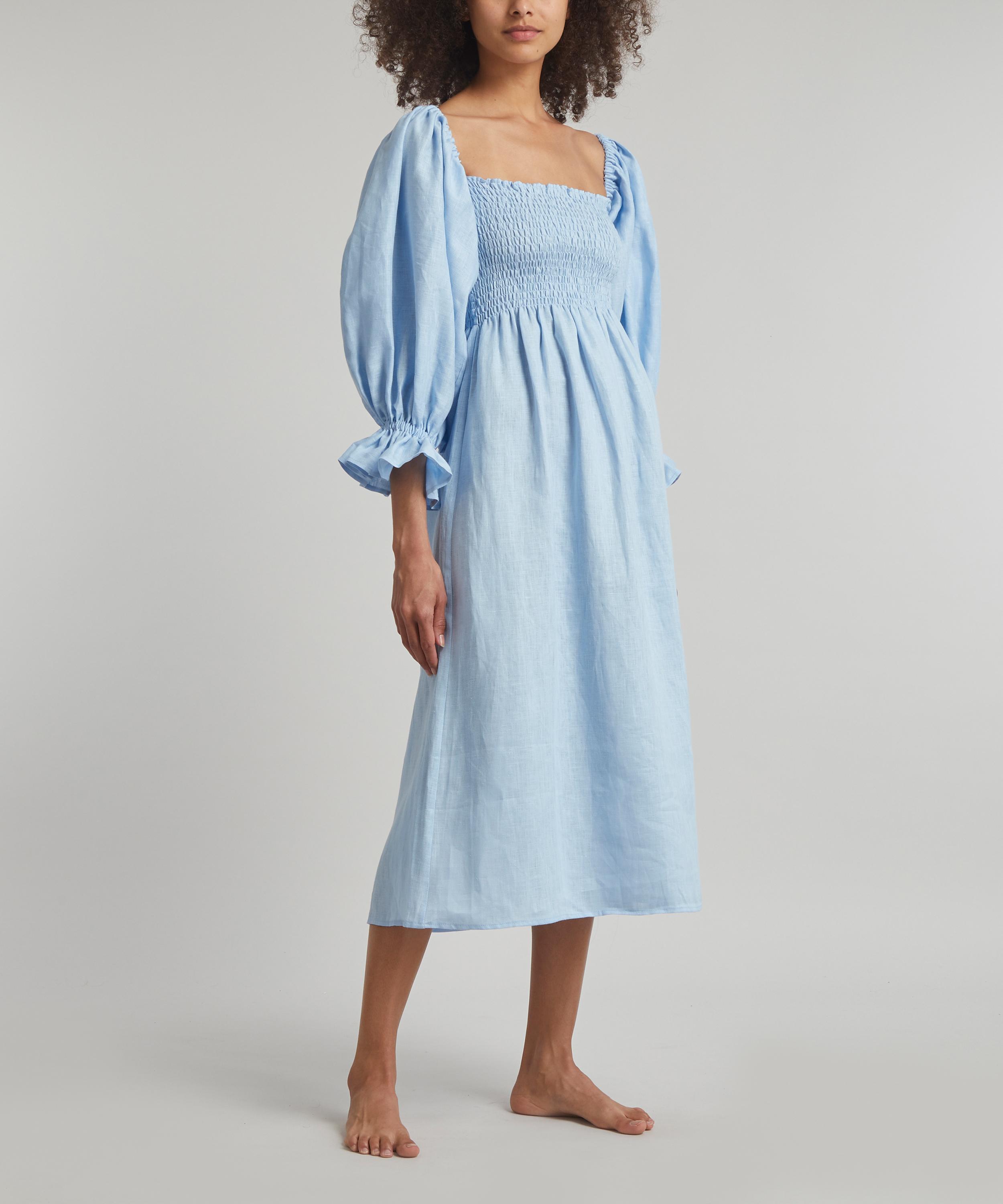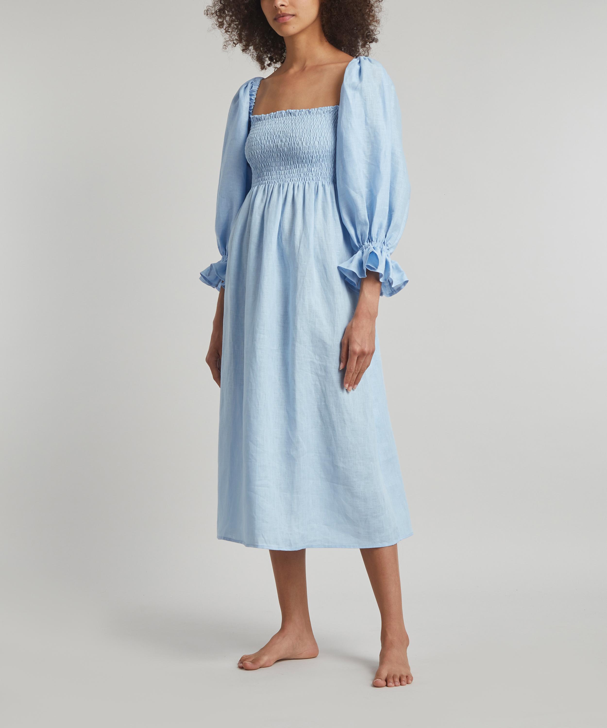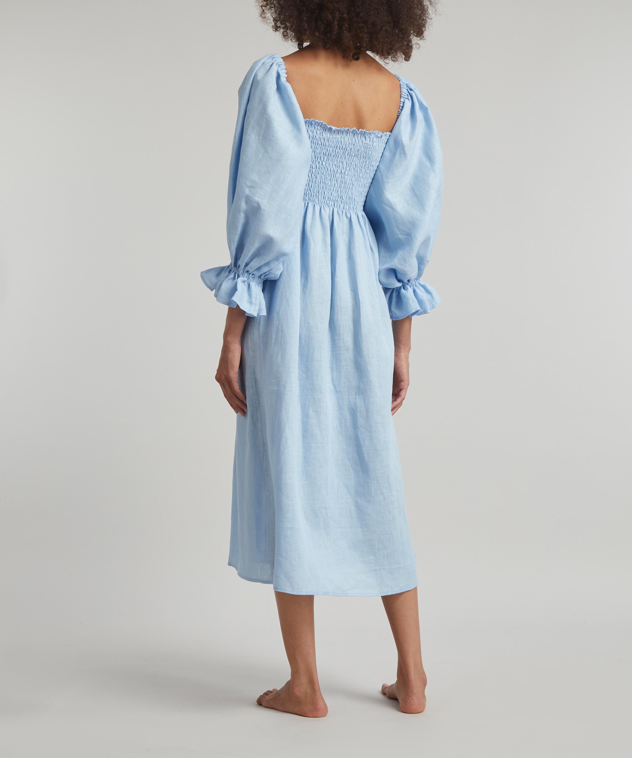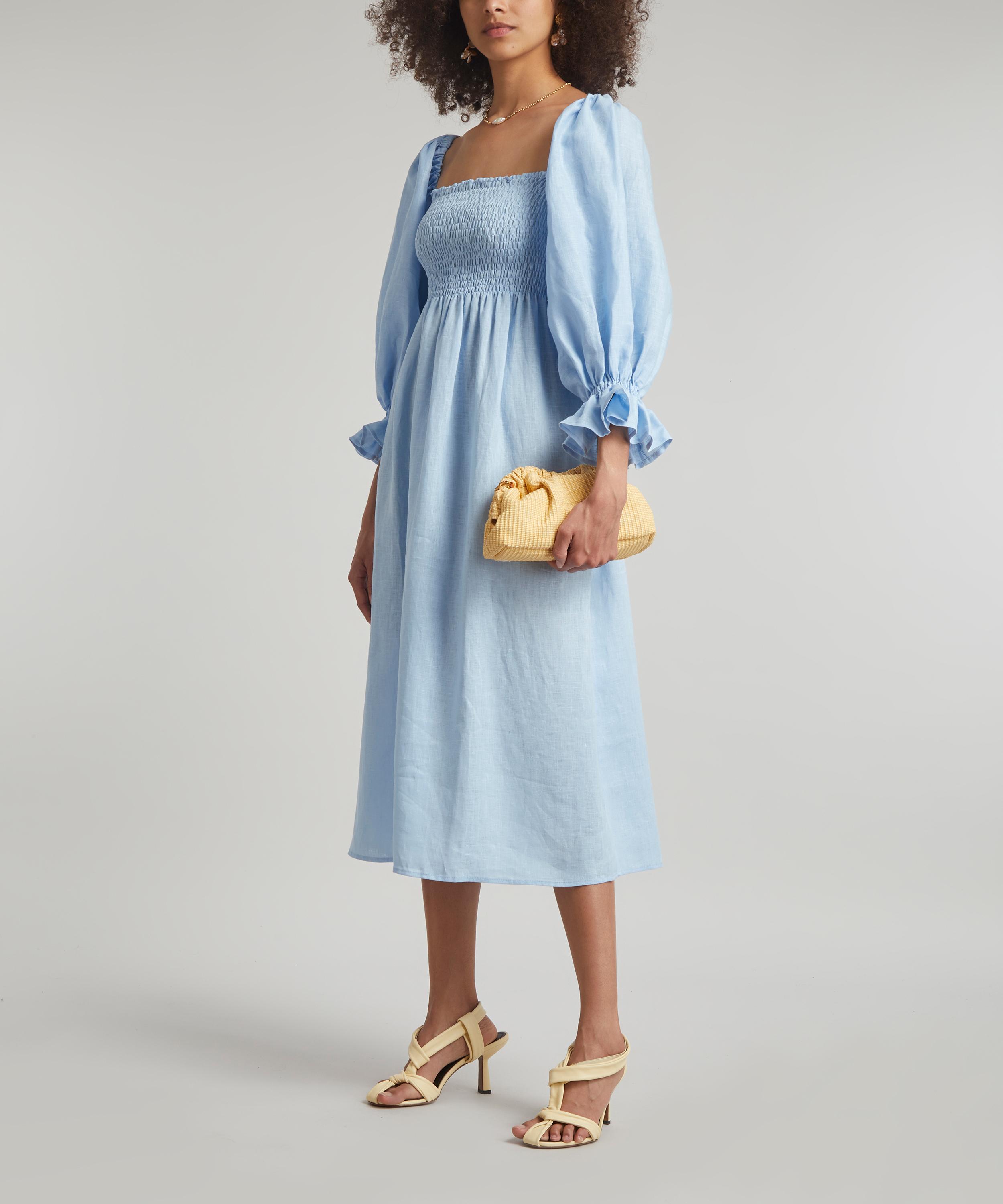 Crafted from ethically sourced, baby-blue linen, this joyful gown has dramatic puff-sleeves that can be worn on or off the shoulders. The smocked bodice and ruffled cuffs reference detailing found on vintage pieces – pair it with strappy lemon-yellow sandals and a matching clutch for an elegant look.