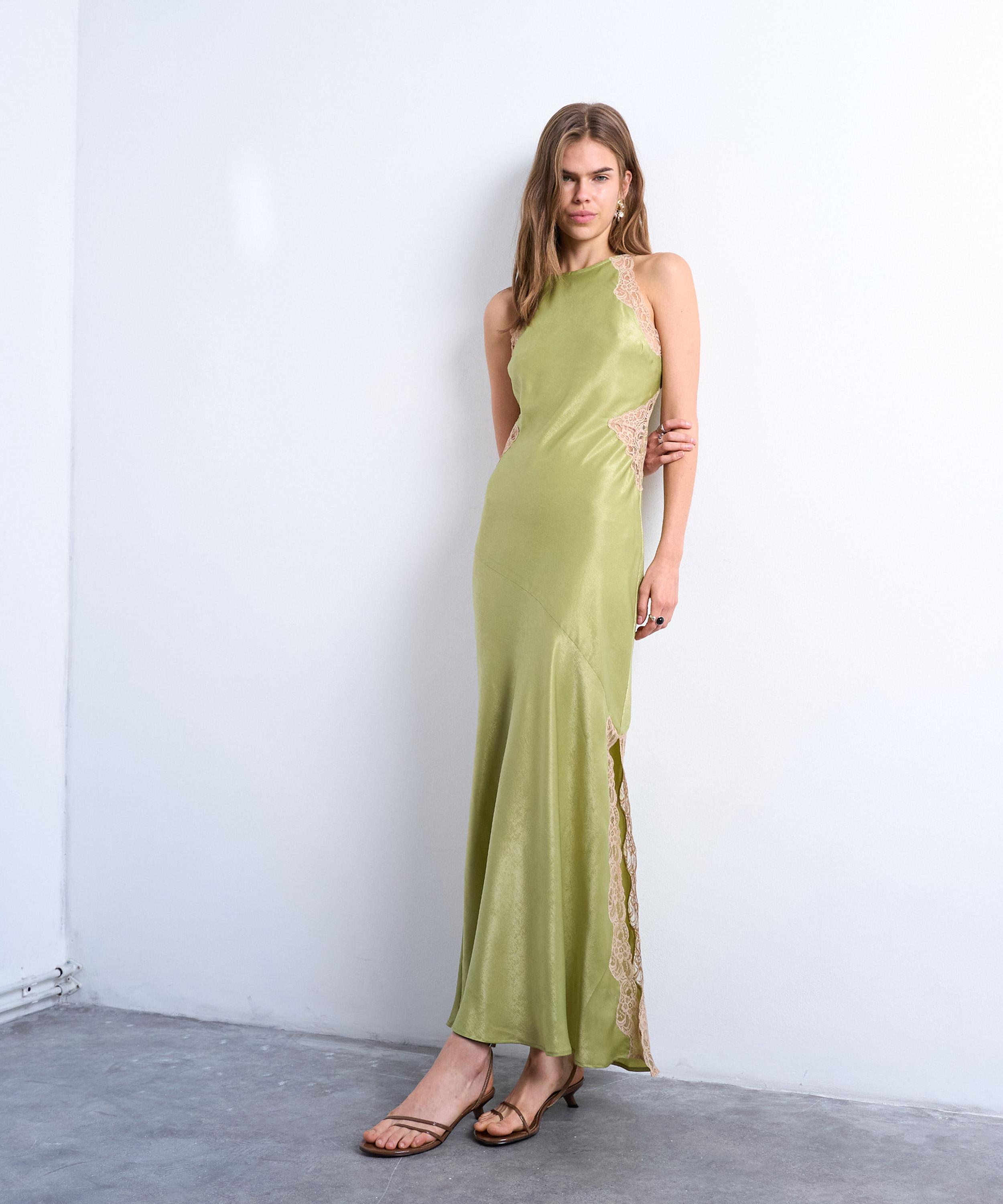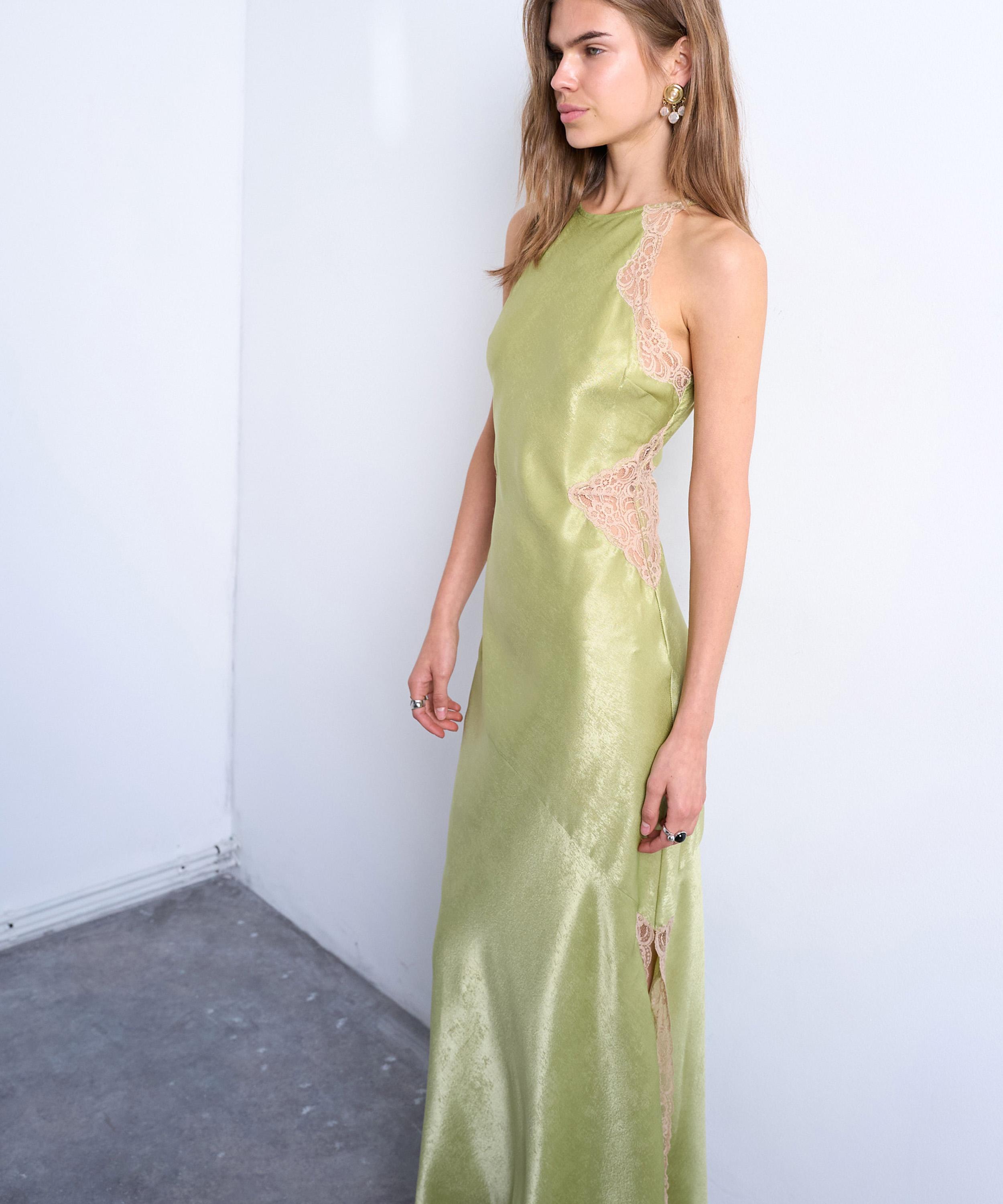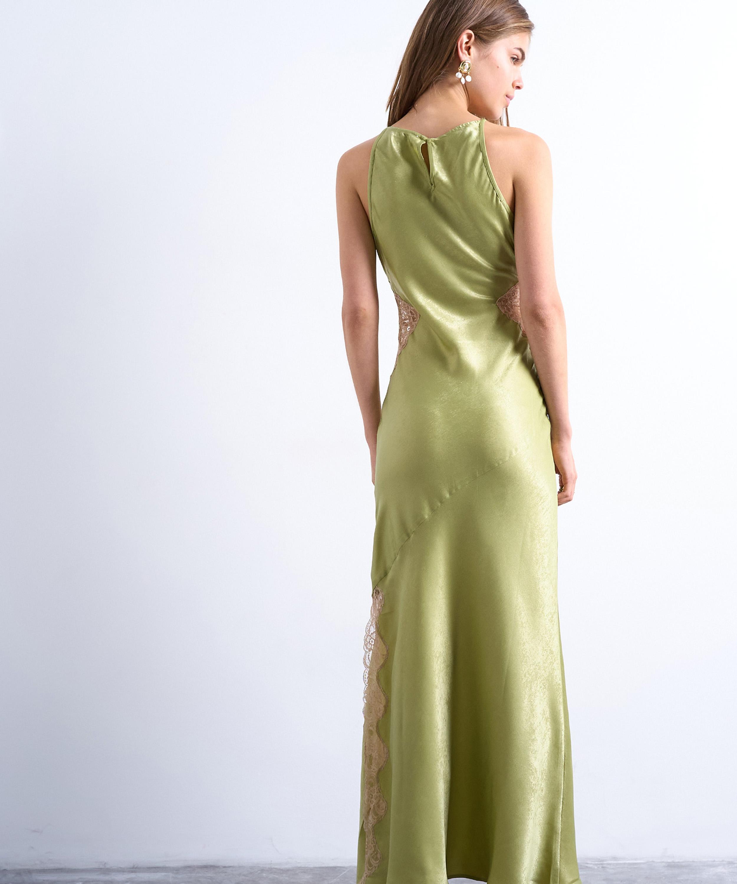 Crafted from glossy, satin-like fabric in a mellow green hue, this elegant midi dress features a racer front and back, accented with delicate lace inserts throughout for a subtly sensual finish.