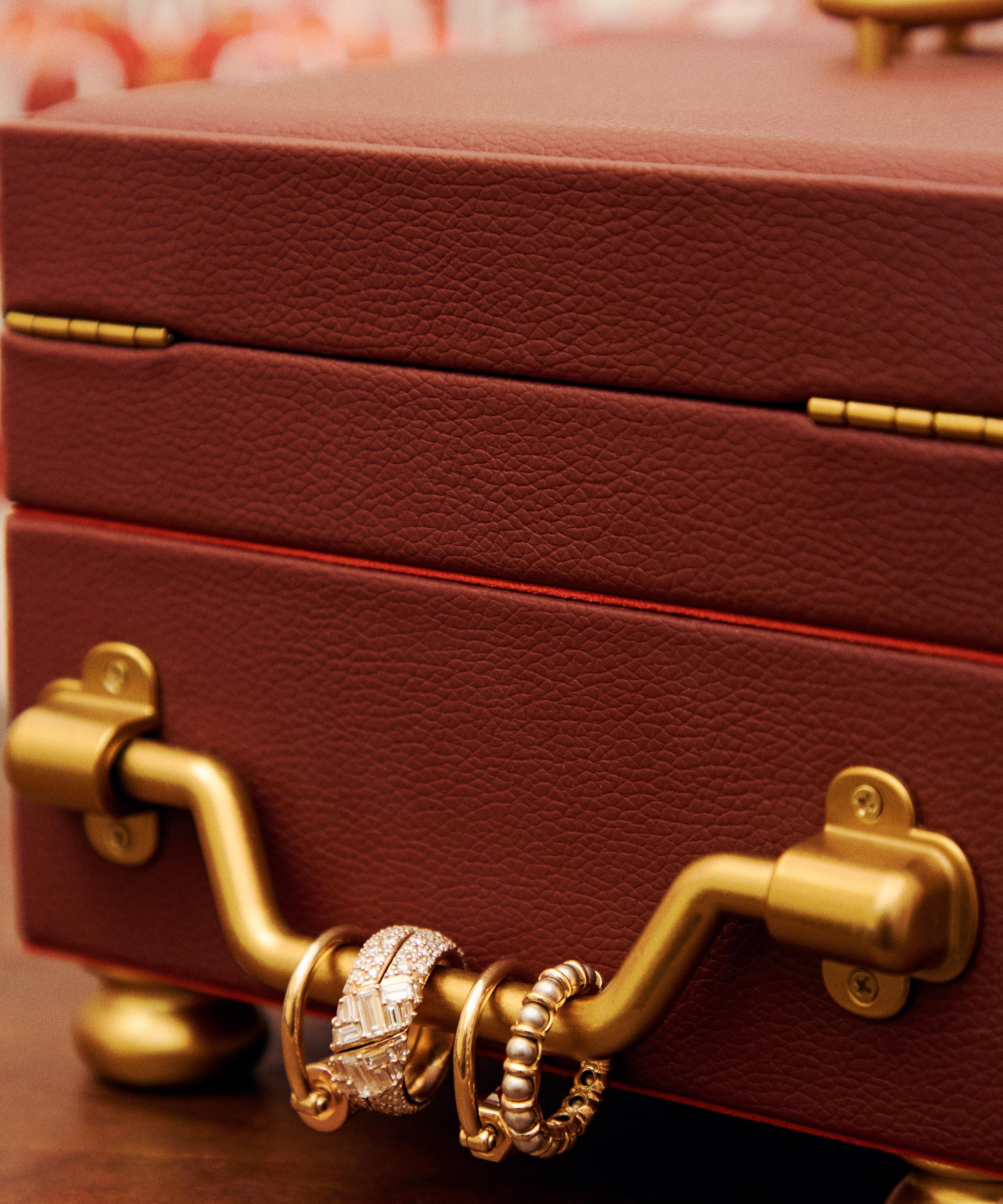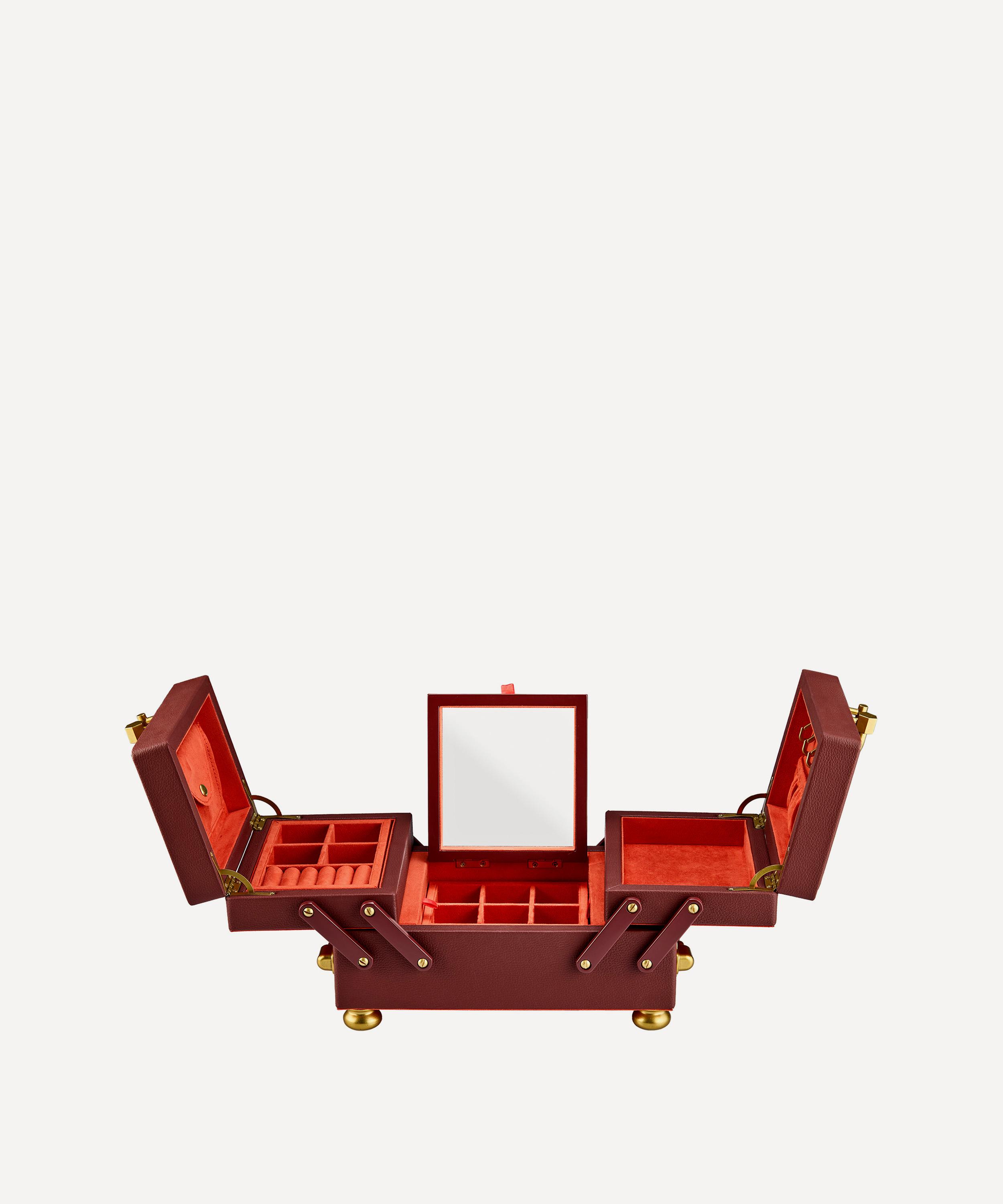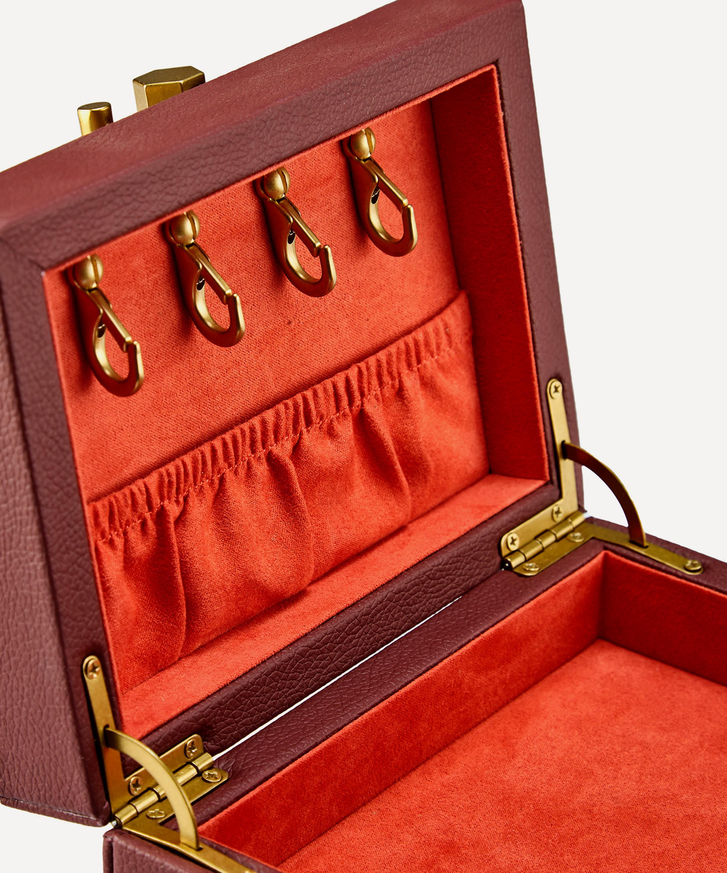Crafted in faux leather, it’s a feat of precision engineering with carry handles on either side and two removable trays that you can fill and store either inside or outside the box. It opens and closes with a satisfying tactility due to the brand’s signature lock mechanism – inside you’ll find a wall of brass hooks that are perfect for hanging chains and necklaces, an envelope pocket for important papers, two secret compartments and a mirror. Whether used for housing letters and meaningful mementos or your favourite jewellery pieces, it holds space – both literal and symbolic – for the stories we choose to carry.