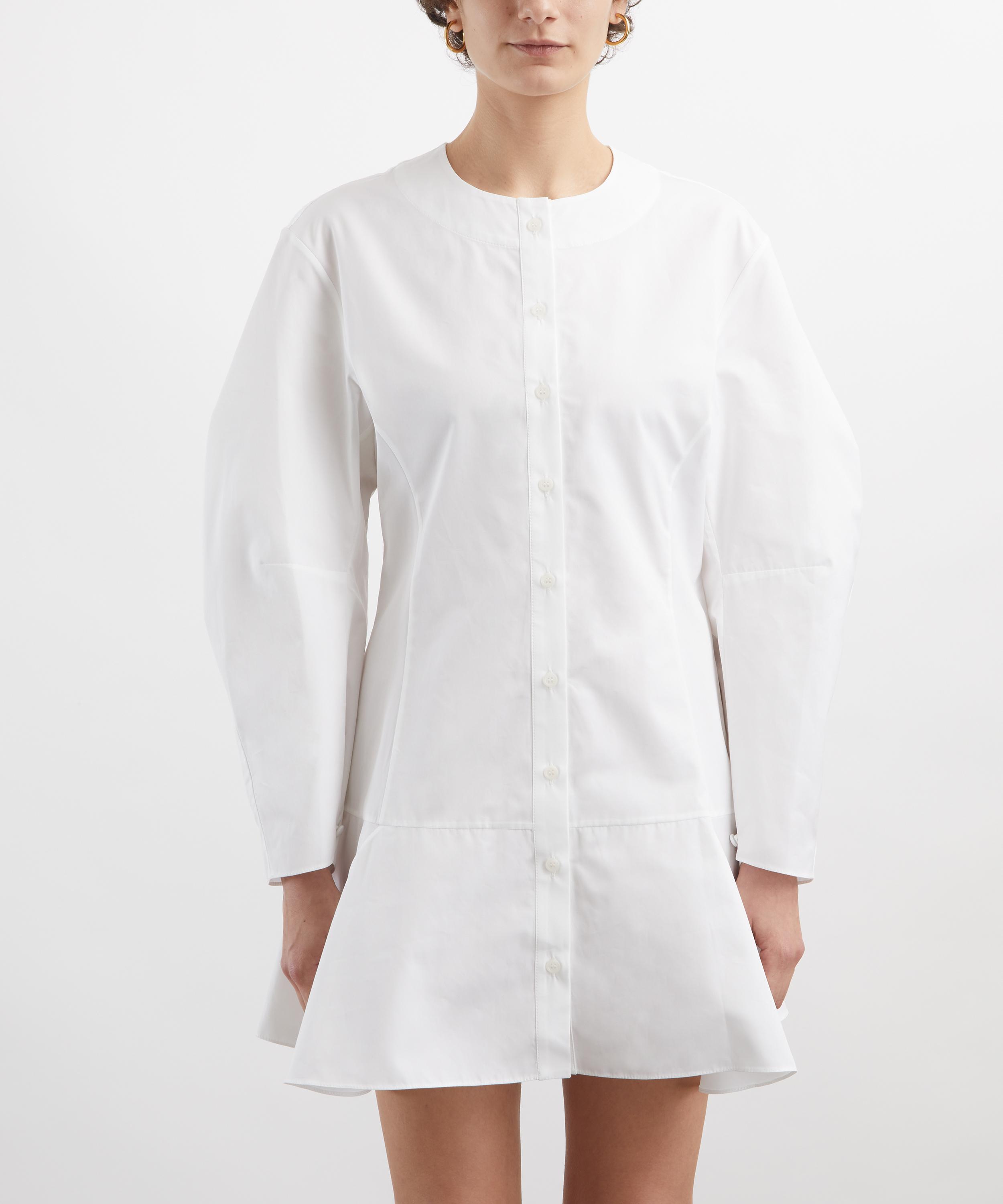 Crafted from crisp cotton poplin, this mini dress is defined by dramatic puff sleeves, a dropped waist, and a peplum hem, balanced by a simple round neckline and button fastening for an understatedly sophisticated finish.