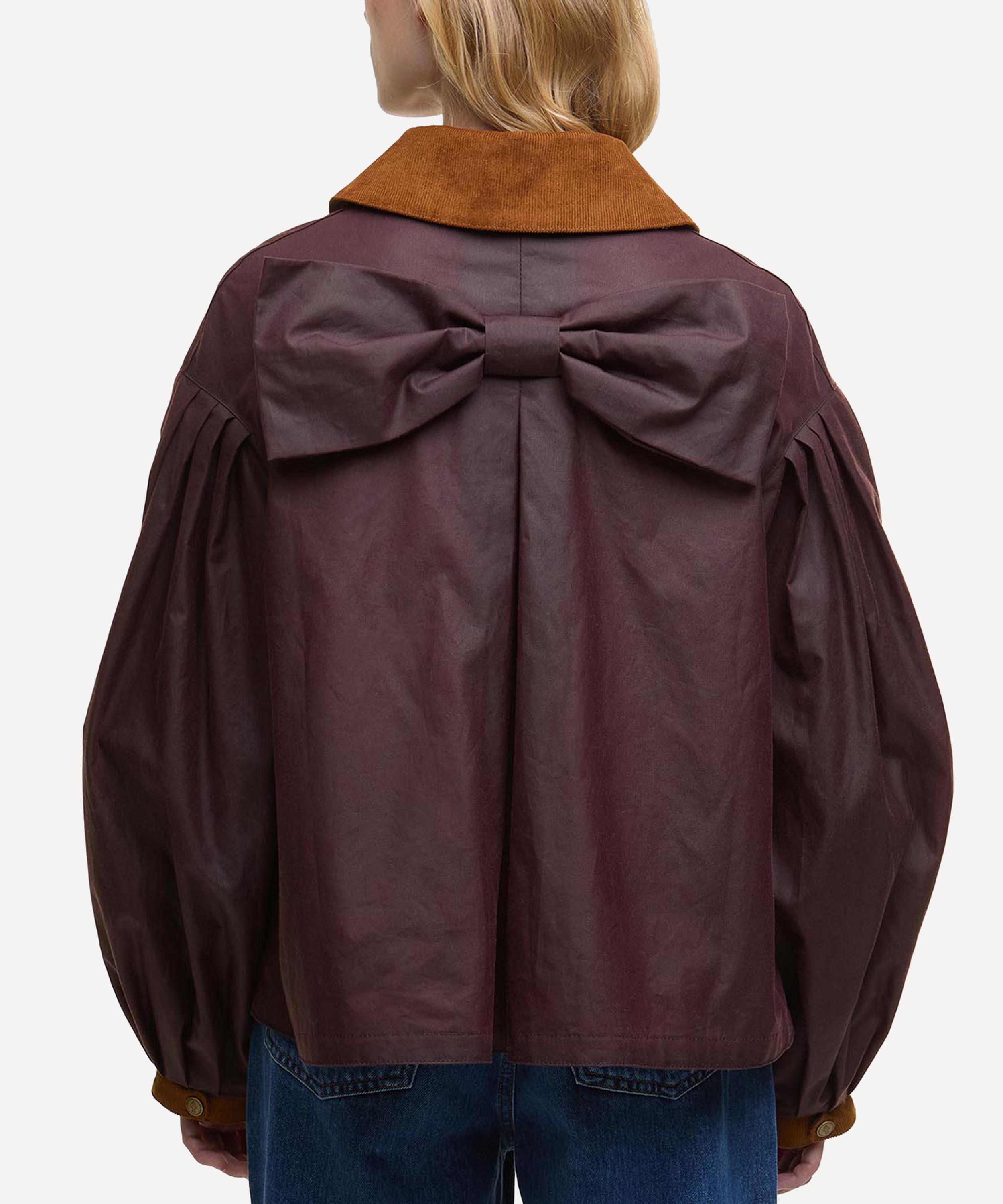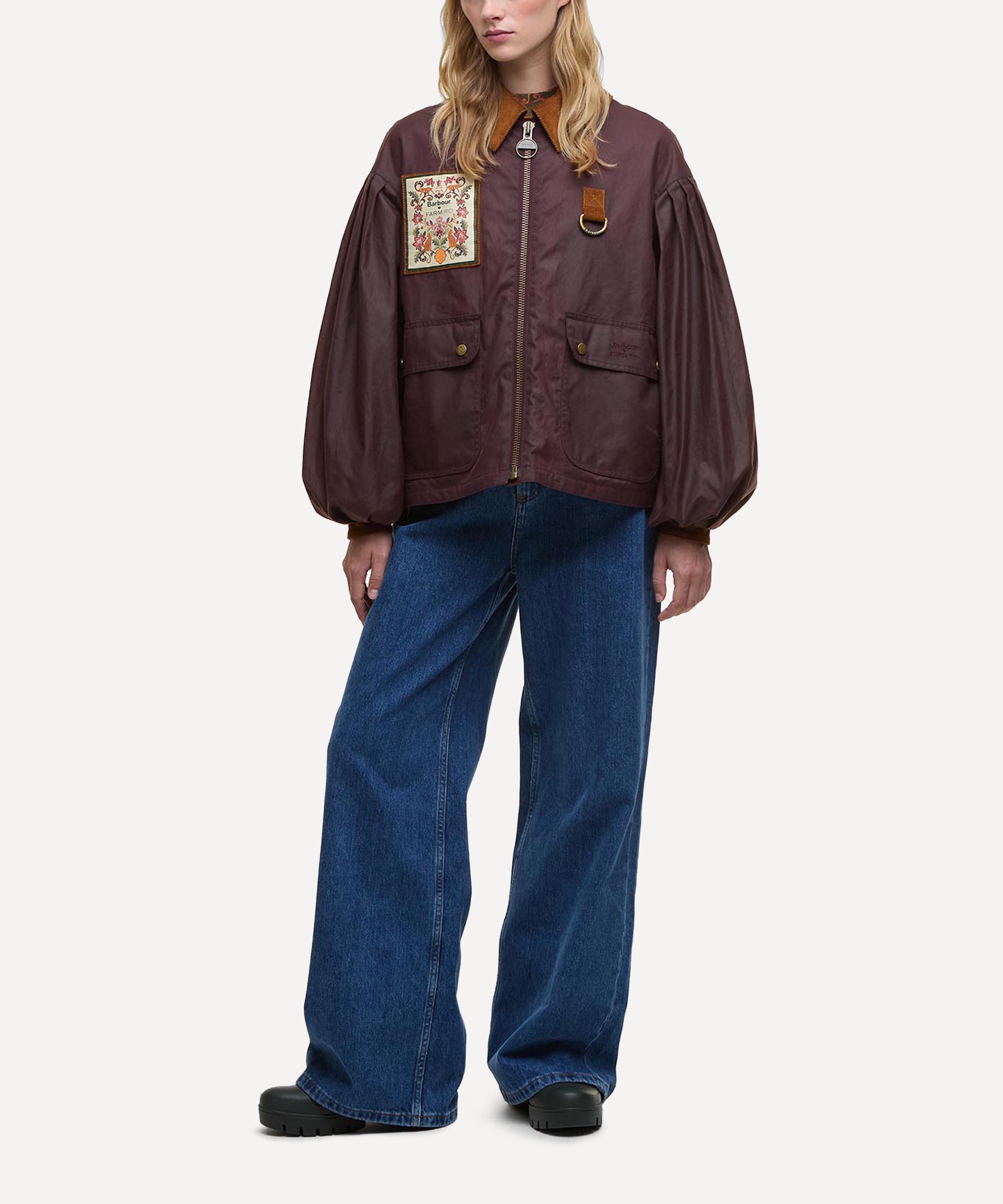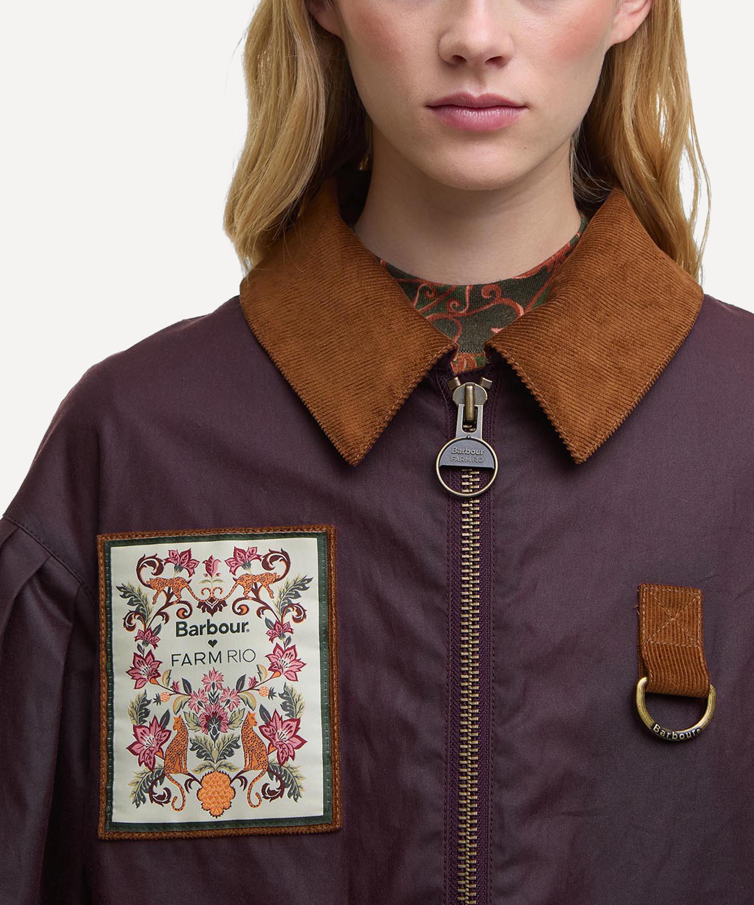 Inspired by Barbour’s signature Spey Waxed Jacket, the Barbour x FARM Rio Thais Waxed Jacket gives this best-selling style indisputable charm. This short-length, oversized waxed jacket features exaggerated gathered sleeves for an eye-catching look while a large wax bow to the back of the jacket ensures you make a statement from every angle. Complete with signature Barbour details such as the cord collar and trims, the D-ring detail to the chest and ring pull zip, it's the Barbour x FARM Rio patch to the chest that completes this enchanting style.