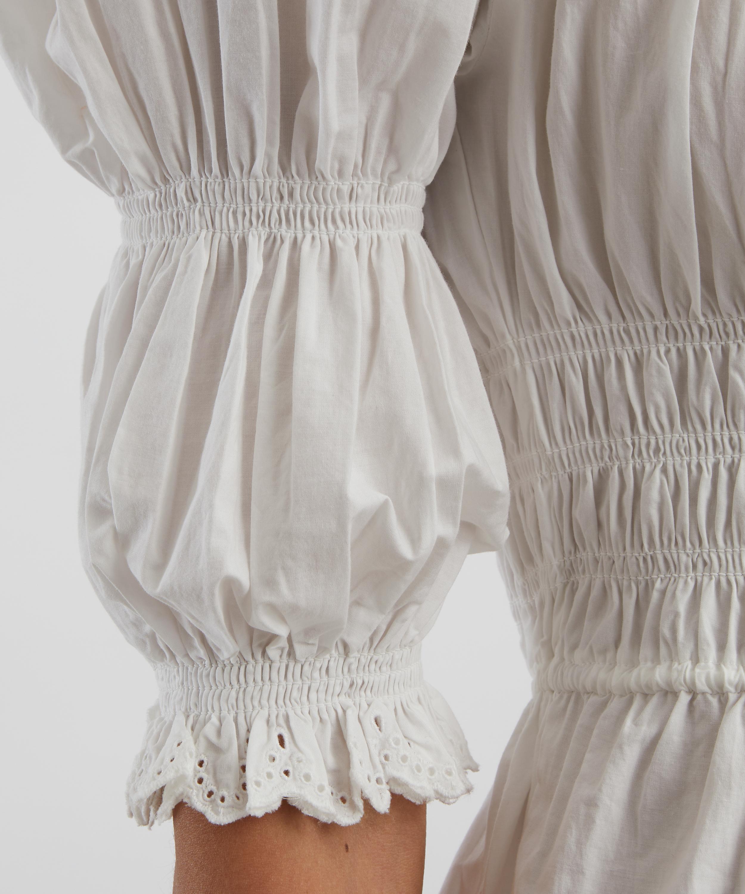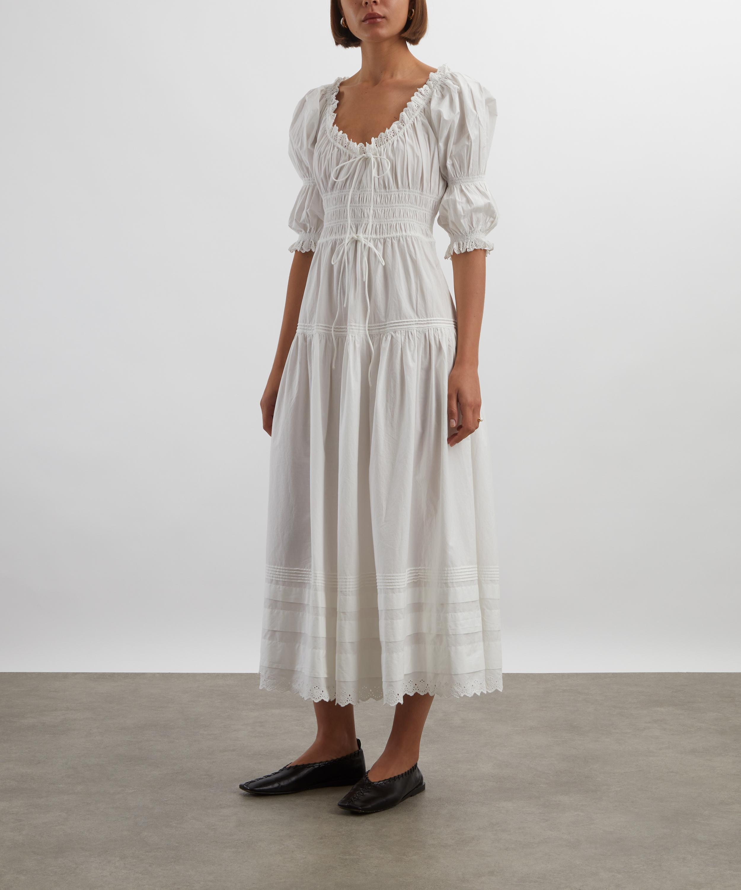 Crafted from crisp cotton, the Bardot features a scoop neckline, double-puffed sleeves, and a smocked bodice that flows into a full, ankle-grazing skirt with pintucks and scalloped eyelet embroidery for a quaint finish.