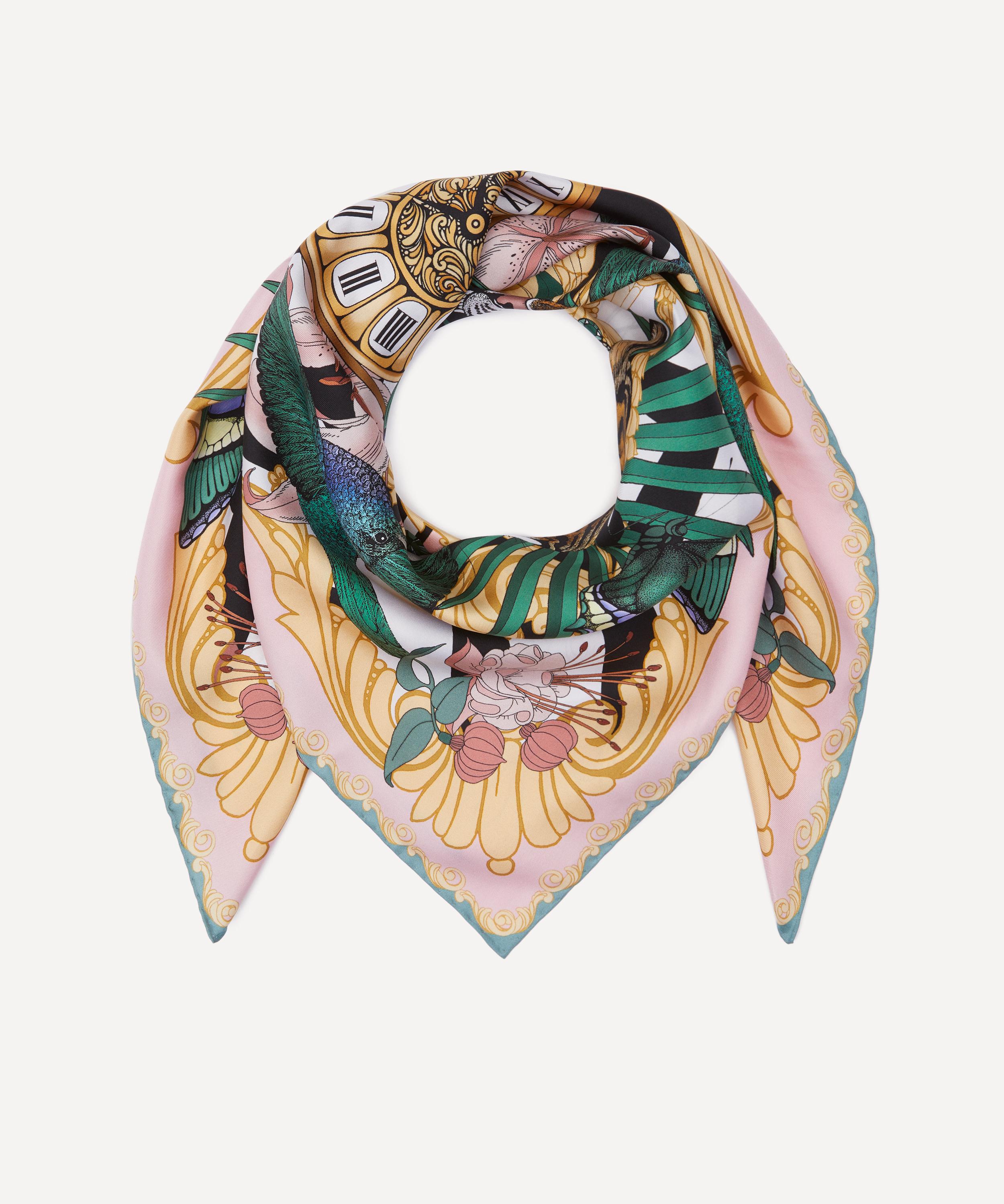 Crafted in England from a lightweight, high-quality silk twill, this scarf takes inspiration from 17th and 18th century French baroque, featuring a hand-illustrated print depicting a mesmerising array of ornate jewels, tiger heads, birds and elegant blooms – knot it close to the neck or drape it over your shoulders to elevate your everyday look and add a burst of print.