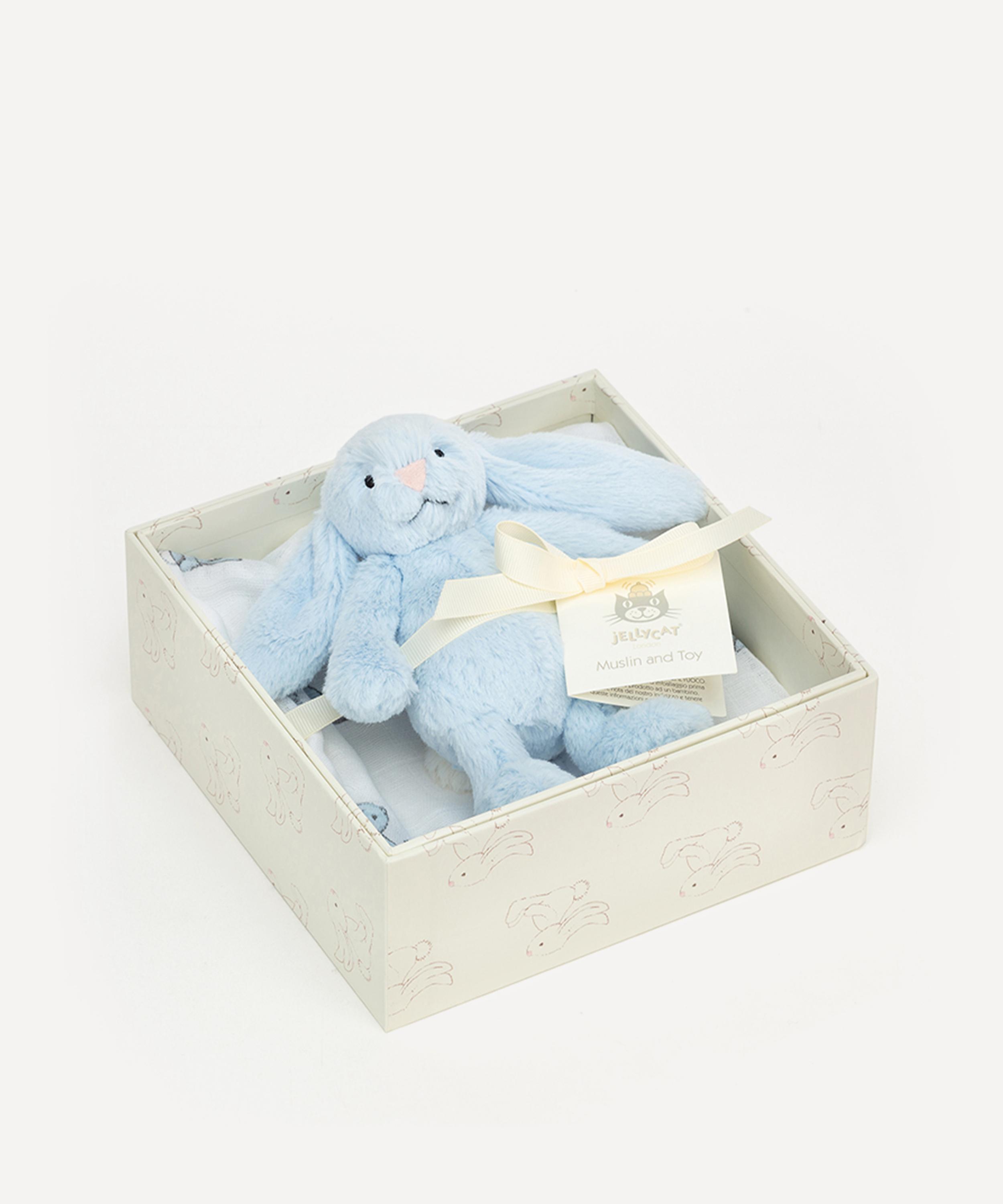 This snuggly toy makes the perfect furry friend for new arrivals – designed to be cuddled into from birth, bashful bunny makes a charming and adorable addition to any playroom. With floppy ears, kind eyes and an embroidered nose, he is the best naptime partner – his blue fur is irresistibly soft and will provide comfort to little ones as they grow up. Housed in a gift box and accompanied with a printed cotton muslin cloth, this is a charming gift for baby showers.