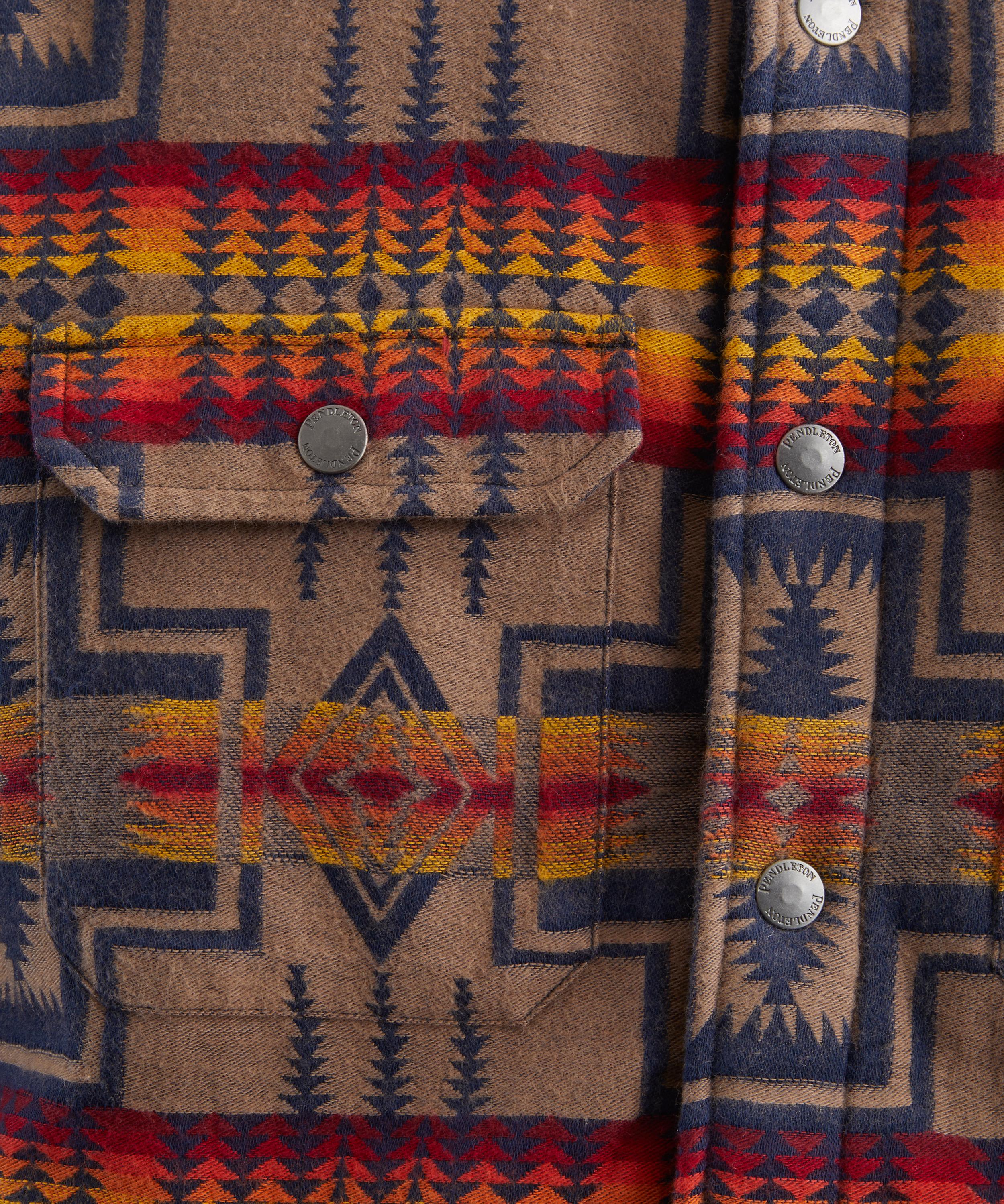 Crafted from brushed cotton detailed with an iconic jacquard pattern, inspired by blankets from the brand's archives, it features two flap chest pockets, a point collar, a bespoke vintage Pendleton snap button closure and two hidden side slit pockets, and is lined in soft sherpa fleece layer for a premium finish.