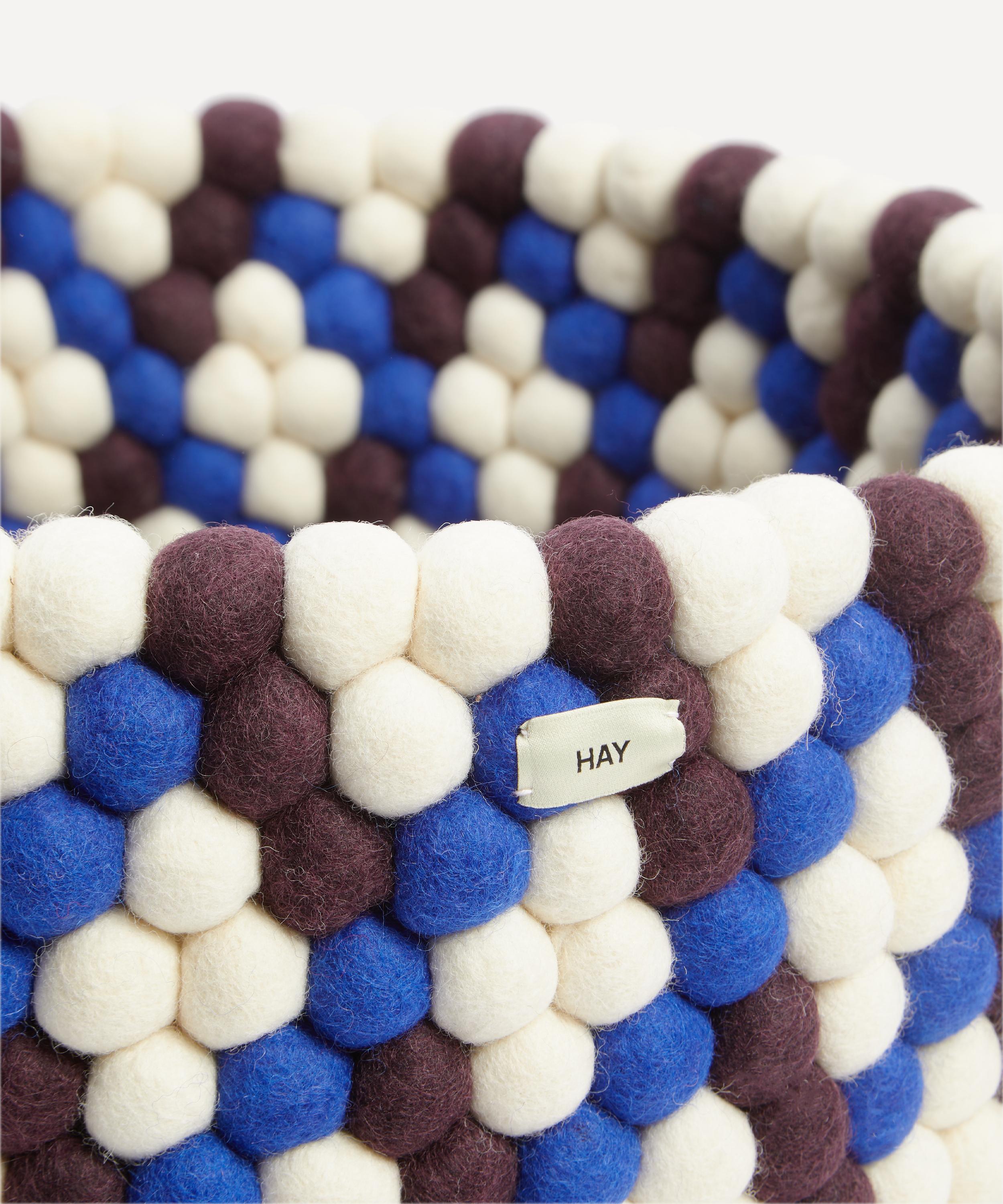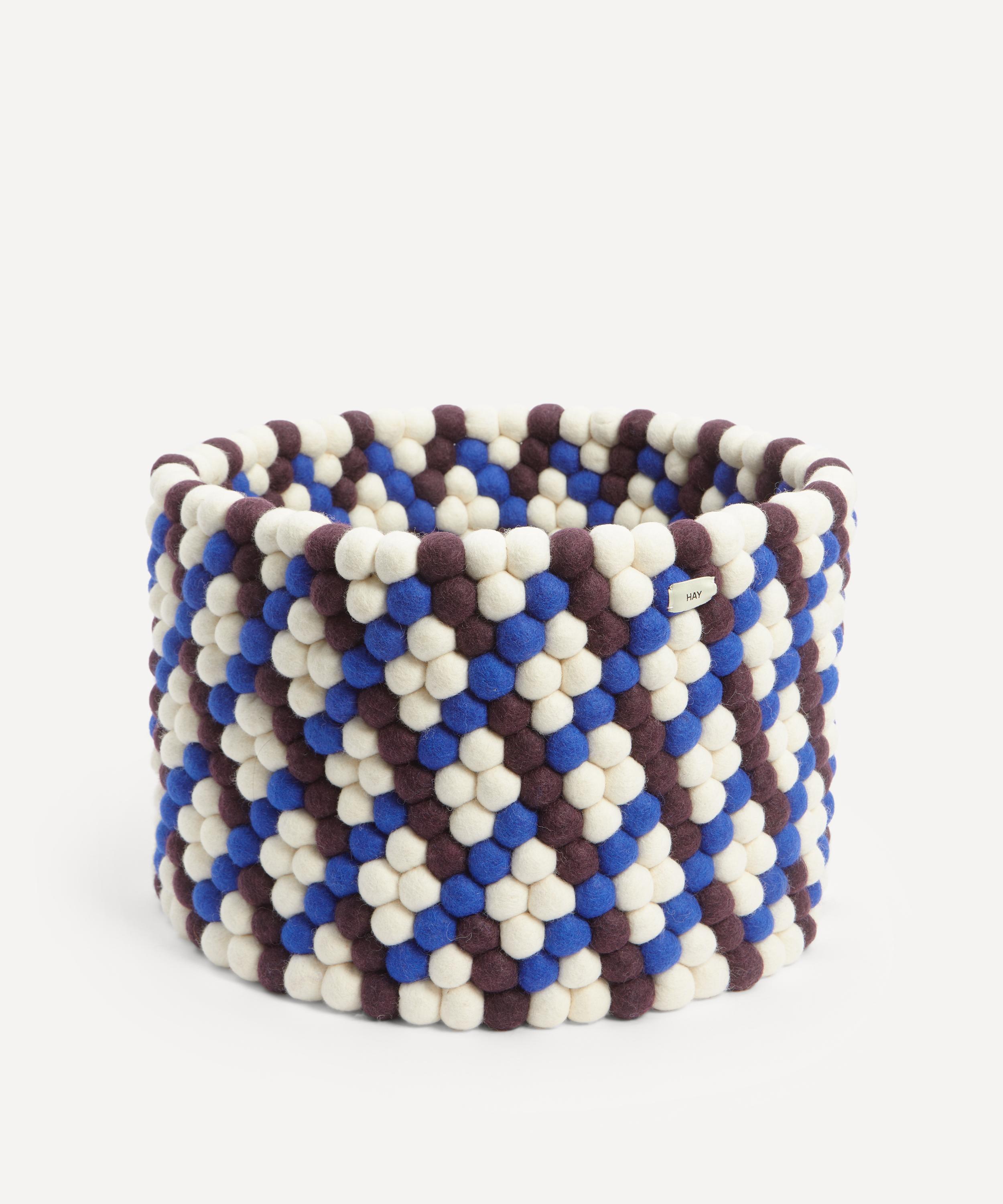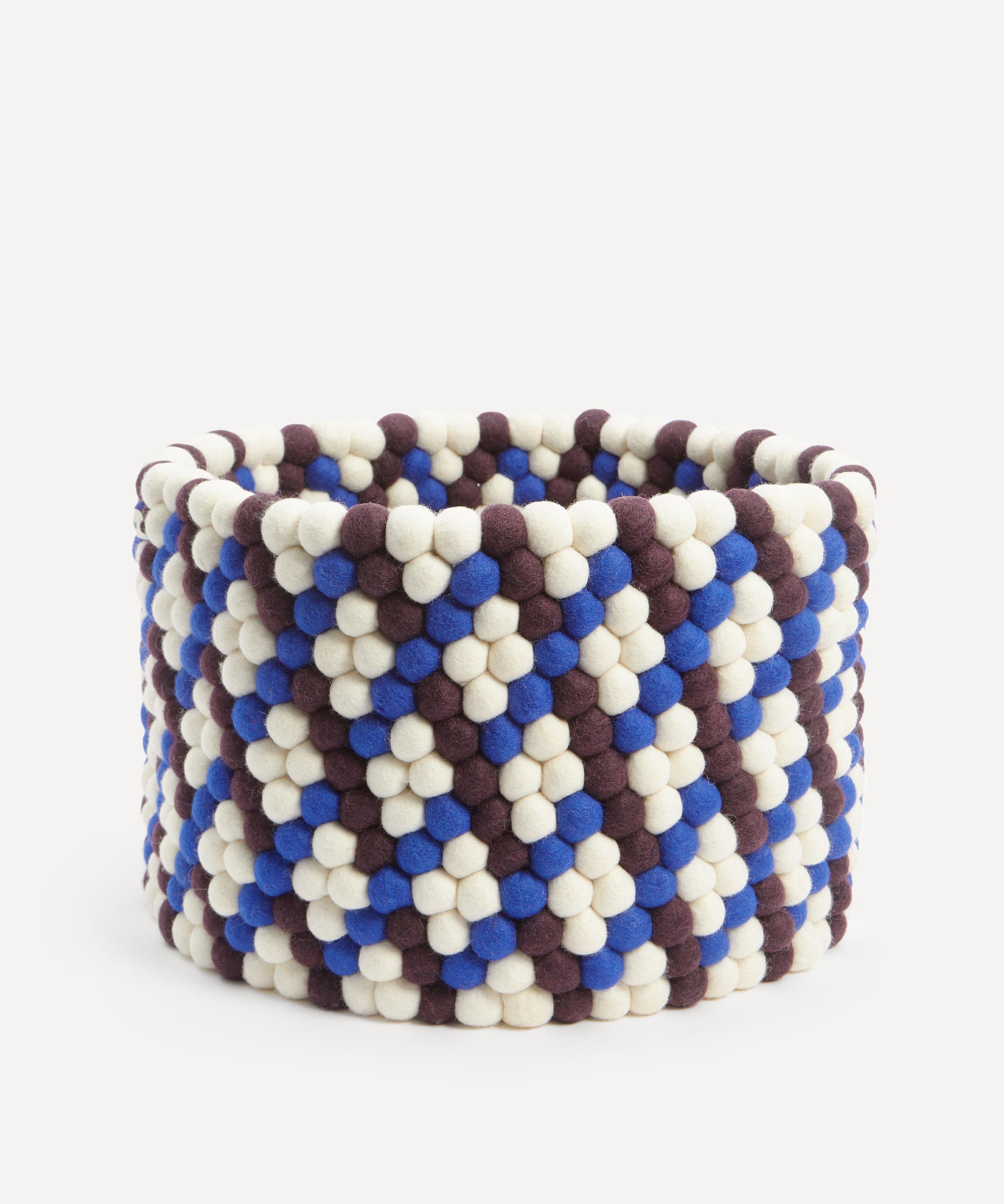 Meticulously crafted from hundreds of felt balls that are individually hand rolled into vibrant graphic patterns, these baskets are a contemporary storage solution for eclectic interiors.