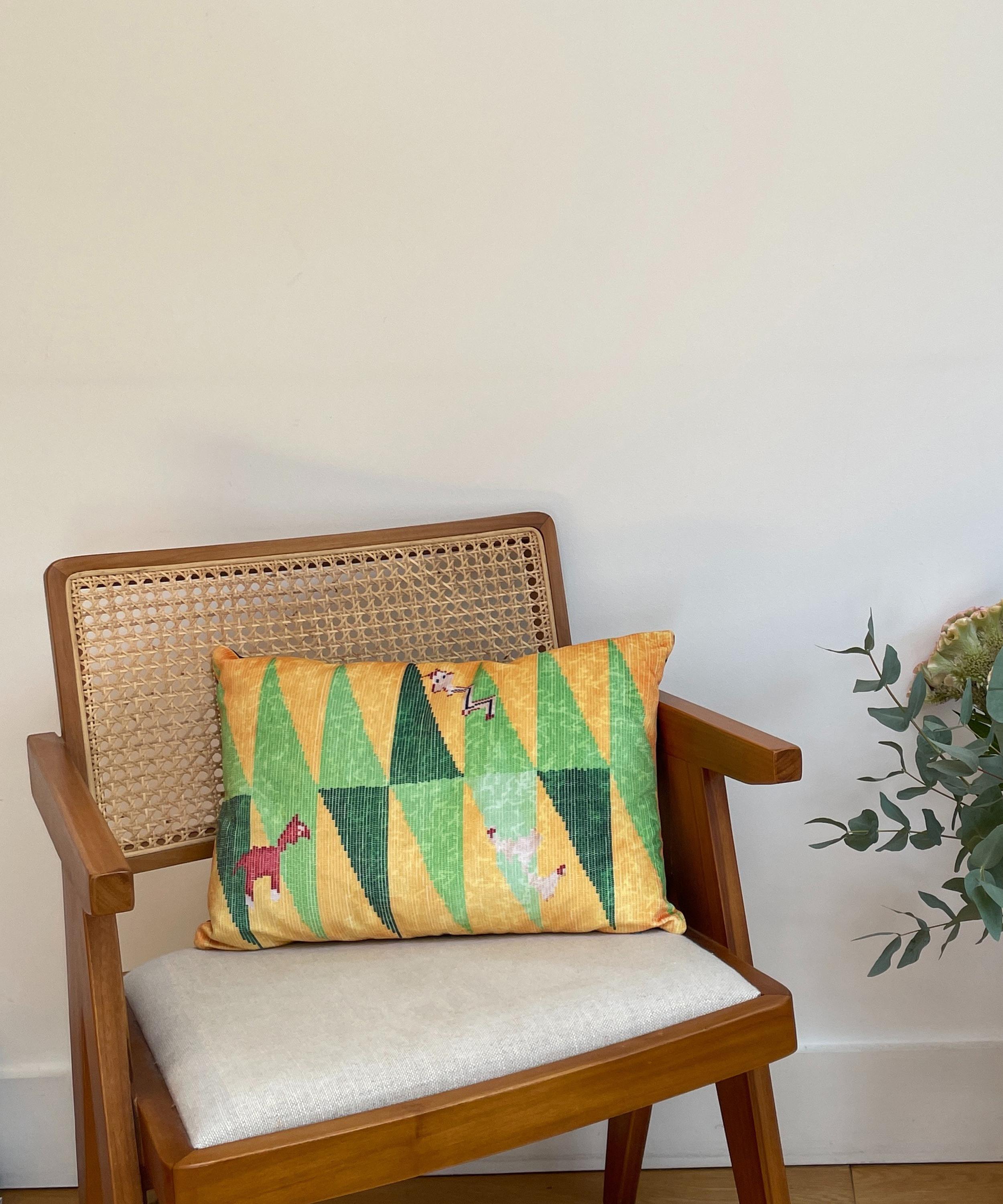 This cushion is part of the brand’s Kirdi collection, inspired by the rich design history of the modesty aprons worn by the Fali ethic group of far north of Cameroon and North Eastern Nigeria. Meticulously crafted from cotton velvet, this cushion features charming illustrations overlaying a geometric background that has been hand drawn and digitally illustrated to imitate the beadwork of its source material. Arrange alongside brightly hued soft furnishings to channel vibrant, artful interior styling.