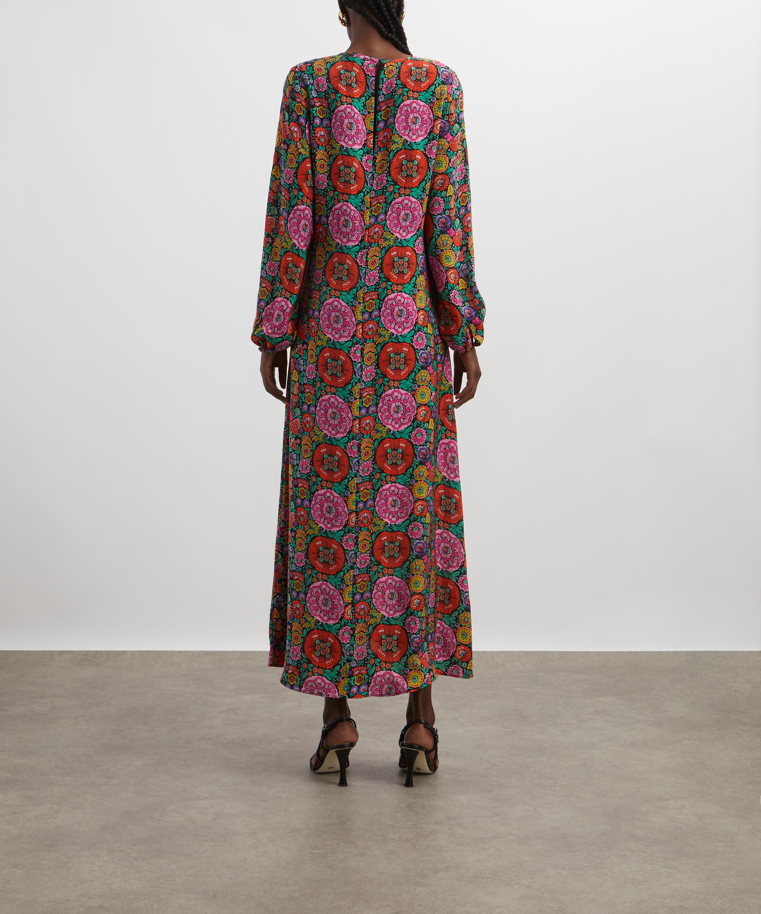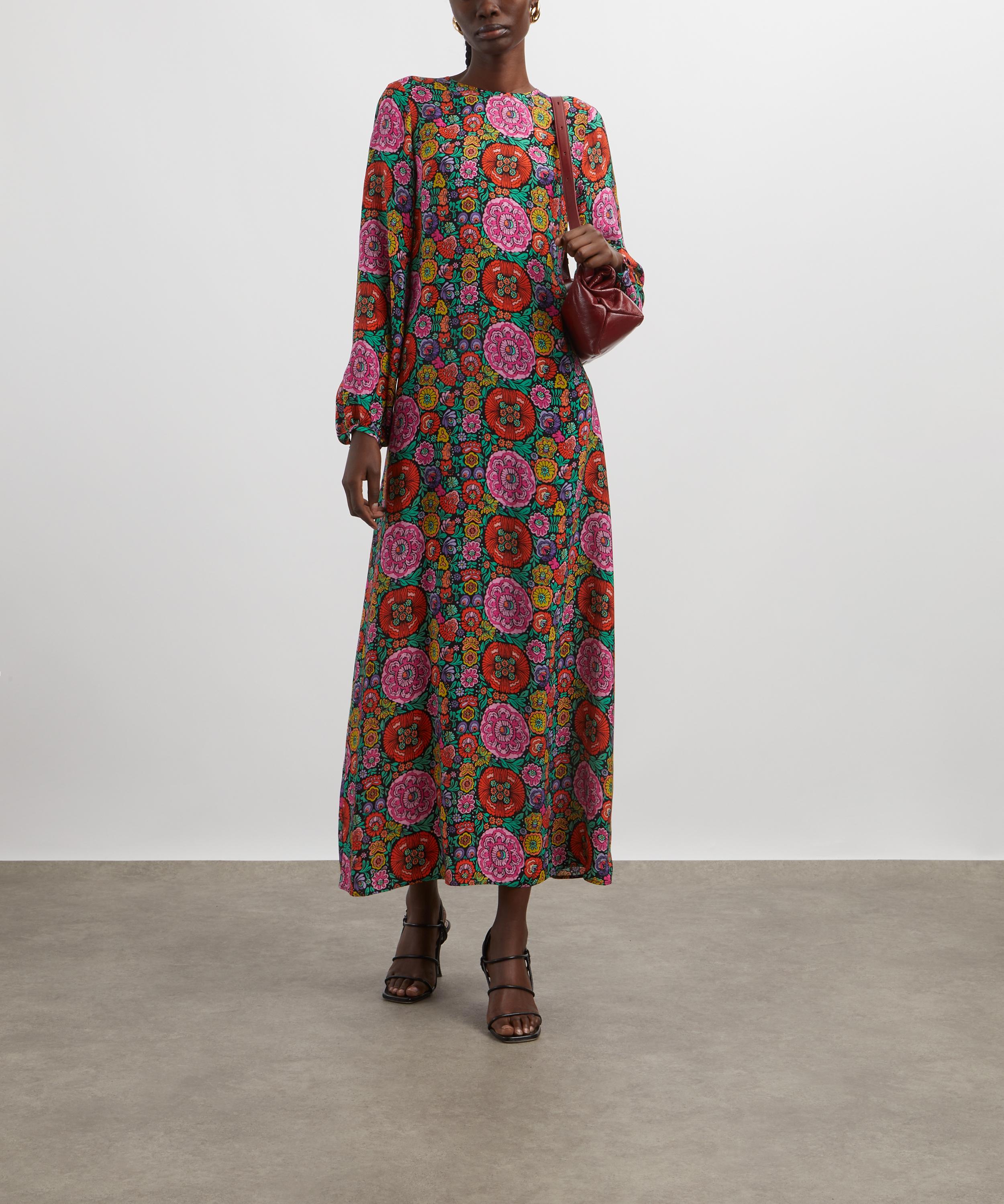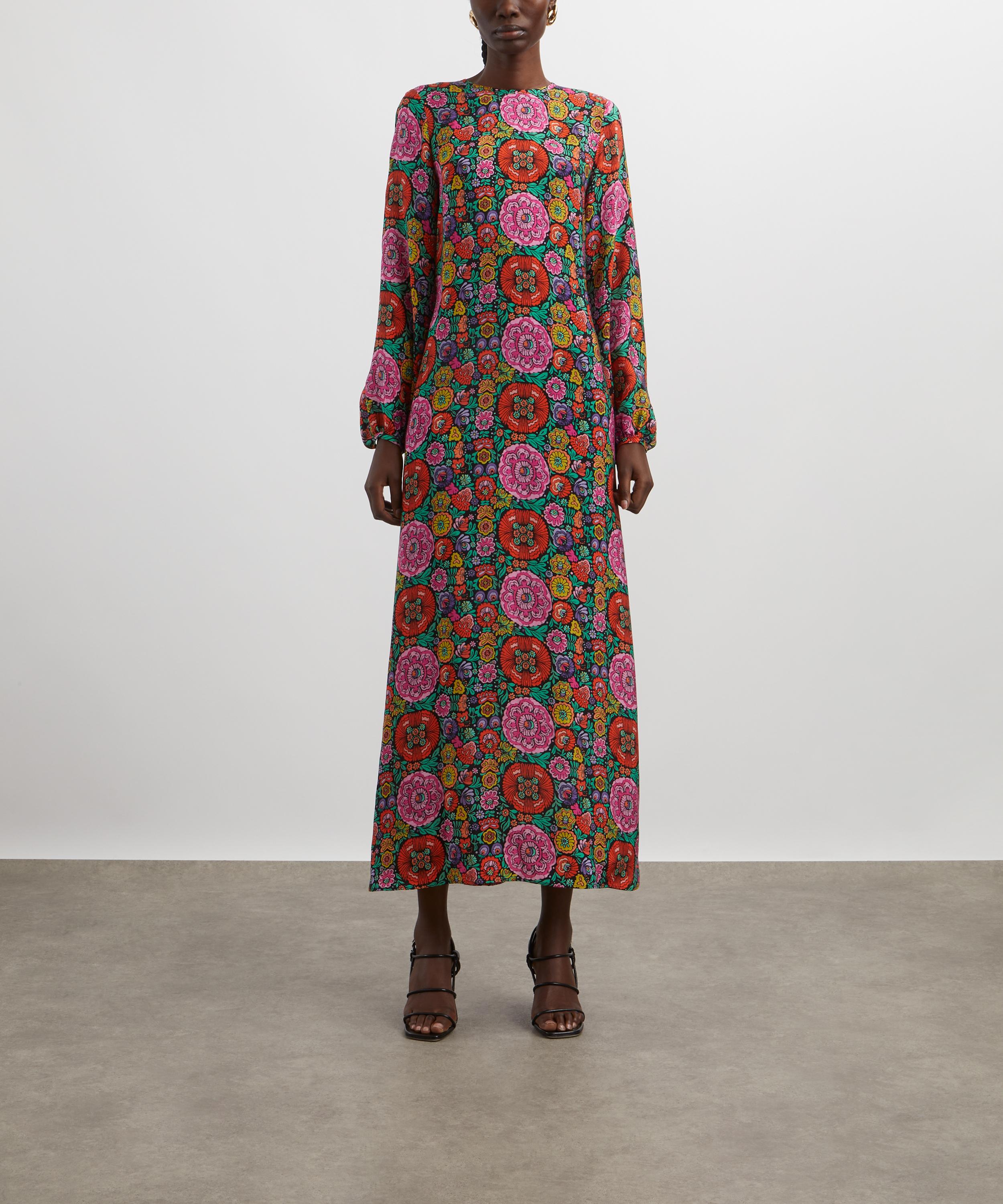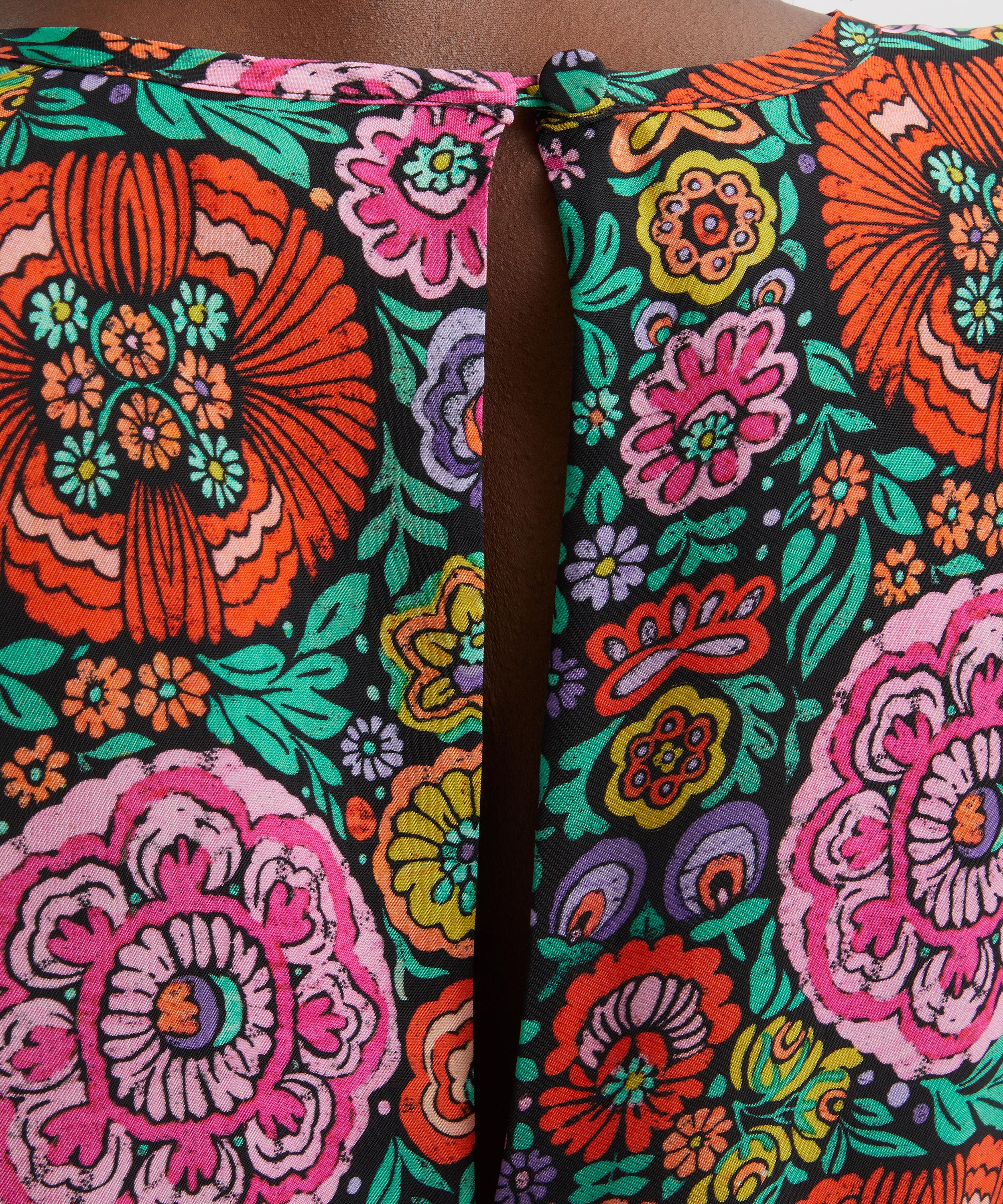 Printed in our very own cutting-edge Liberty fabric mill in northern Italy, this particular style of dress showcases the Begonia Garden print - bursting with the exuberant spirit of the Swinging Sixties, this design originally created by Liberty in 1965 features fantastical folk-style blooms on dark, textured backdrops.