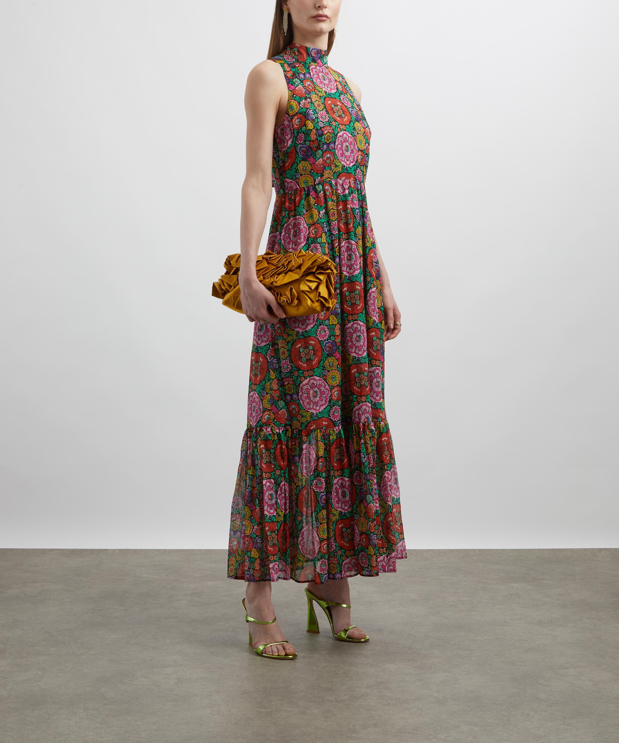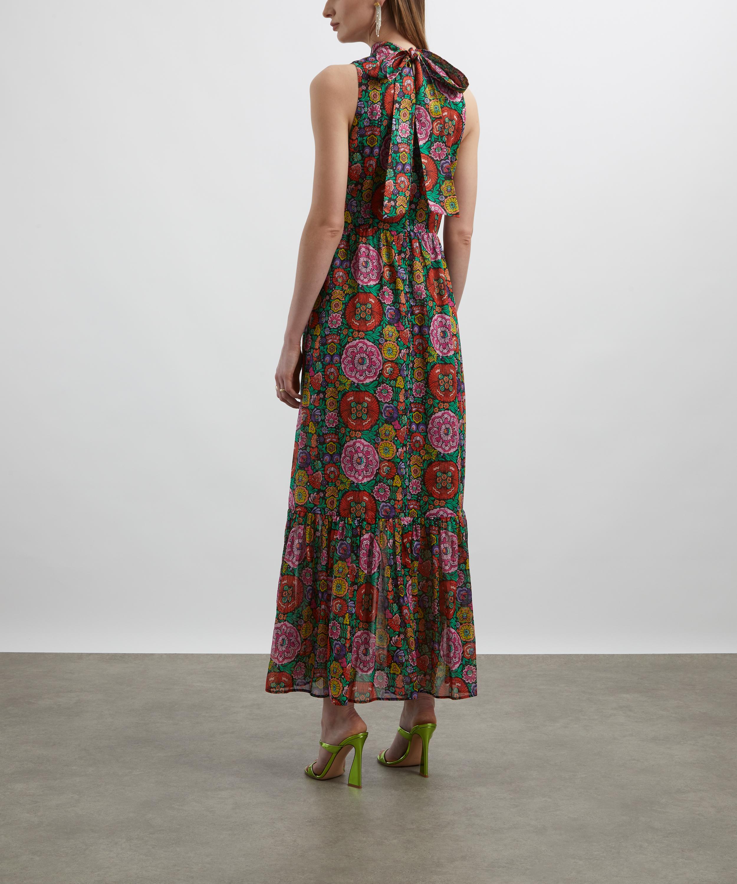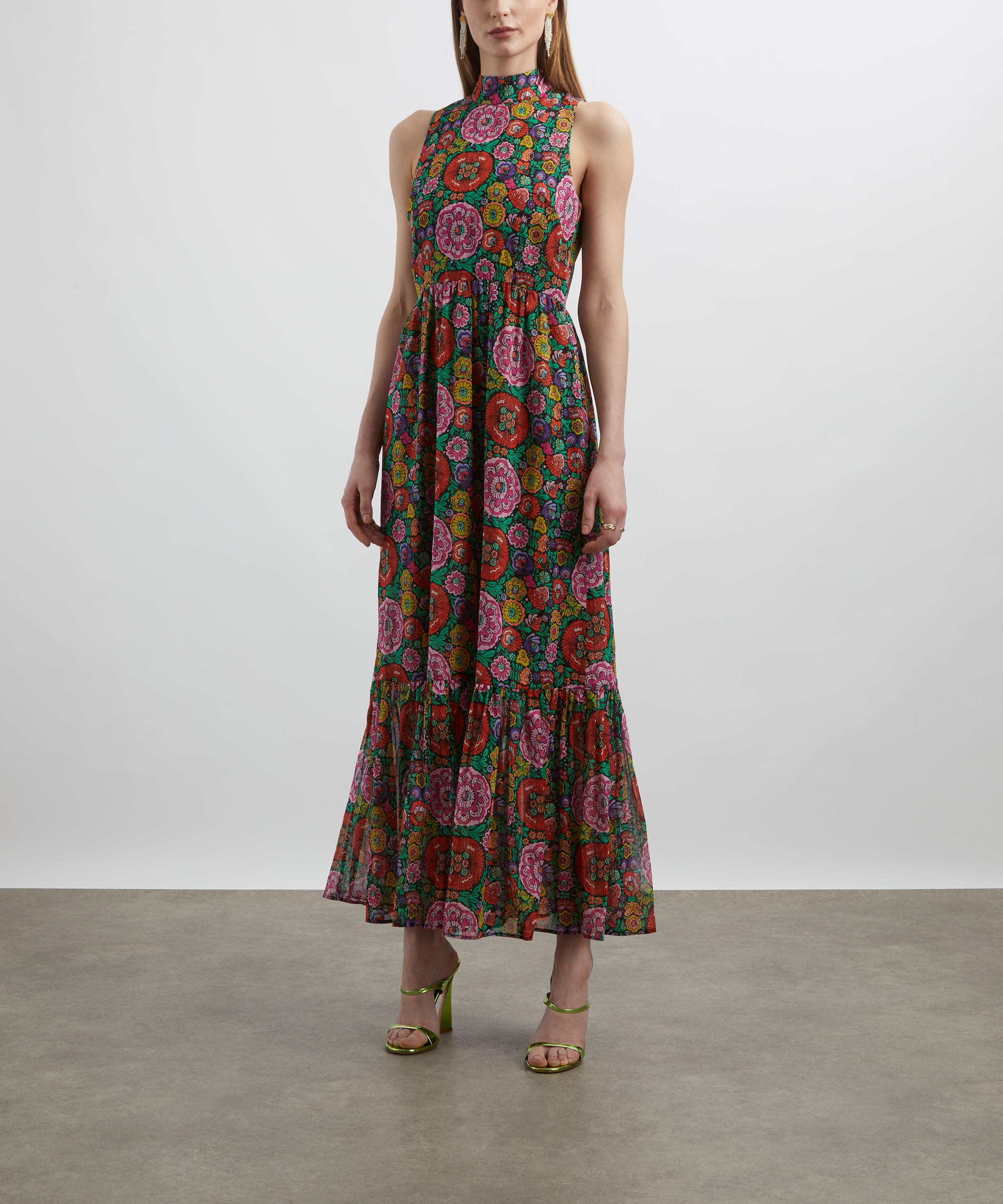 Crafted from cotton chiffon, this sleeveless maxi dress features an elegant tie-neck fastening and a waisted fit that flows into a floaty, gathered skirt, creating a truly graceful silhouette.