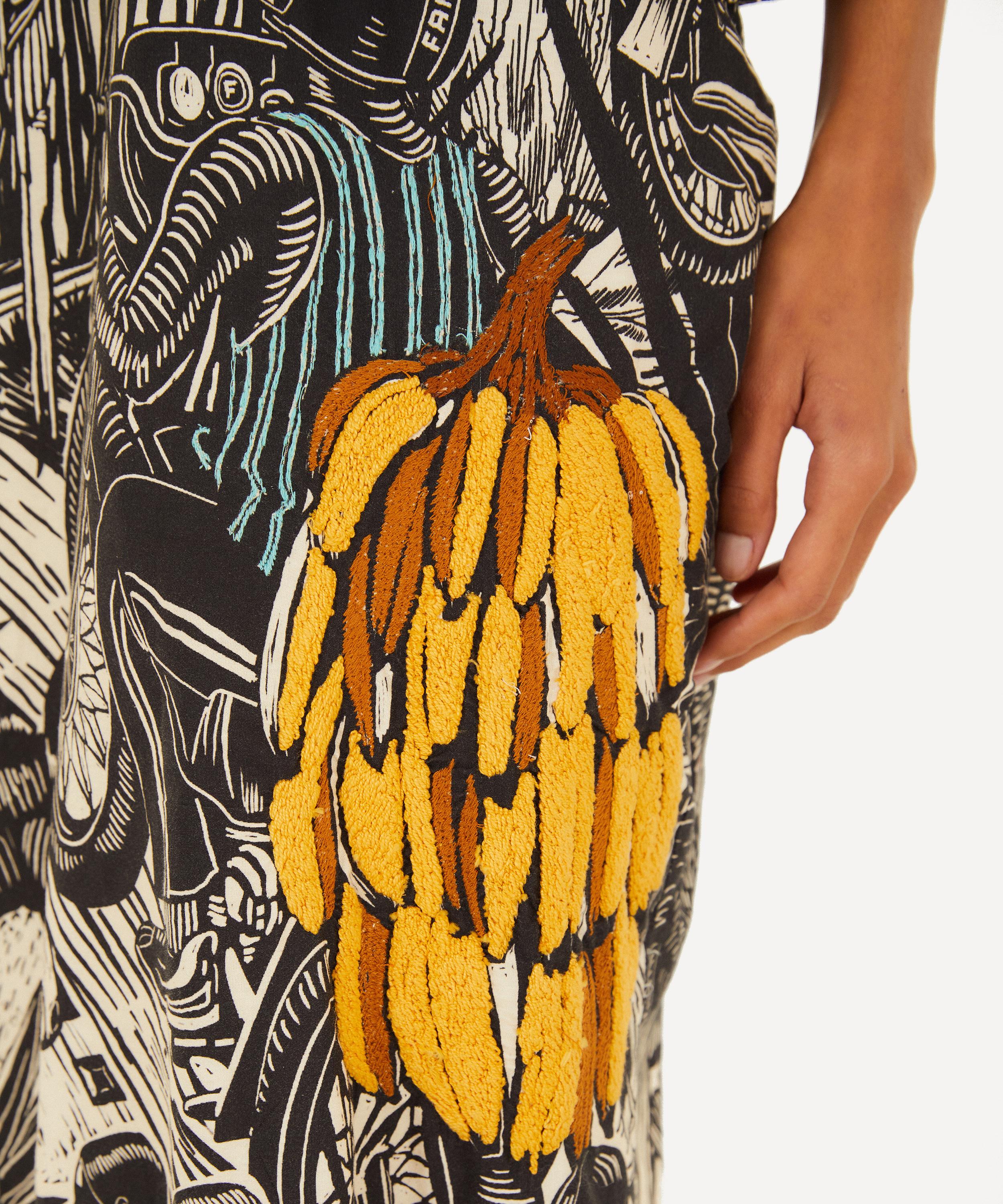 Embrace the vibrant spirit of FARM Rio with this sleeveless maxi dress, featuring a graphic monochrome motorcycle print and colourful embroidery throughout. Designed with a cross-over halterneck and a playful peplum frill at the waist, a back hem slit allows for effortless movement and a fluid, feminine finish.