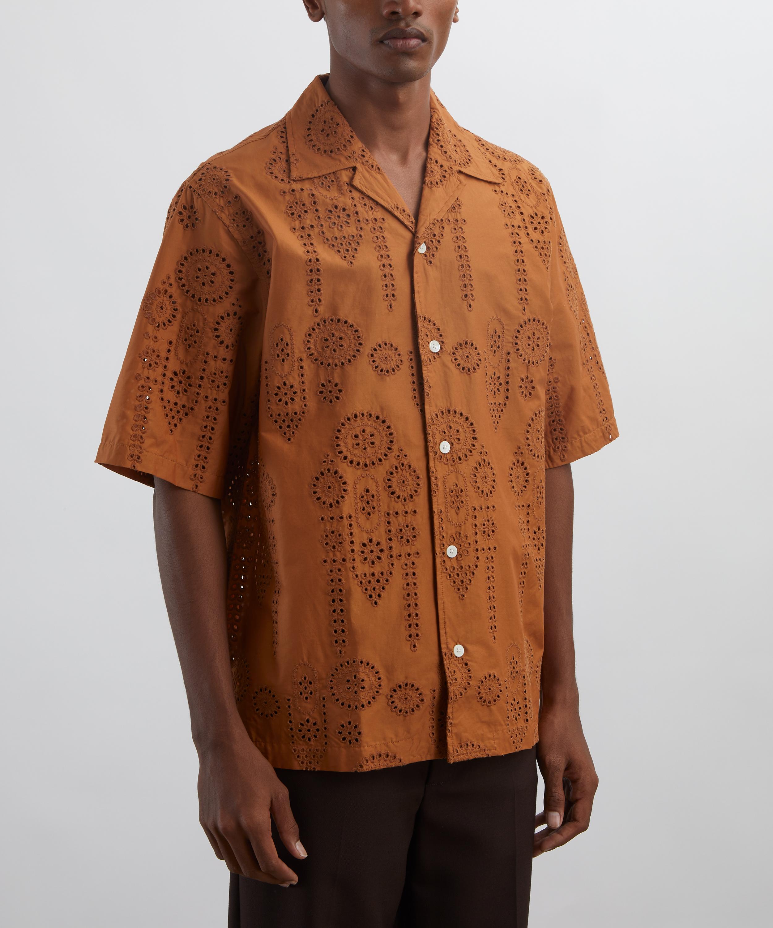 Crafted from cotton adorned with intricate broderie anglaise in a vibrant copper hue, this short-sleeve shirt features a relaxed fit, a camp collar, and is finished with mother-of-pearl button fastening.