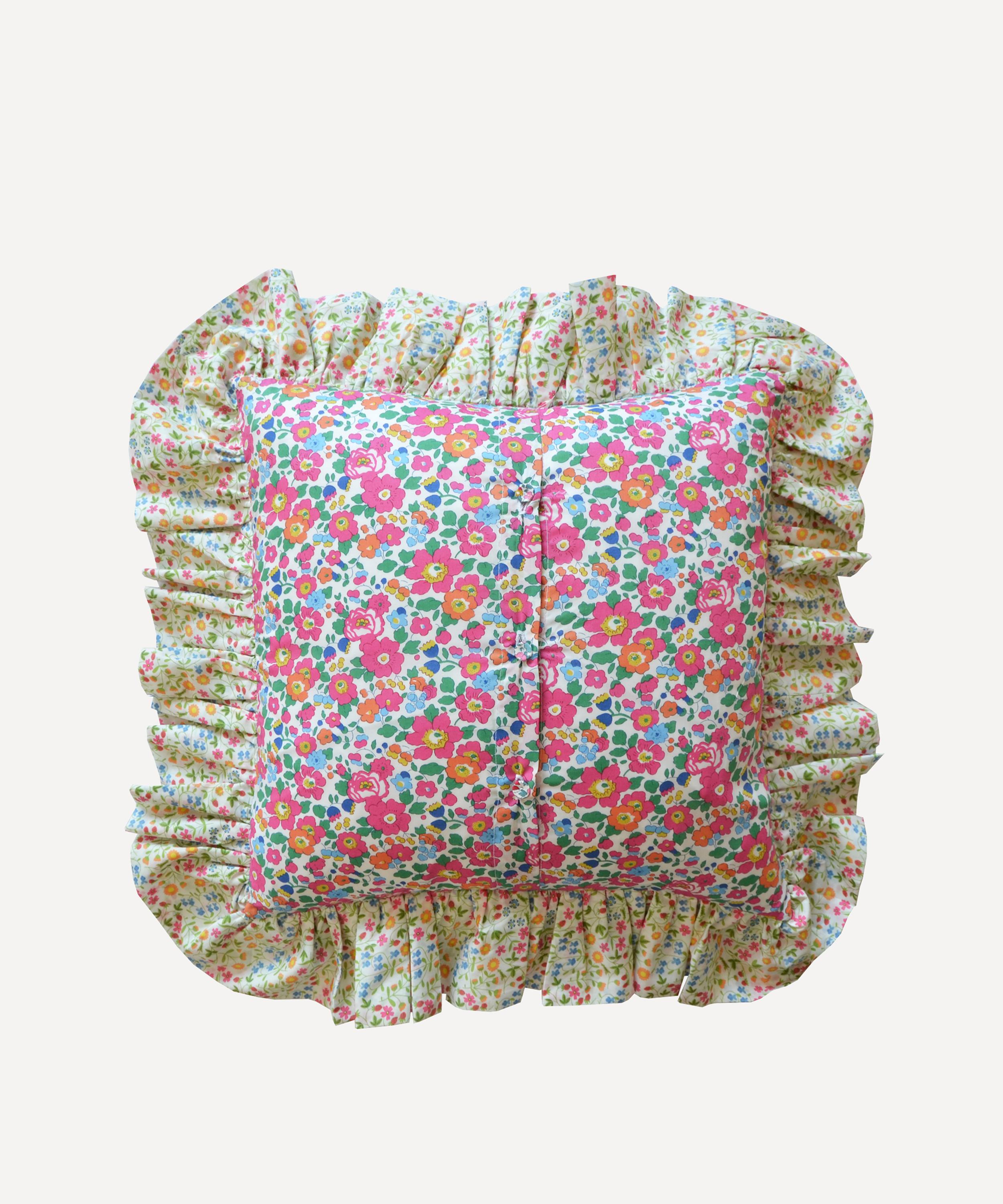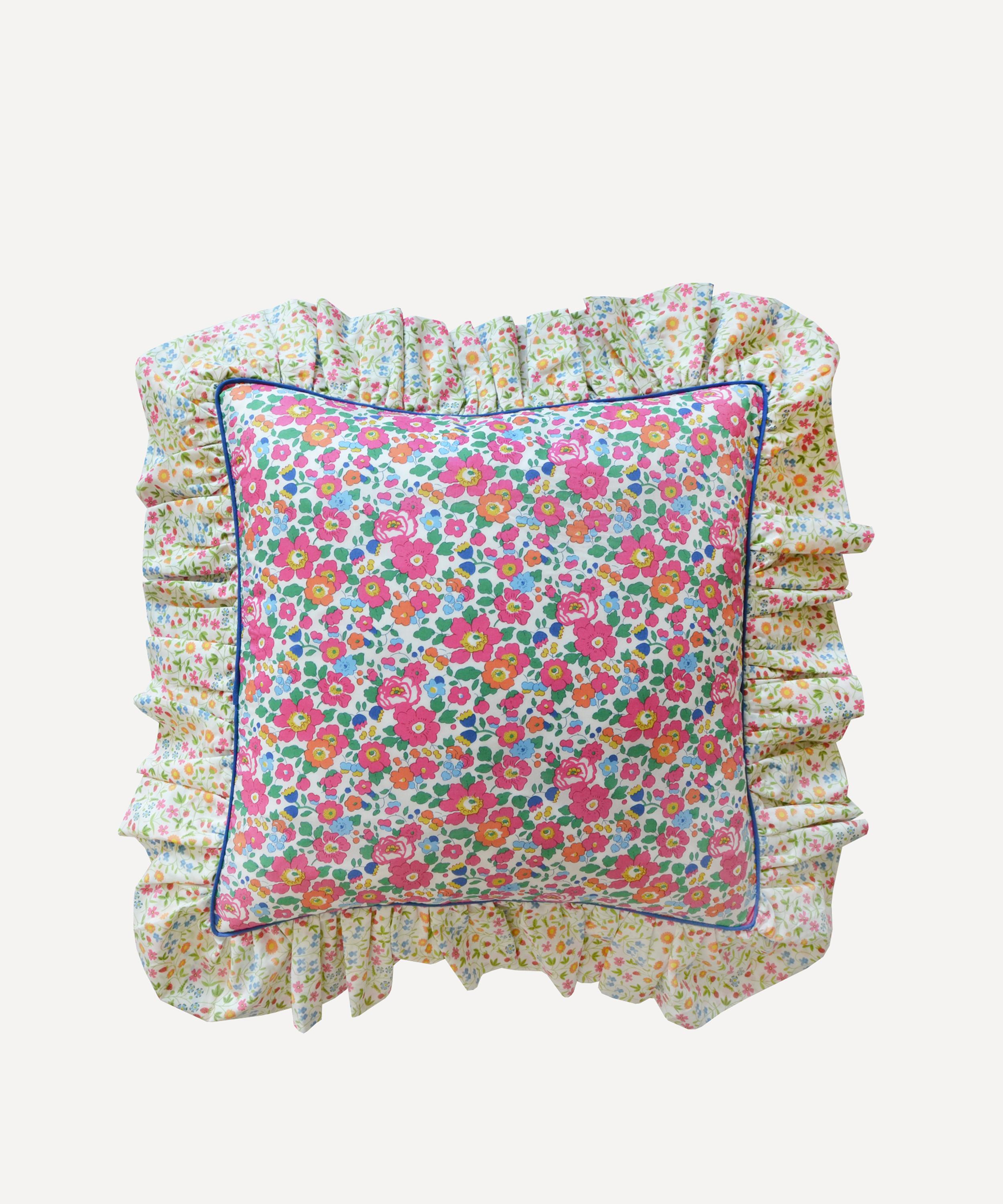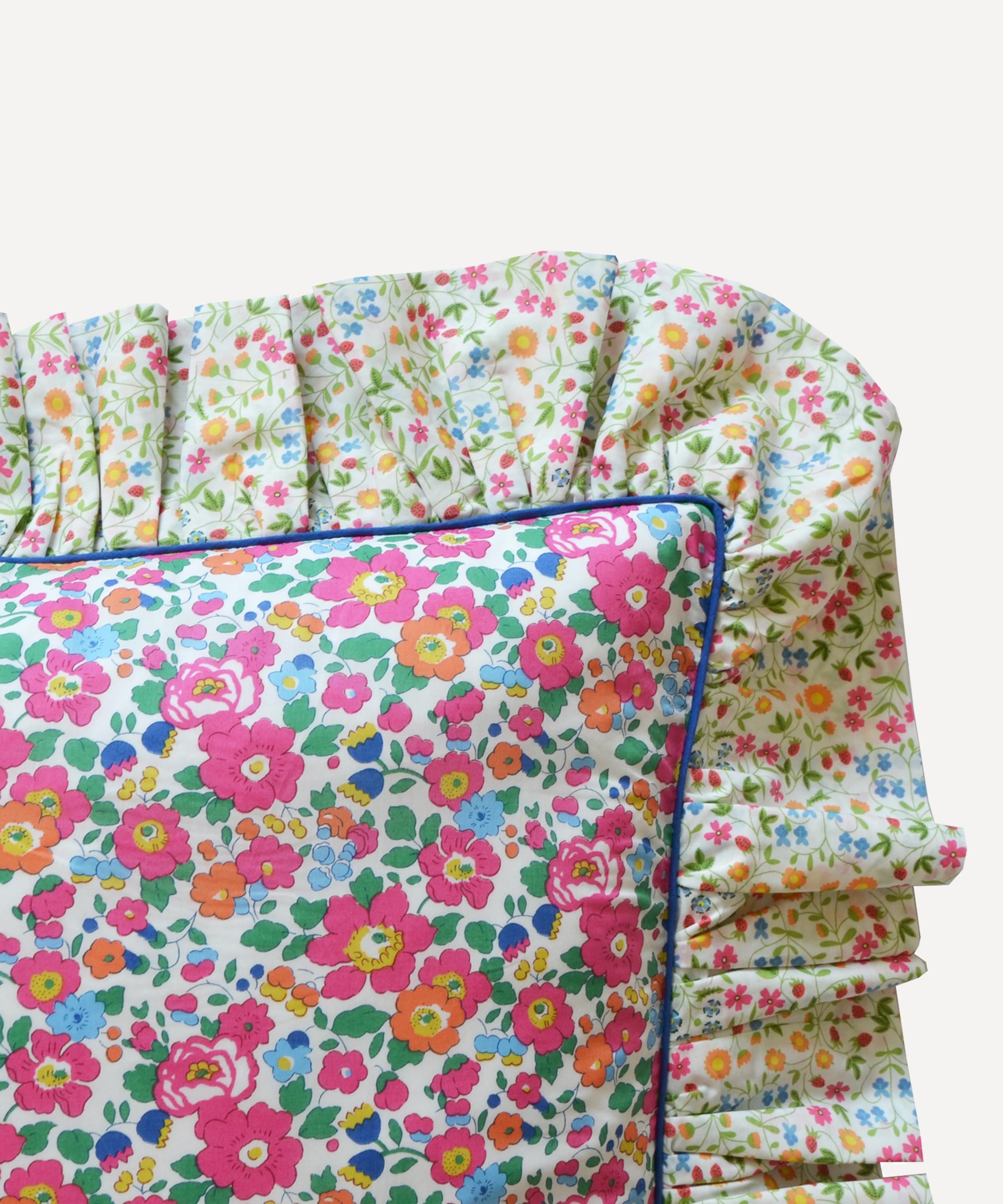 Somerset-born bedding brand Coco & Wolf is renowned for its Liberty print bedspreads, duvets and cushions, crafted from our inimitable Tana Lawn™ cotton - a modern masterpiece of fabric production that Liberty has been perfecting for over 100 years. Characterised by a plump, square form with contrast piped edging and an elegantly ruffled trim, this cushion is dressed in Liberty Fabrics’ Little Mirabelle and Betsy in deep pink prints. Arrange alongside other Liberty print cushions to bring character and quintessential British style into your home.