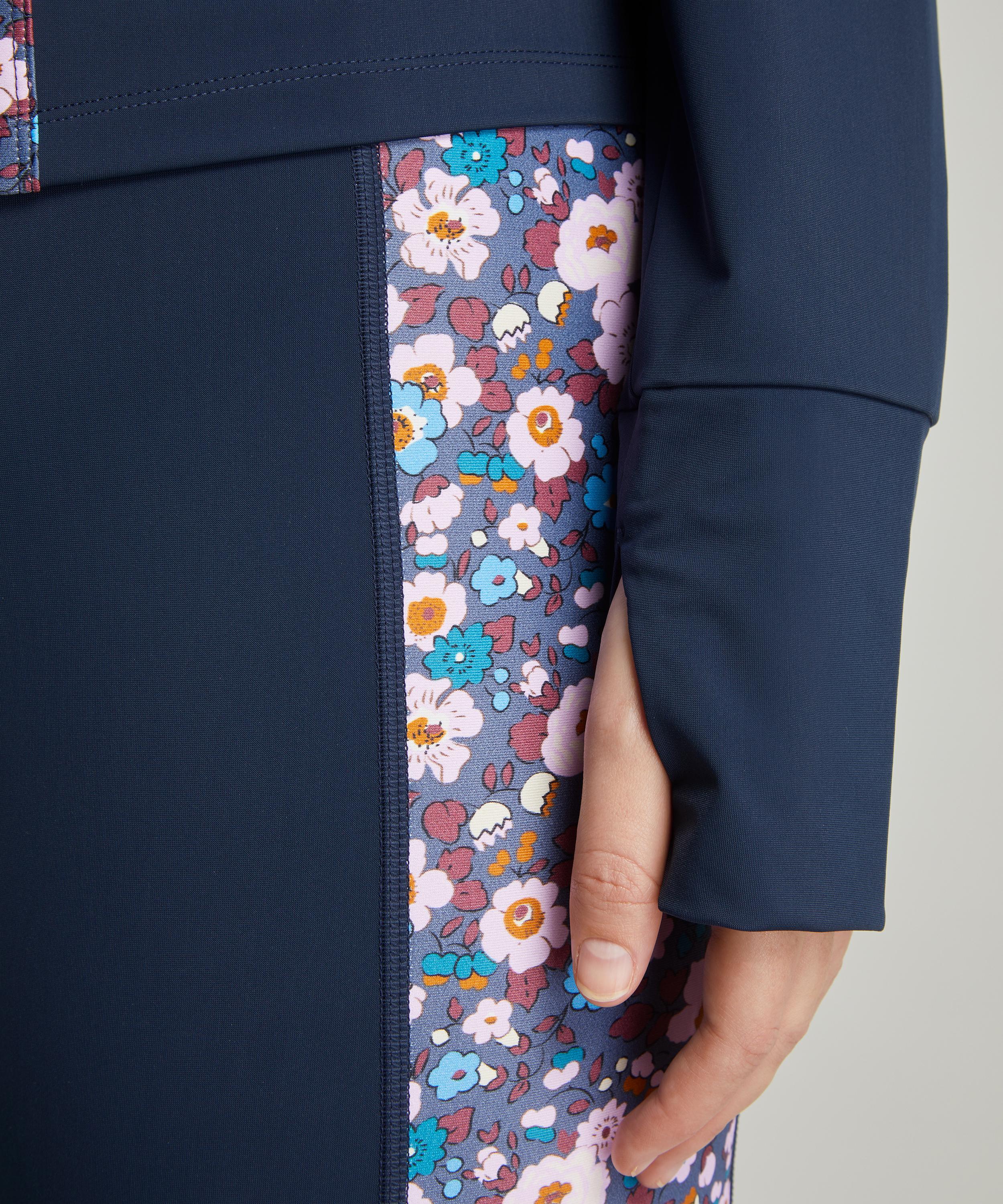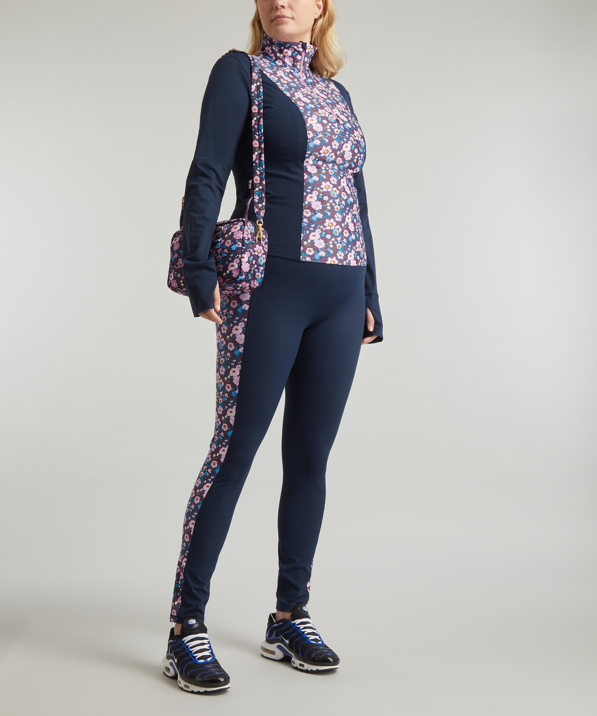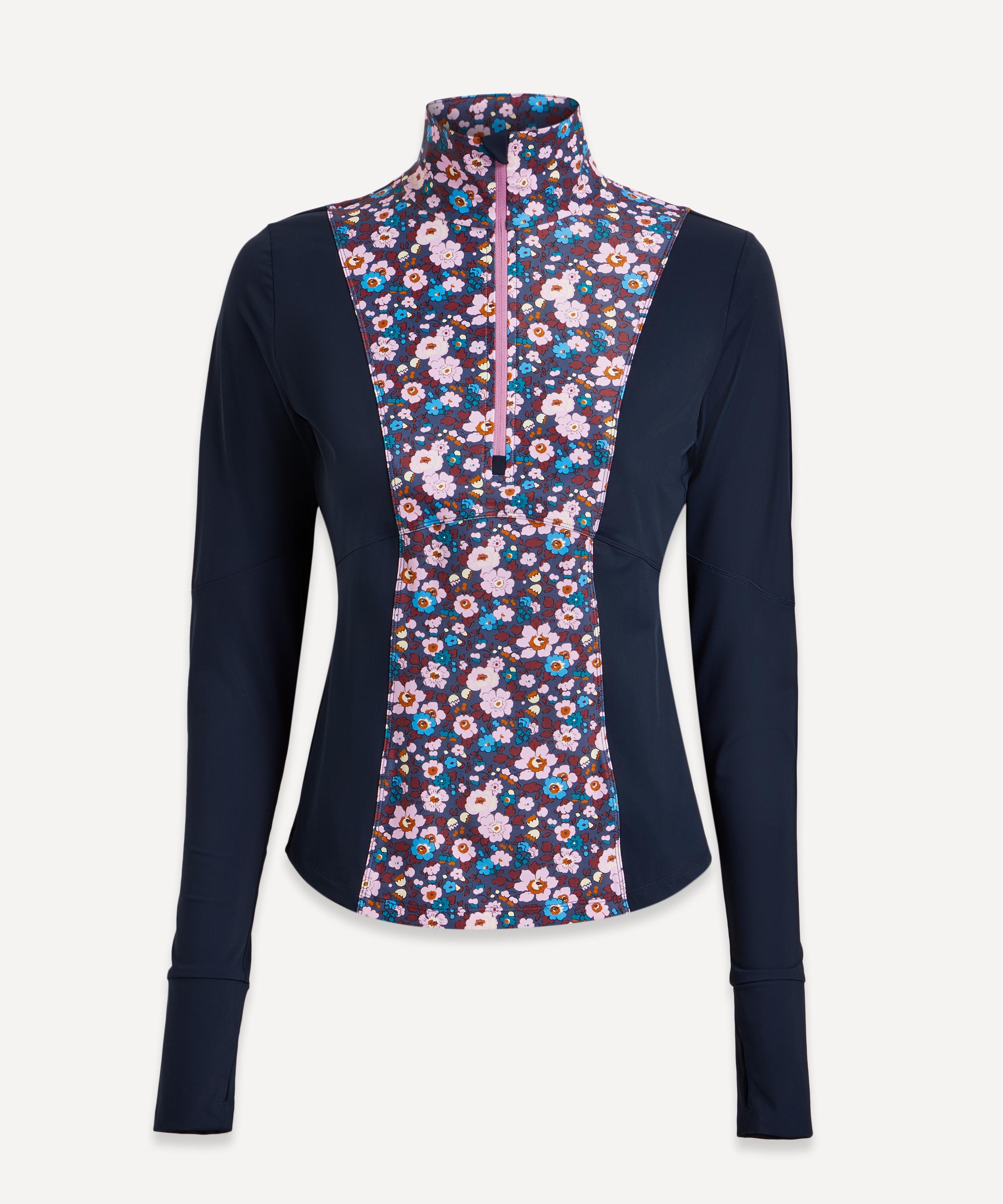 Smooth, compact and silhouette-shaping with a matte touch finish, this high-performing navy top features a contrasting panel with our classic Betsy print adorned across its front and back. Developed for athletic wear, its form-fitting, long-sleeves are complete with thump holes for ultimate grip. Tailored to a regular fit with a funnel-collar and an adjustable half-zip, its front is finished with two practical side-pockets. This functional and lightweight top provides double the wearability – as a uniform for high-impact classes and sports when teamed with the matching Betsy Panel leggings, or layered under chunky knits paired with jeans while running errands or relaxing at home.