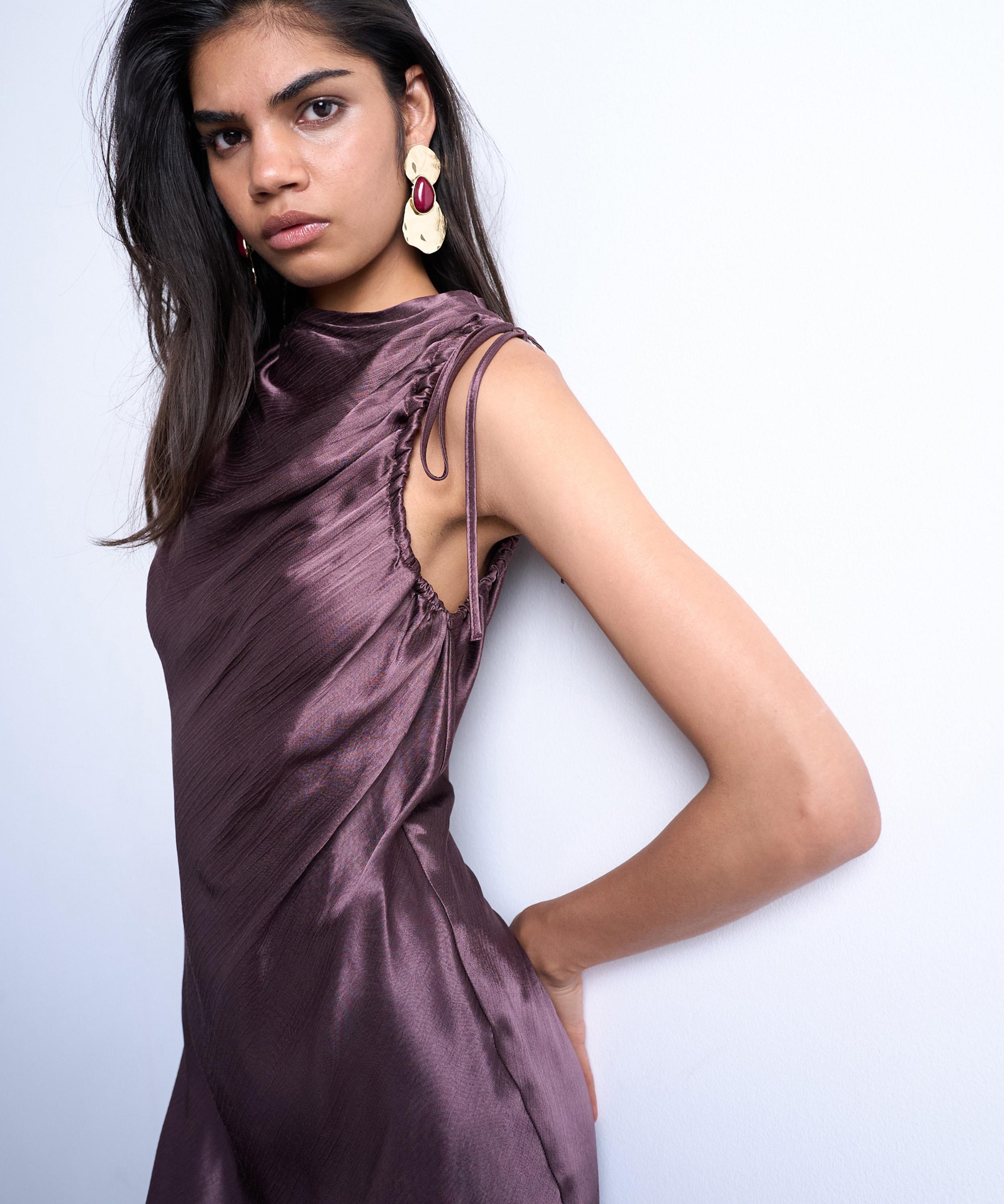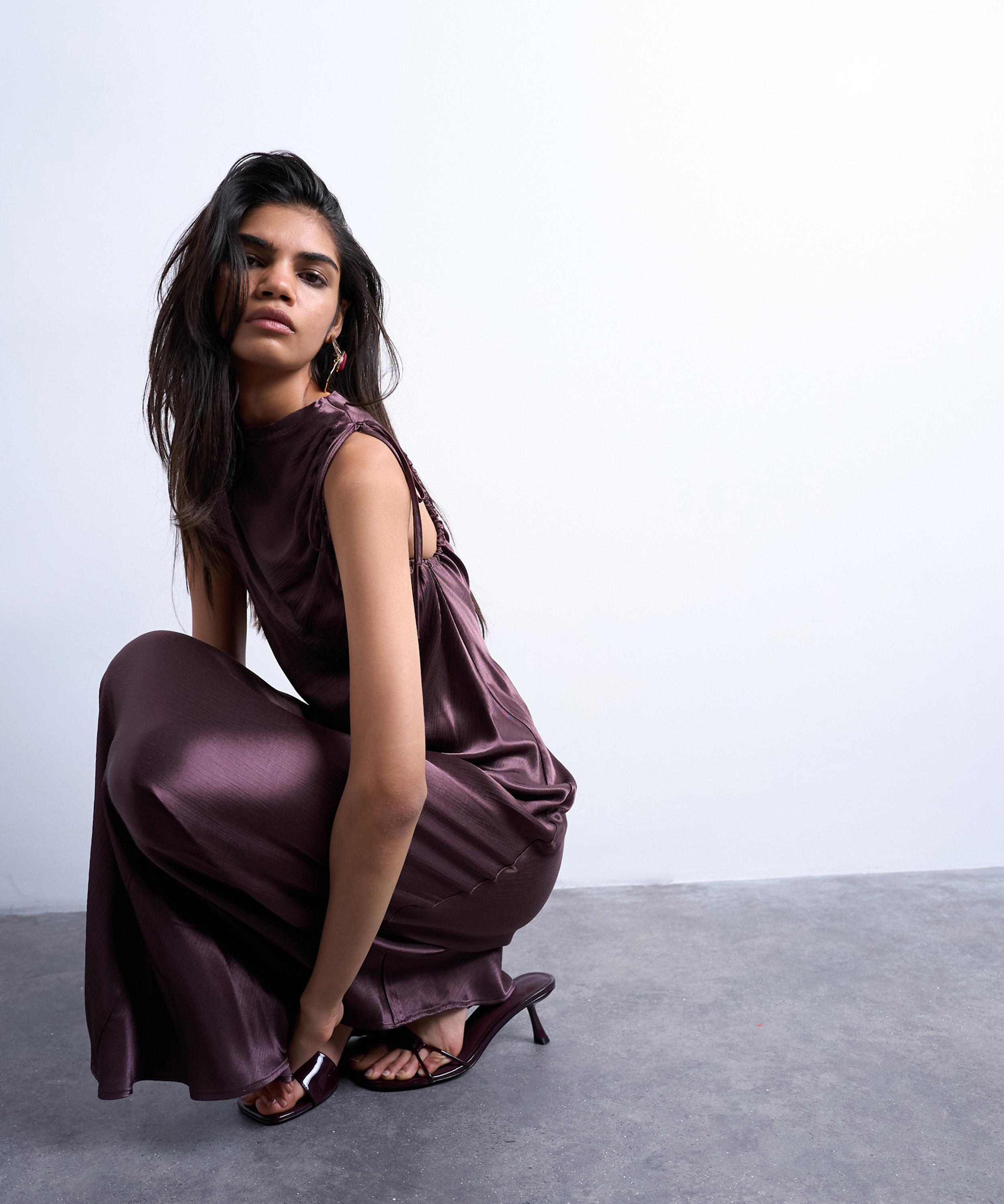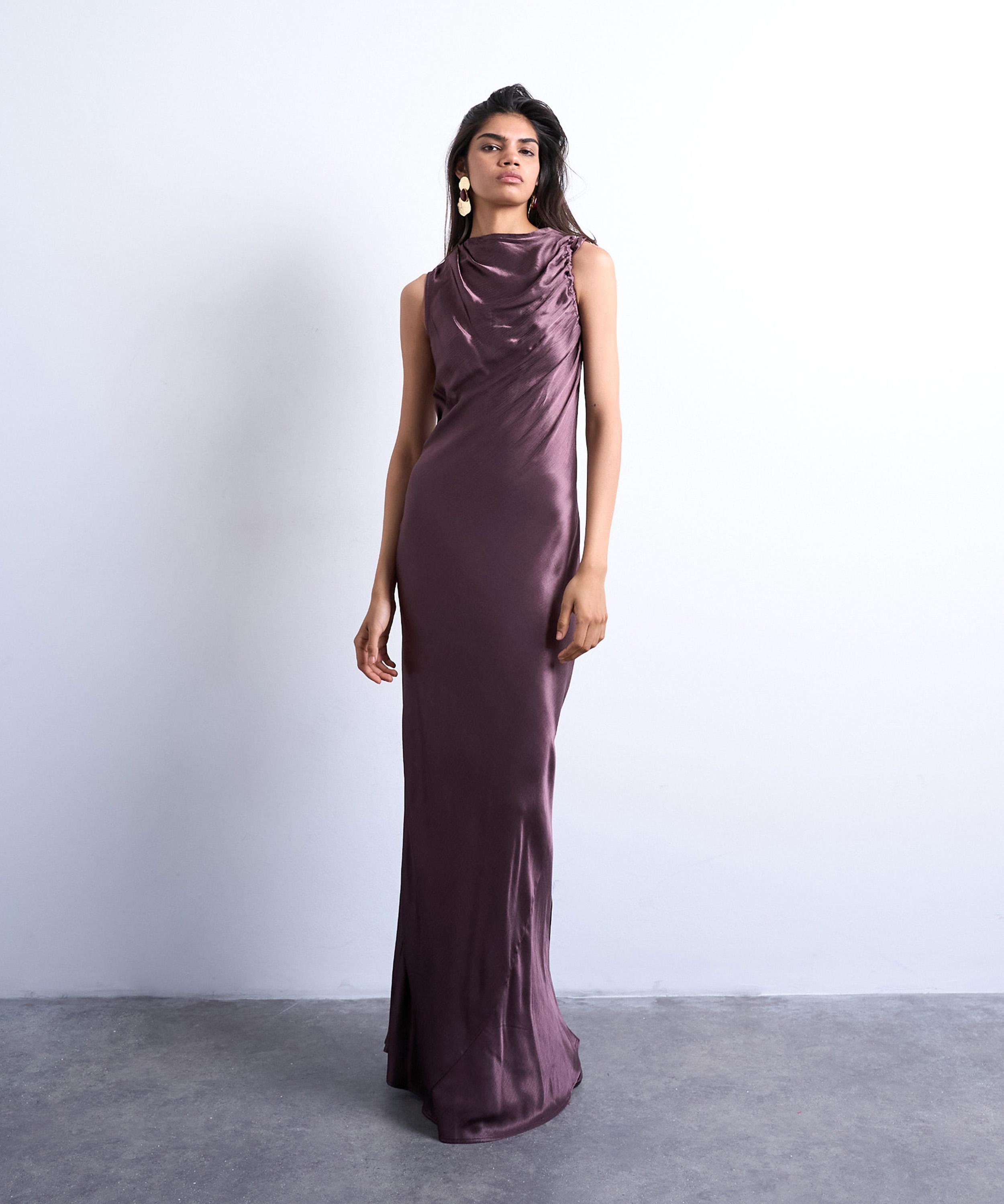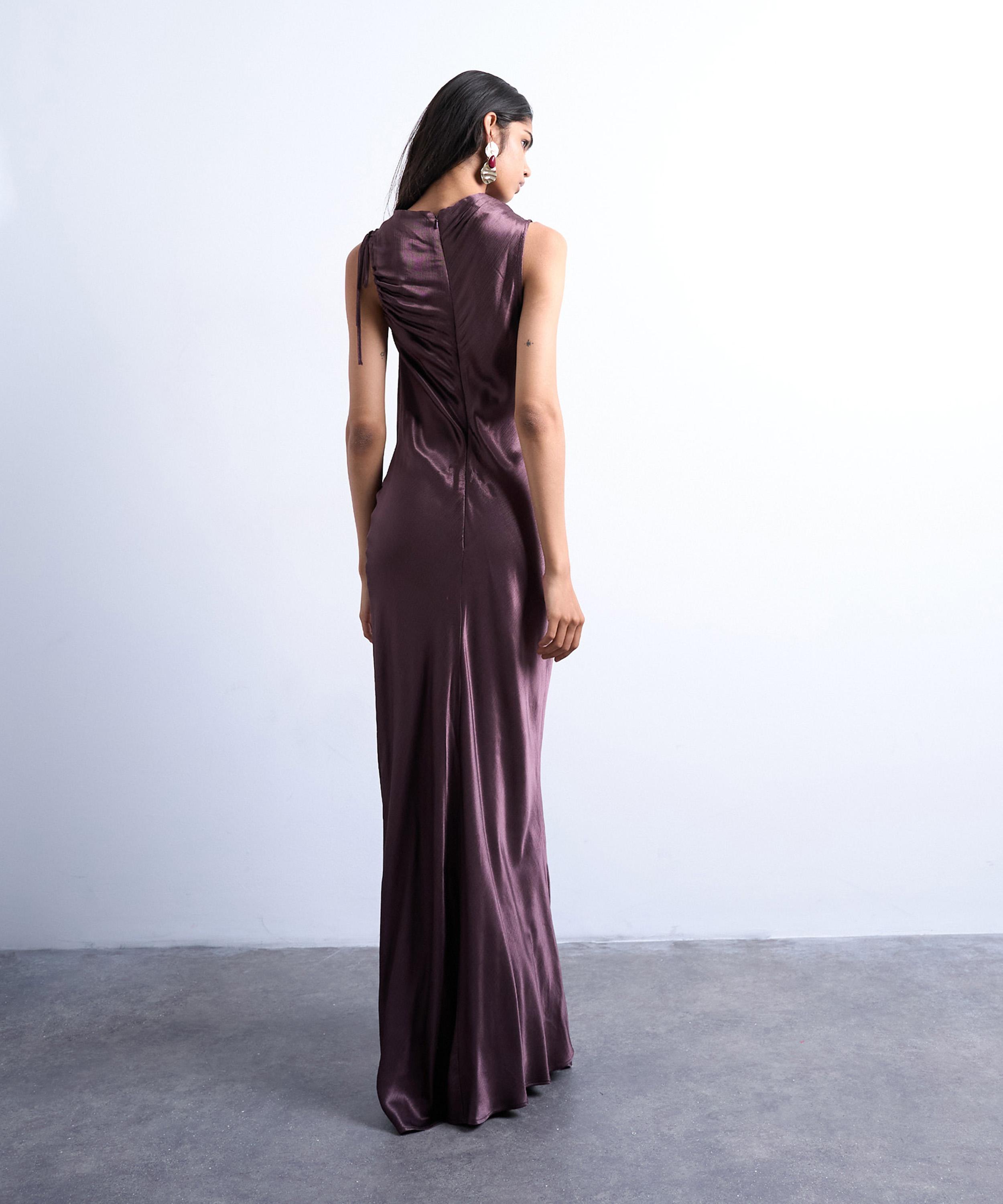 Crafted from a glossy, satin-like fabric, this sleeveless maxi dress features delicate shoulder ties that create a ruched, draped effect along the high neckline. Cut on the bias for a fluid, body-skimming fit, it falls into an elegant, ankle-length silhouette with effortless movement.